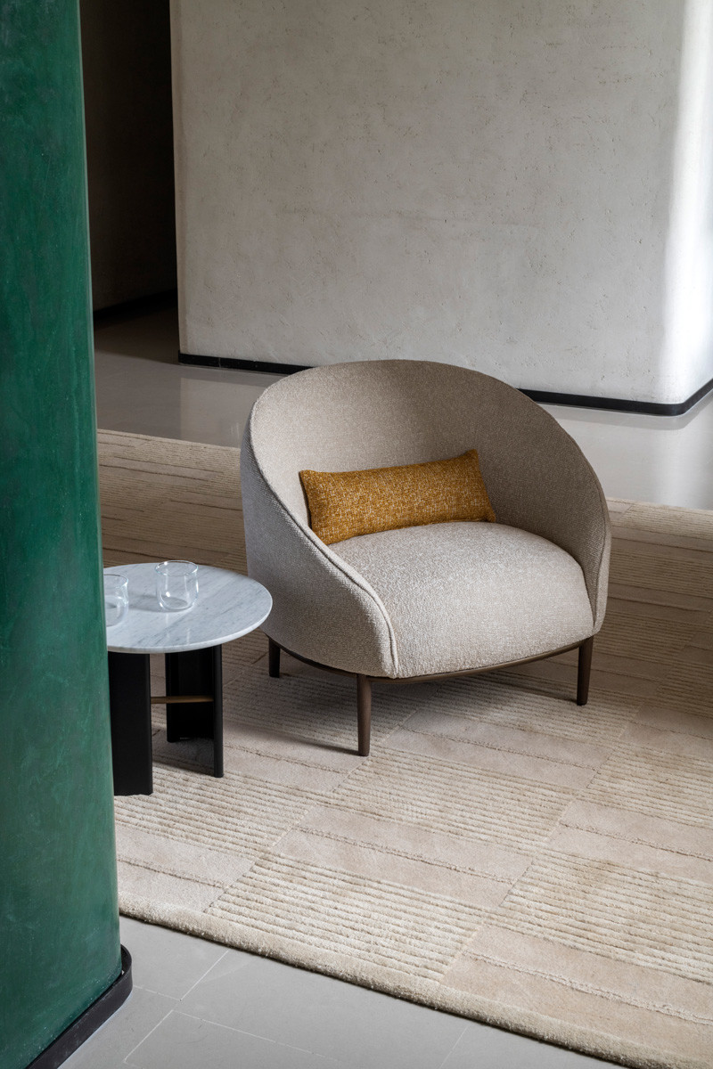 Кресло Potocco Yoisho от Bernhardt & Vella — модель с округлым силуэтом и глубоким сиденьем. Спинка плавно переходит в подлокотники. Тонкие ножки и кольцевое основание. Контурная строчка подчеркивает форму. Мягкие линии и компактные пропорции.