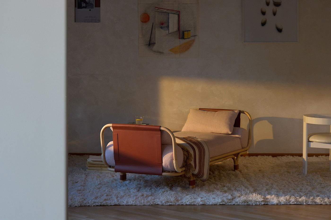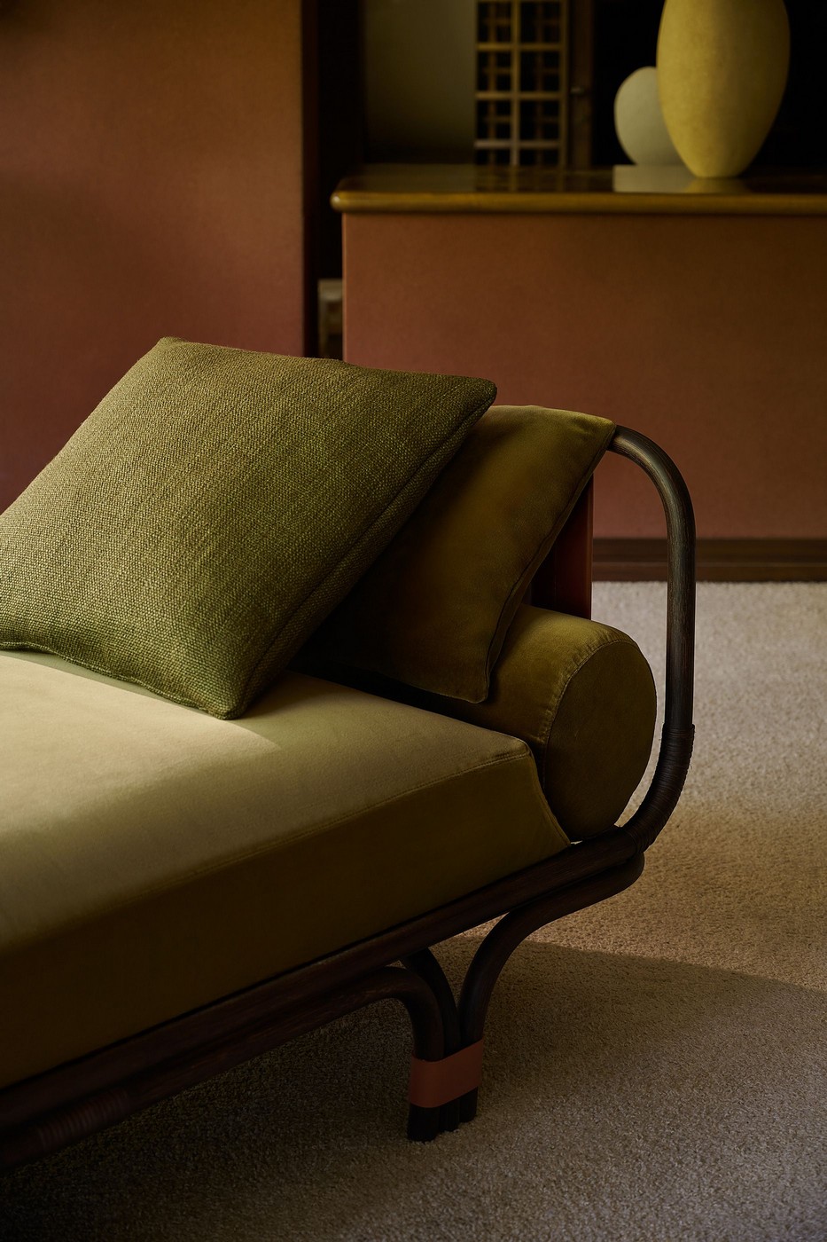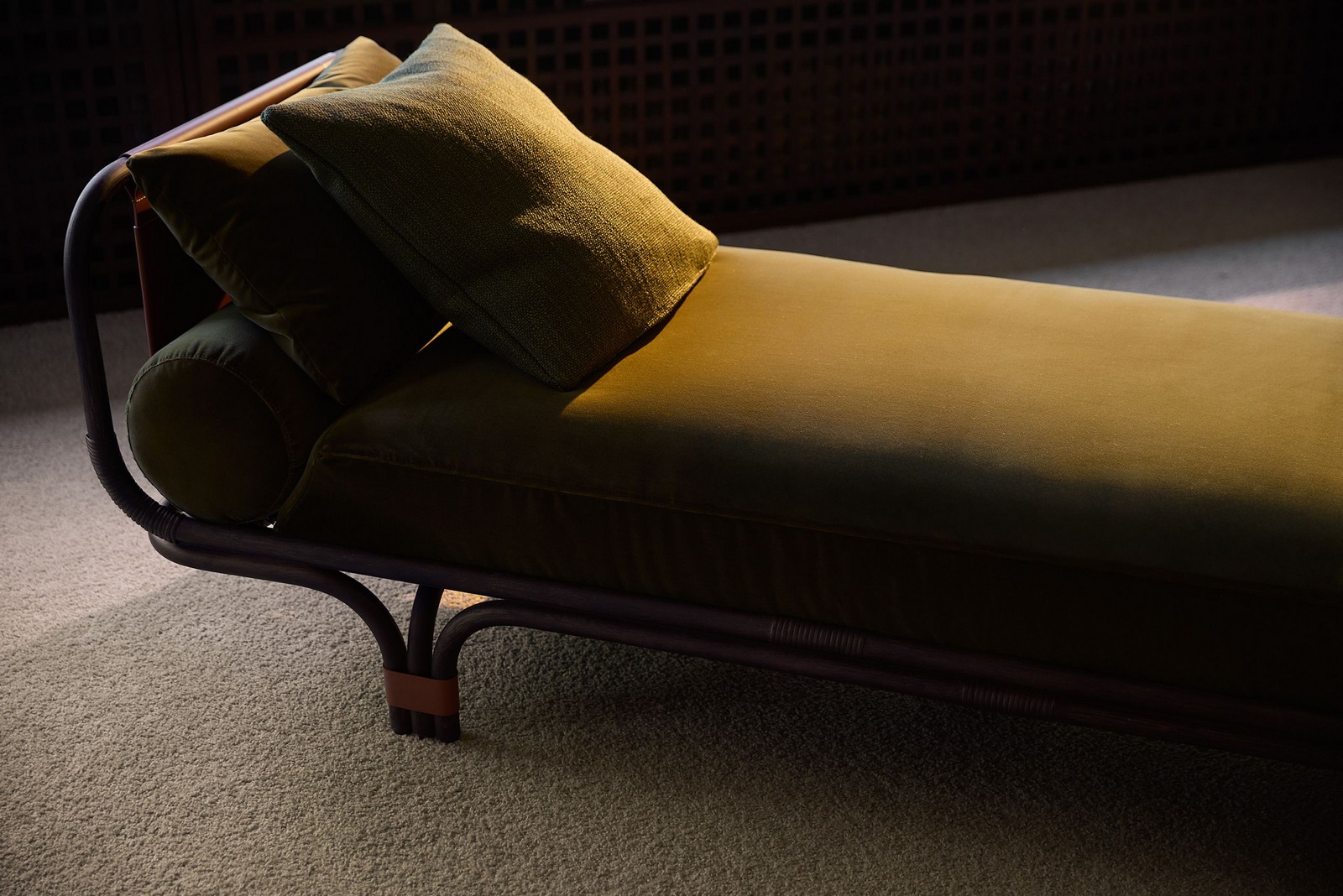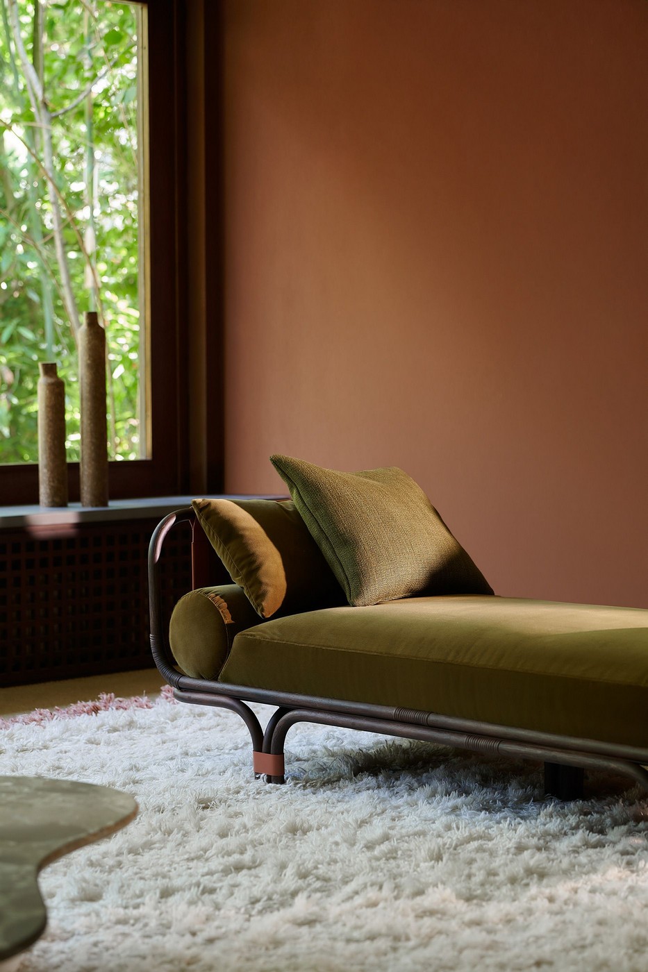 Кушетка Tacchini Isola Bella от Studiopepe — построена на сочетании пропорций: высокие ножки и массивный верх. Сиденье с боковинами образует единую линию. Конструкция прочная и воздушная.