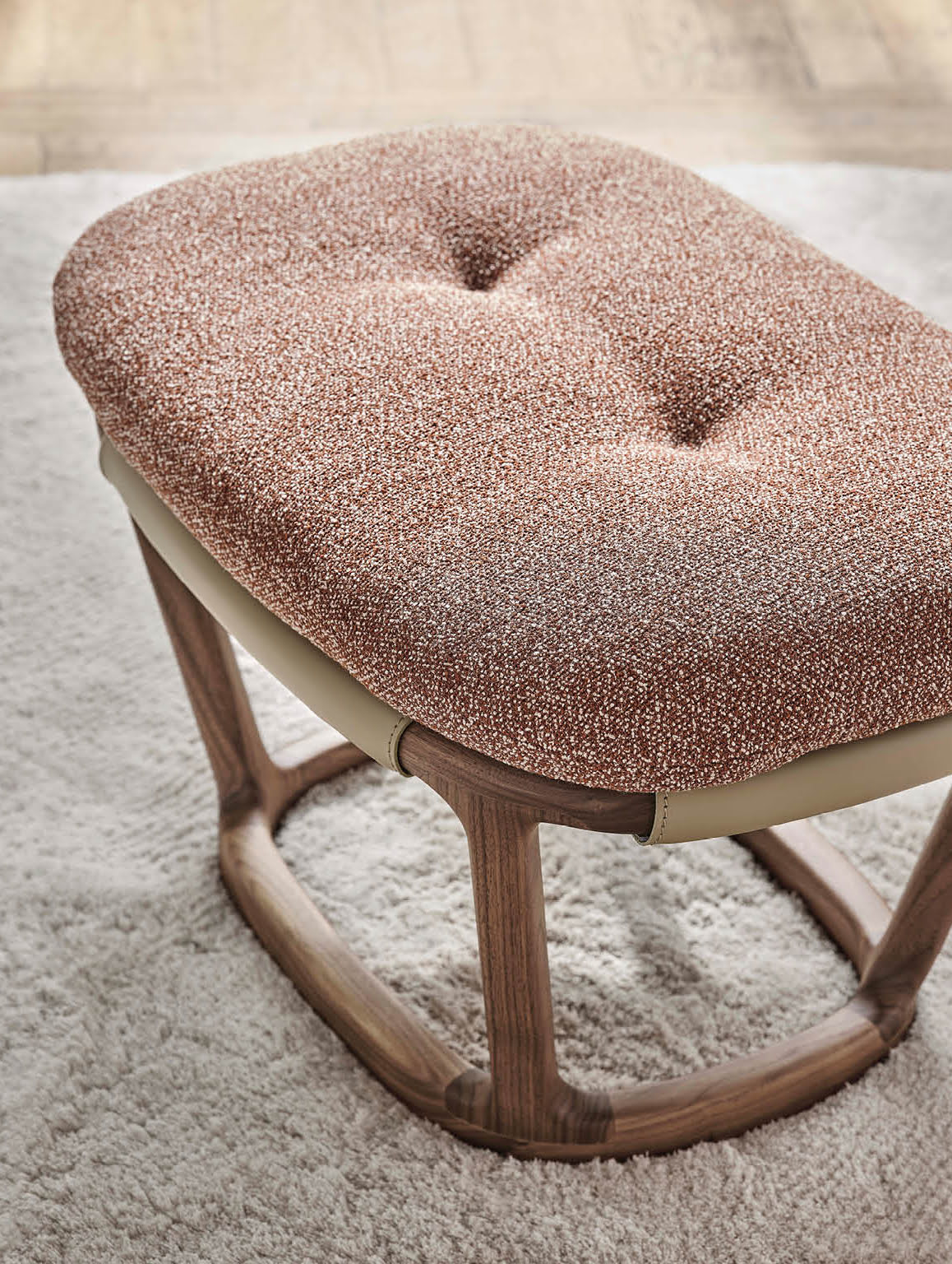 Пуф Porada Amarantha доступен в разных цветах дерева, кожи и текстиля. За подробным расчетом необходимой конфигурации в нужной отделке, пожалуйста, обращайтесь к менеджерам.