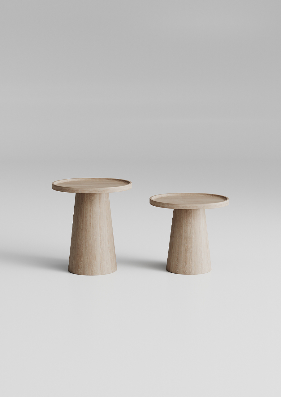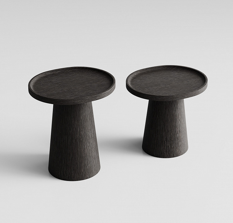 Кофейный столик с круглой столешницей, дополненной аккуратным бортиком, и основанием в форме трапециевидного цилиндра. Лаконичная конструкция подчёркивает естественную красоту древесины — её рельефную текстуру и сложные, насыщенные оттенки. Благодаря сочетанию простой формы и выразительного материала, столик становится универсальным элементом интерьера.