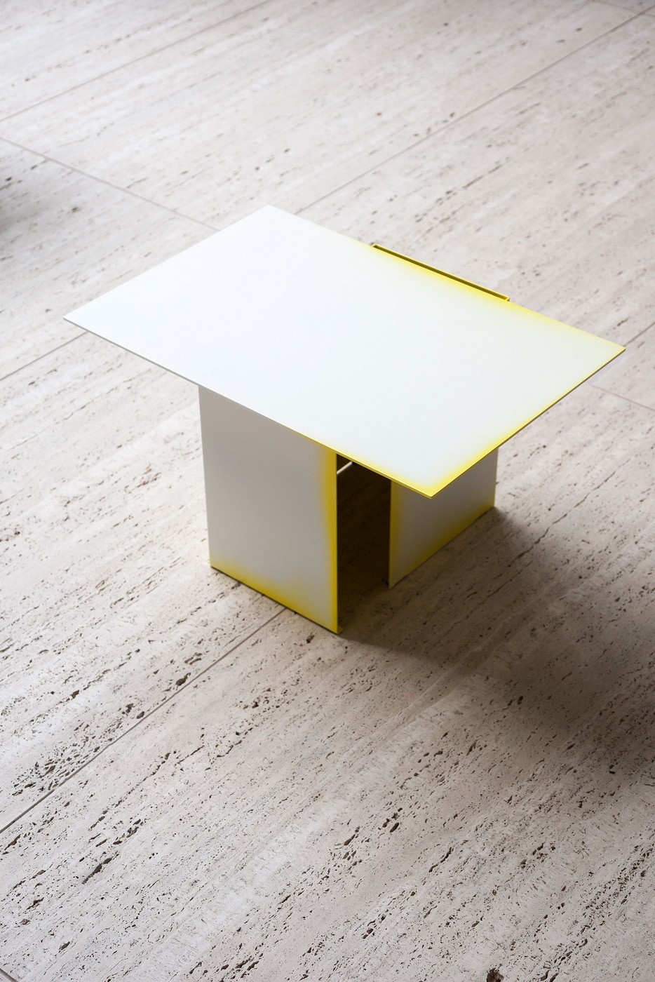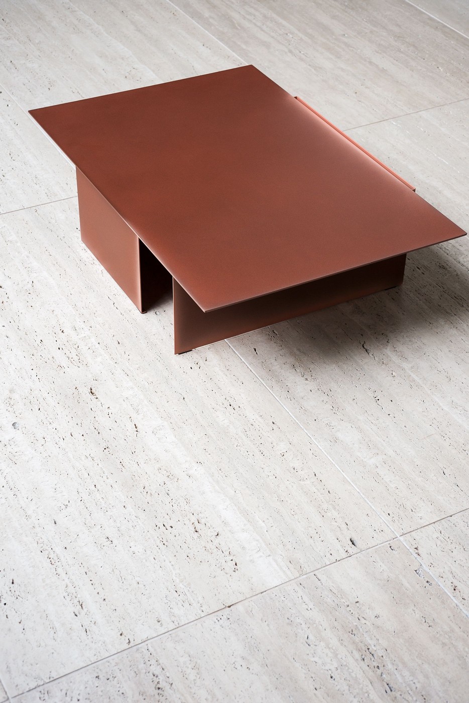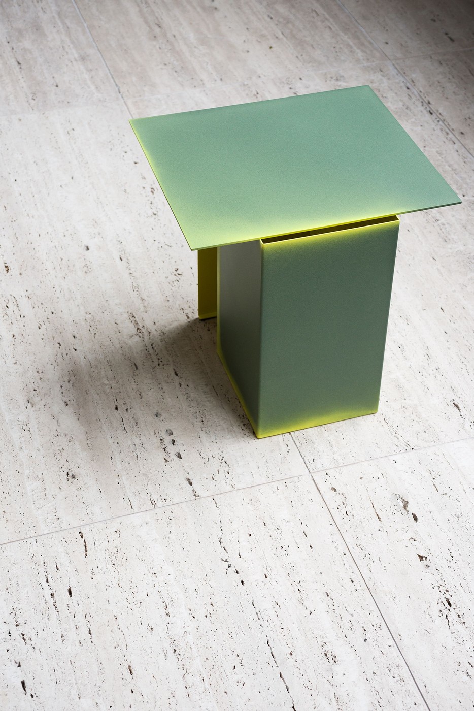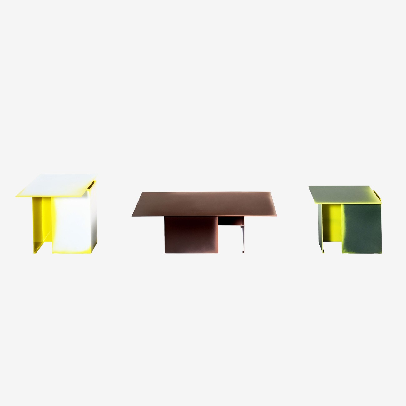 Журнальный столик Tacchini Daze от Truly Truly — брутальная модель из металла с градиентной окраской элементов. Столешница квадратной или прямоугольной формы на массивных боковых панелях. Внутренние поверхности выделены контрастным цветом.