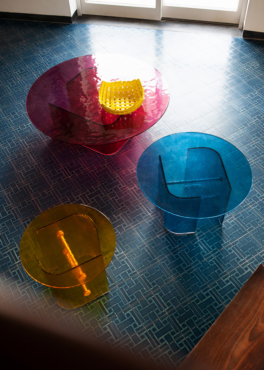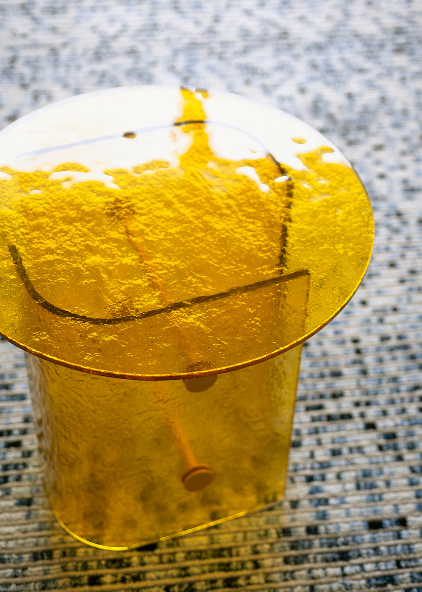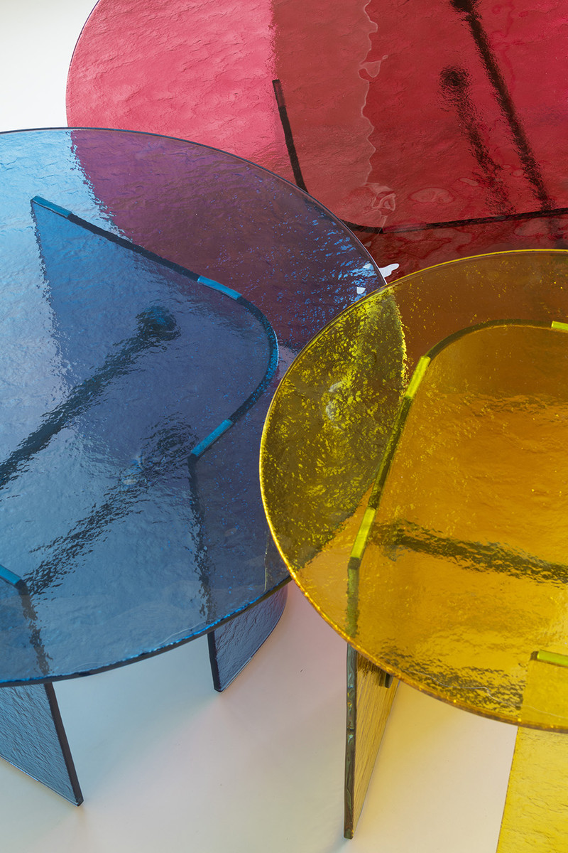 Материал: цветное стекло с рельефной поверхностью. Цвета: Honey, Cherry, Blueberry. Соединение: темные цилиндрические фиксаторы.