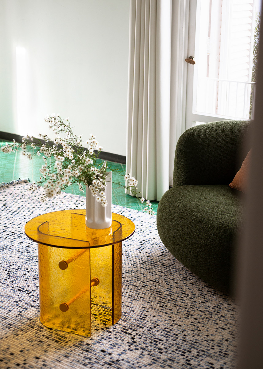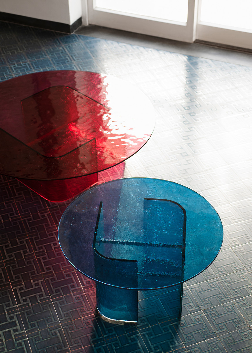 Журнальный столик Potocco Double L Glaze от Chiara Andreatti — модель из цельного цветного стекла. Столешница круглая, с волнообразной фактурой поверхности. Основание из двух изогнутых изогнутых пластин. Фиксаторы добавляют технический акцент. Профиль столика динамичный.