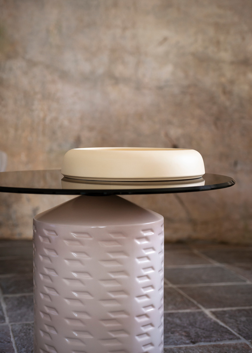 Журнальный столик Potocco Hishi от Chiara Andreatti — модель с массивной керамической ножкой, украшенной рельефным узором. Столешница выполнена из бронзового стекла круглой или квадратной формы. Силуэт строгий и лаконичный. Доступен в двух вариантах высоты.