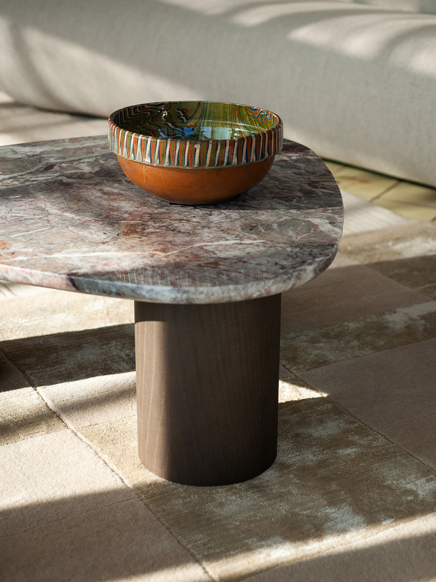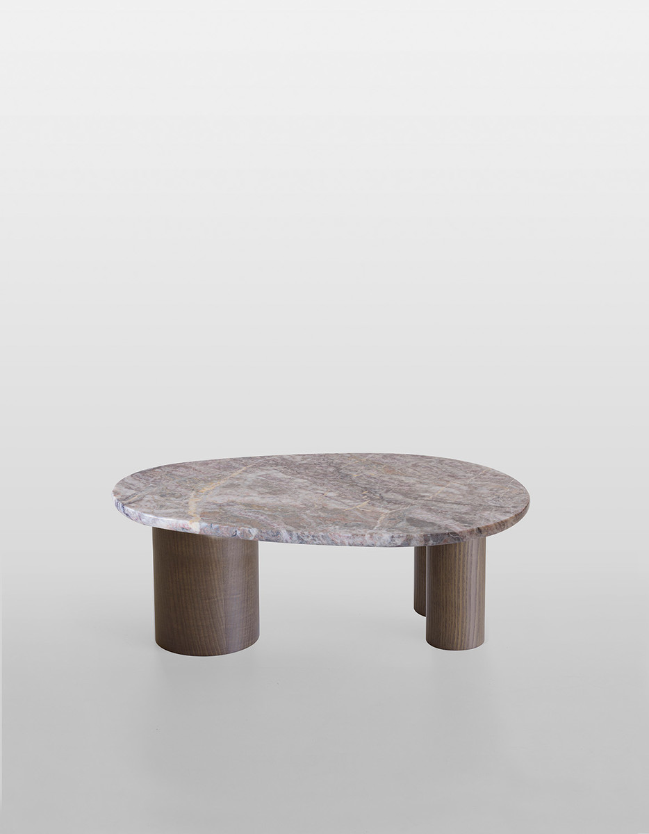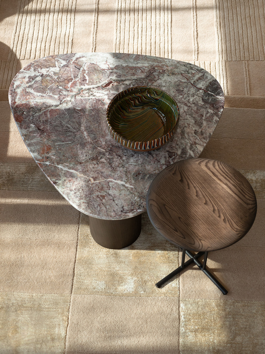 Журнальный столик Potocco Jade от Hanne Willmann — модель с плавными очертаниями из коллекции Jade. Столешница неправильной формы из стекла или мрамора. Основание состоит из трех массивных цилиндрических ножек. Ножки расставлены асимметрично, создавая устойчивую опору. Каждый столик имеет уникальный рельеф поверхности.