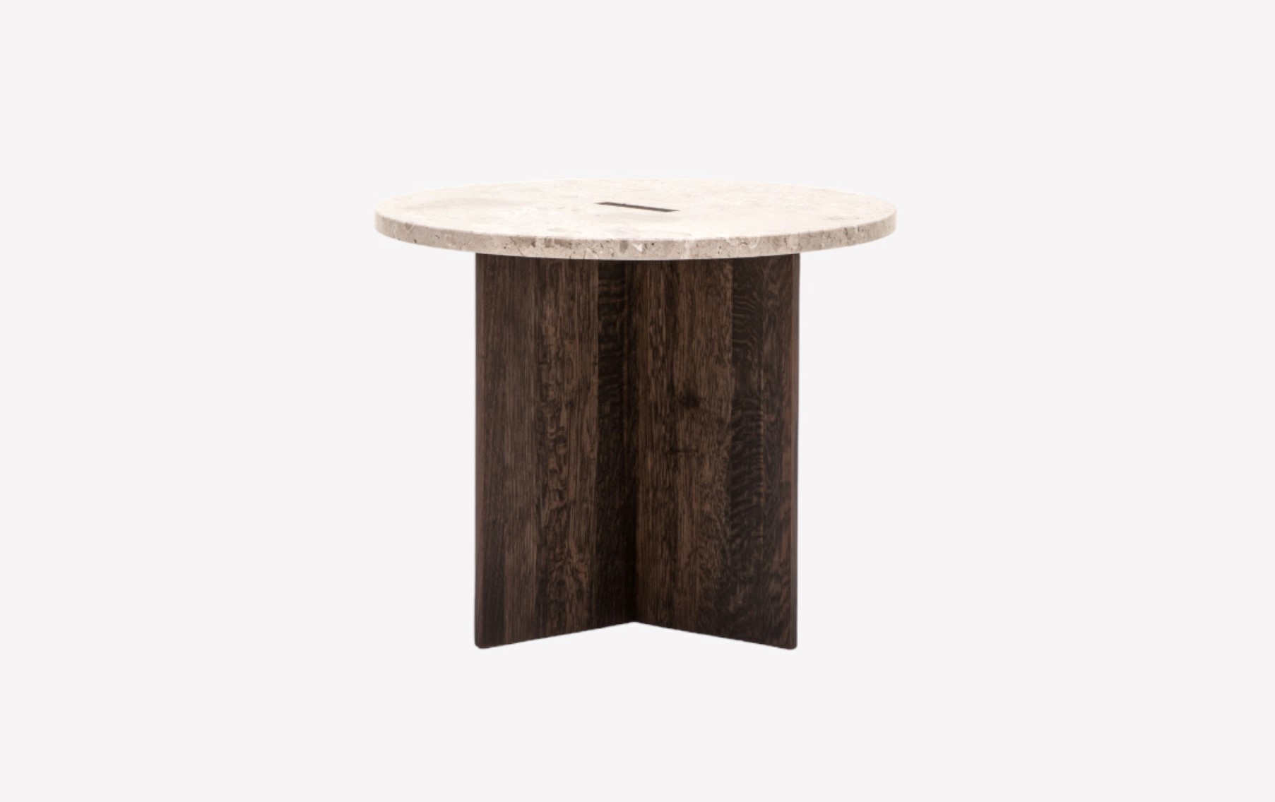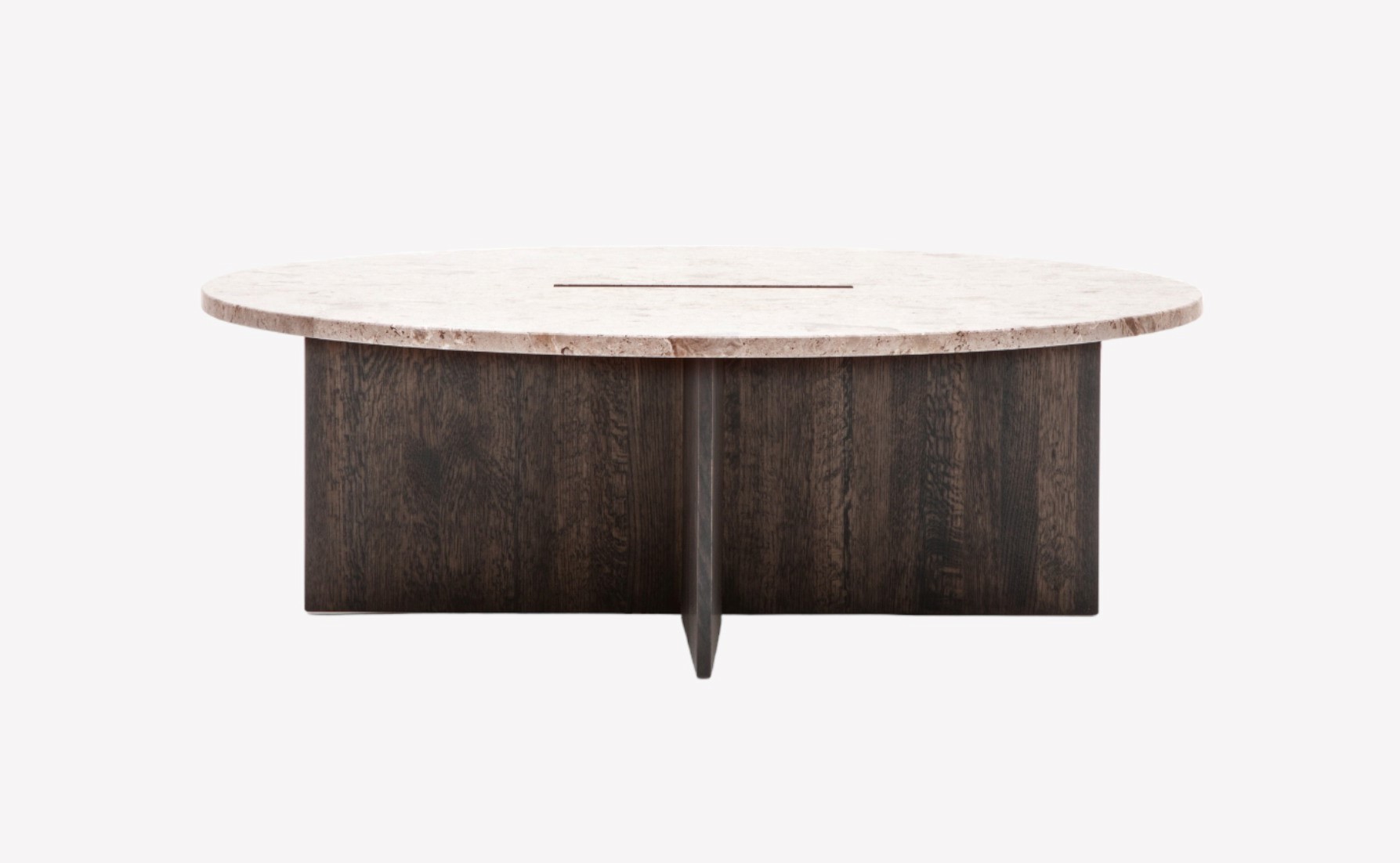 Основа журнального столика N-ST01 выполнена из дуба в оттенке Smoked Oak. Также она доступна в оттенке Grain Matte Black или без покраски. Материал столешницы — мрамор.
