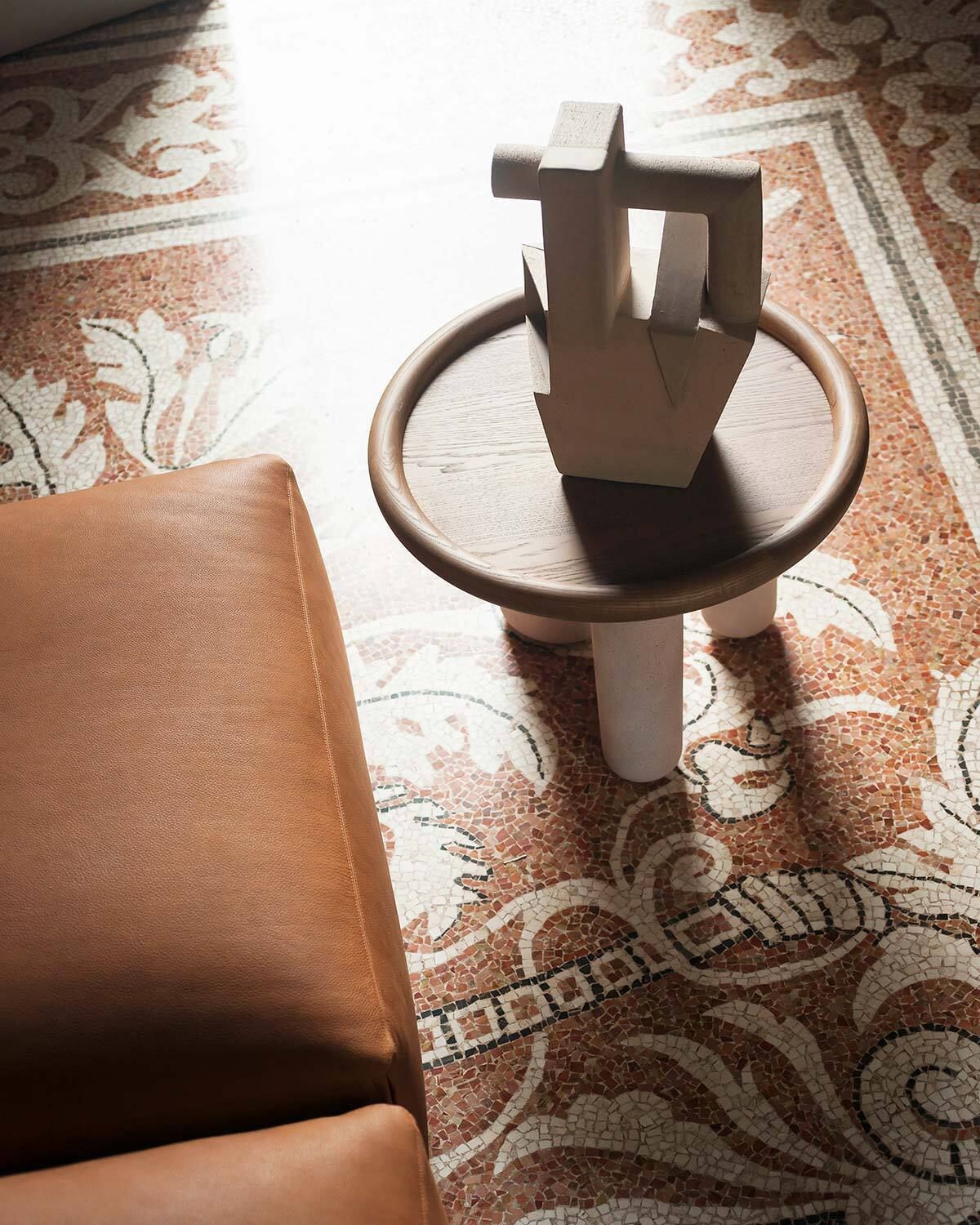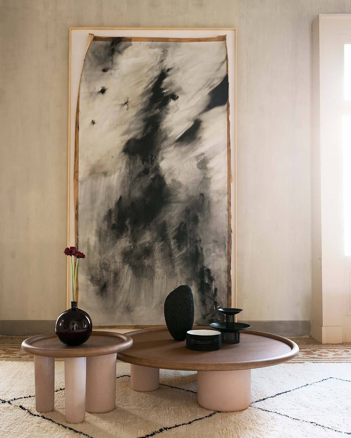 Журнальный столик Tacchini Pluto от Studiopepe со столешницей из массива ясеня на четырёх бетонных основаниях. Массивные опоры цилиндрической формы. Край столешницы образует невысокий бортик.
