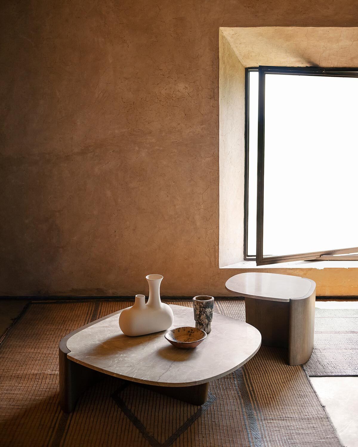 Журнальный столик Tacchini Trampolino от Monica Förster с прямоугольной столешницей и скруглёнными углами. Деревянная опора расположена асимметрично, смещена к одному краю. Основание имеет выраженную текстуру натурального дерева.