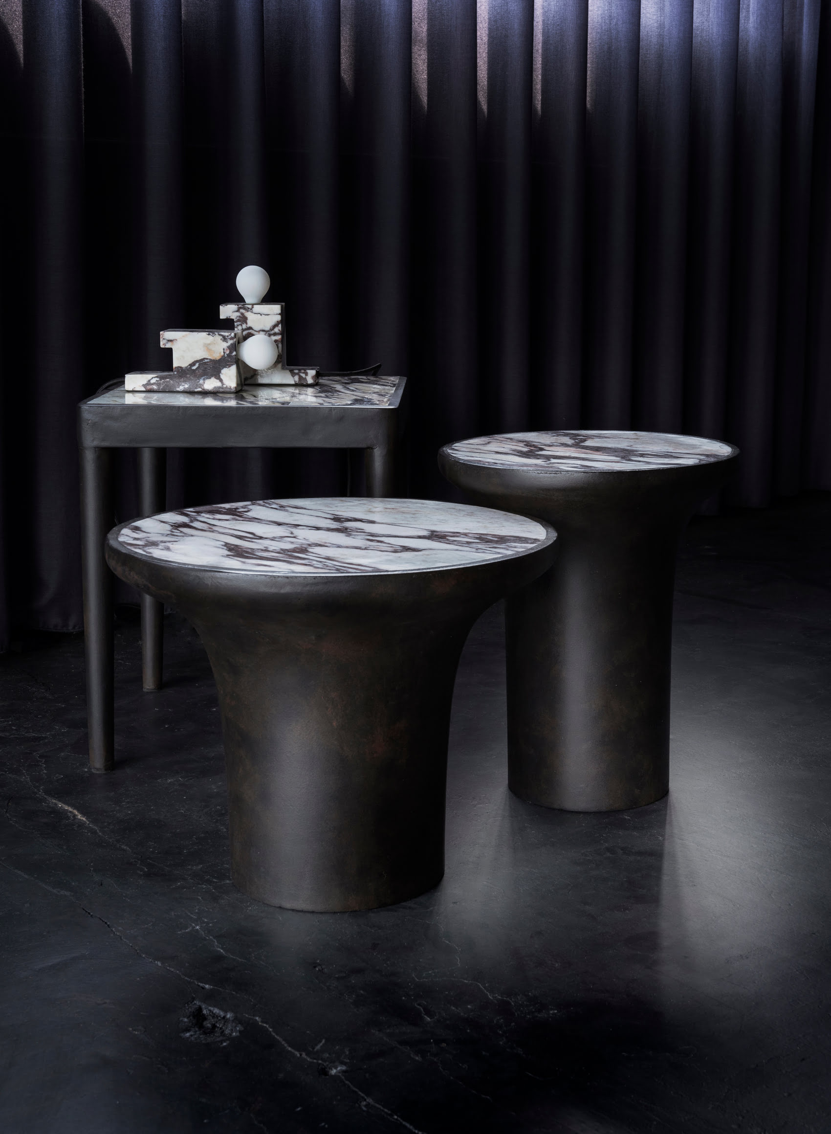 Журнальный столик Trumpet Table Low изготовлен из фибробетона и мрамора.