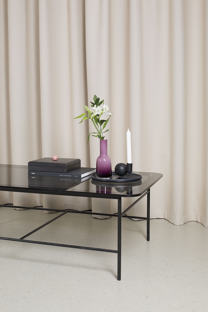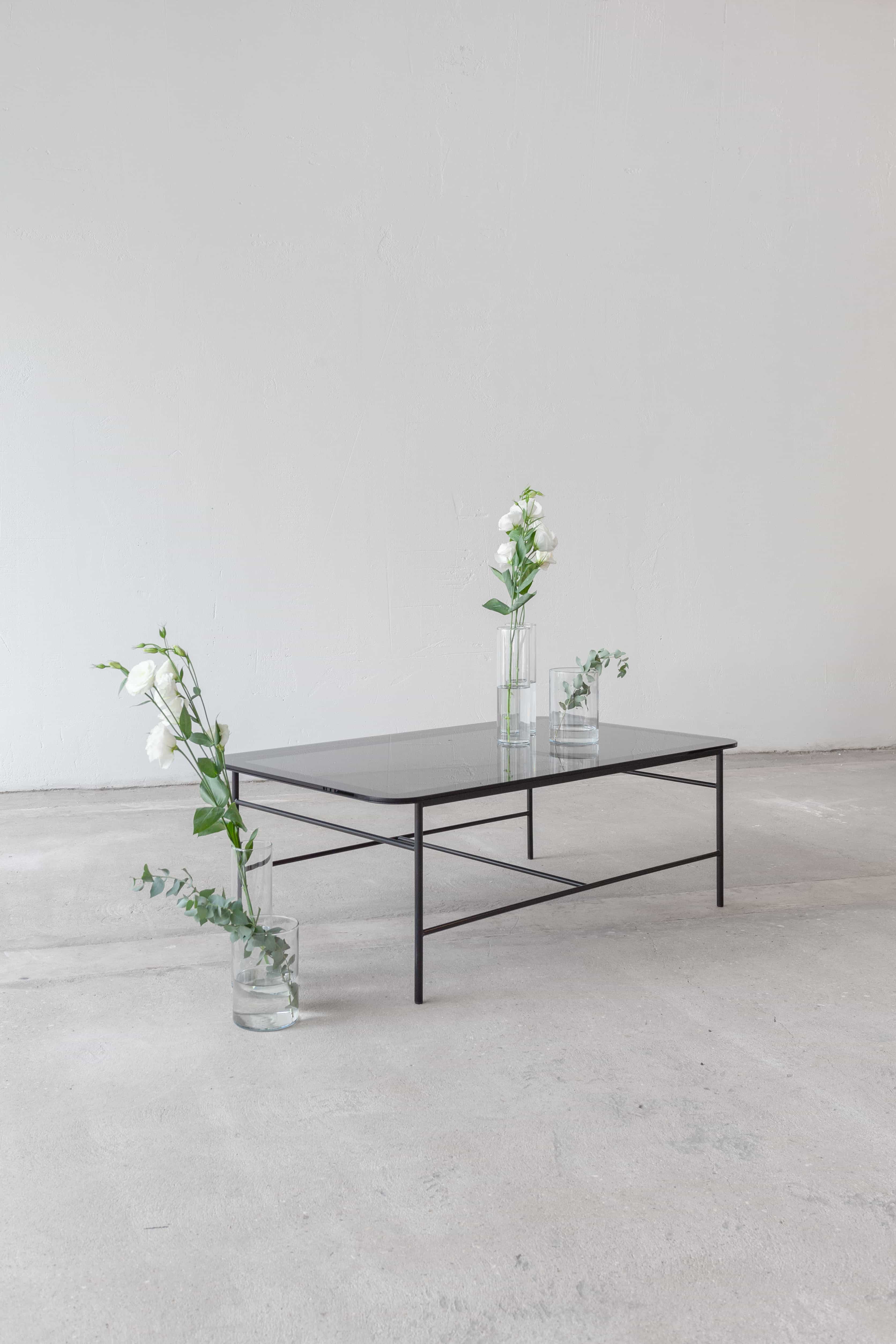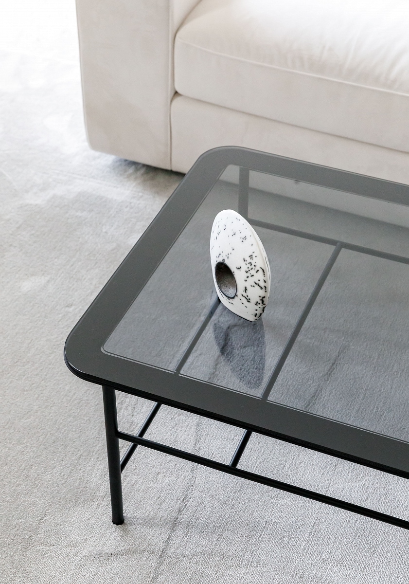 Каркас столика выполнен из стали, столешница может быть выполнена из триплекс стекла (дымчато-серого или сепийного цвета), мрамора или кварцевого камня.