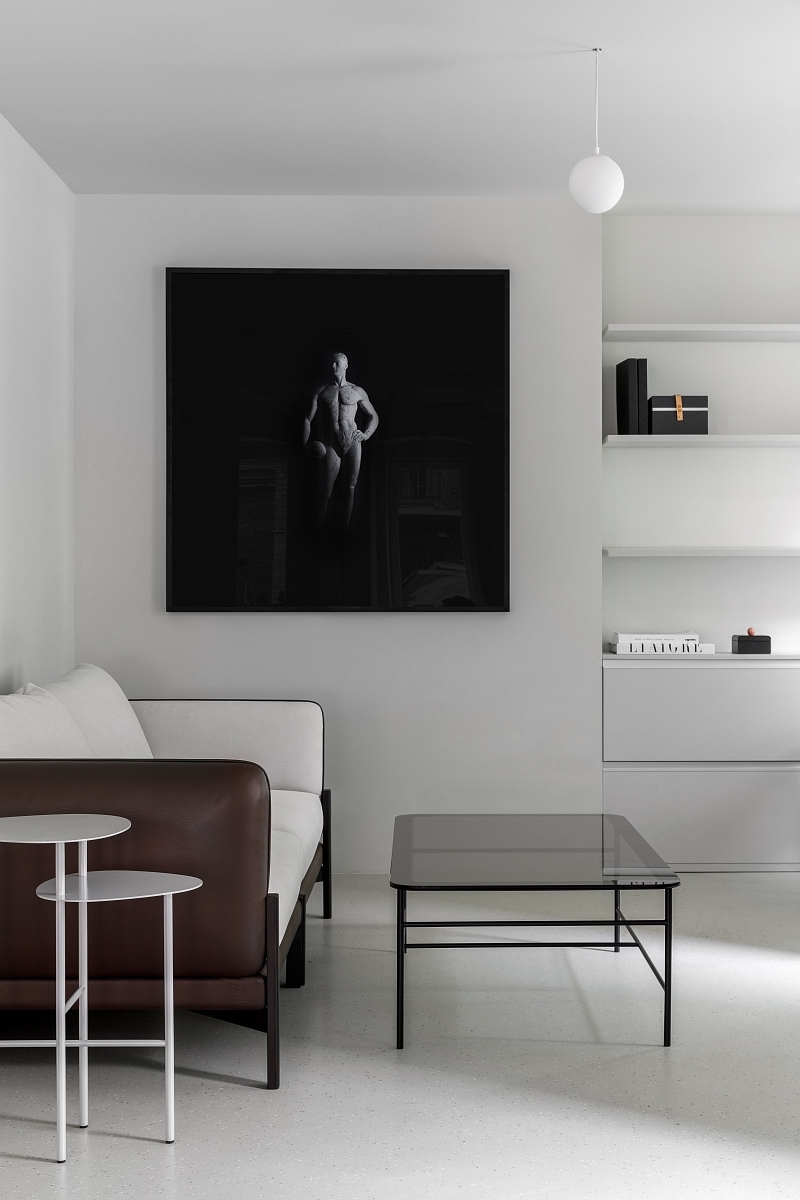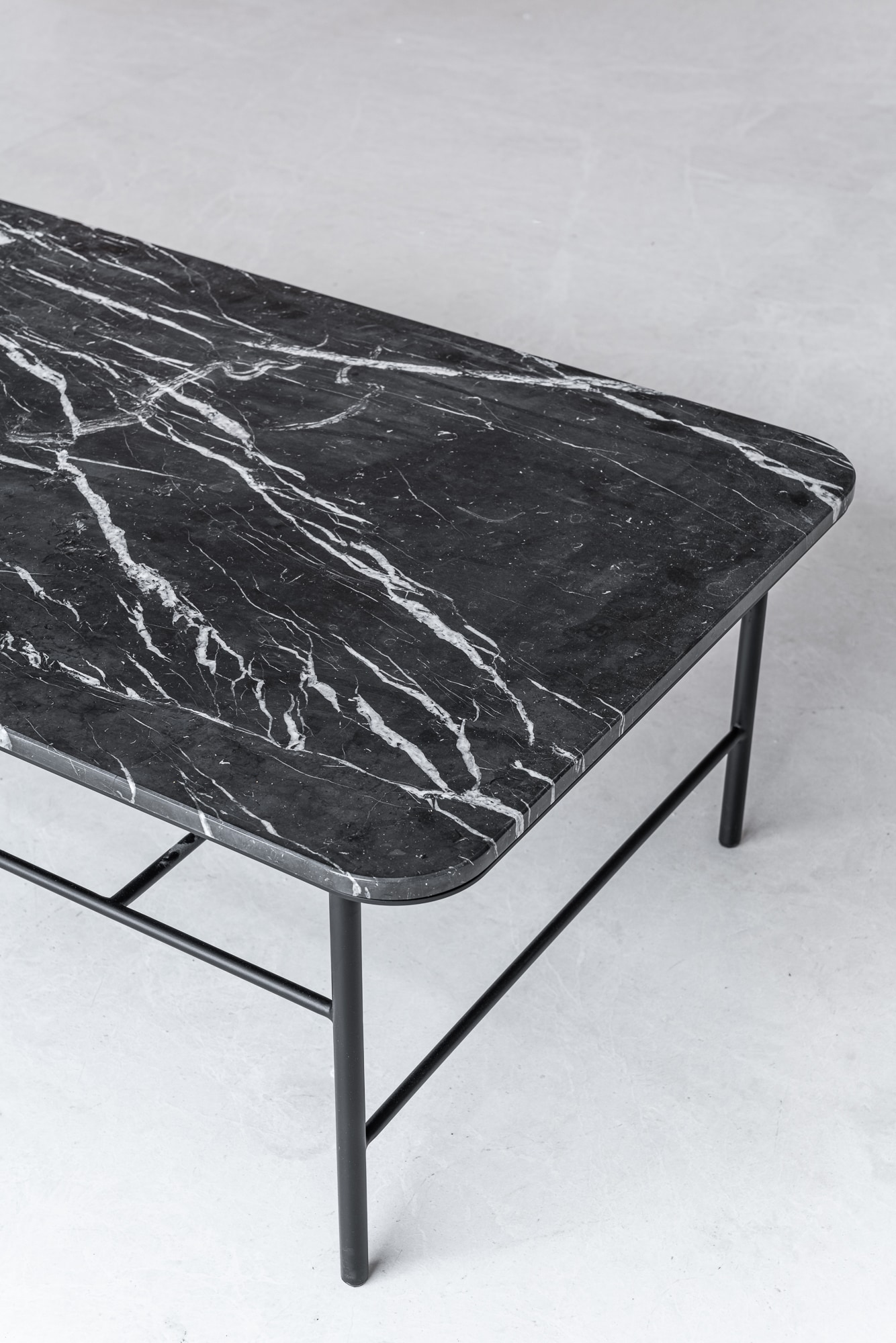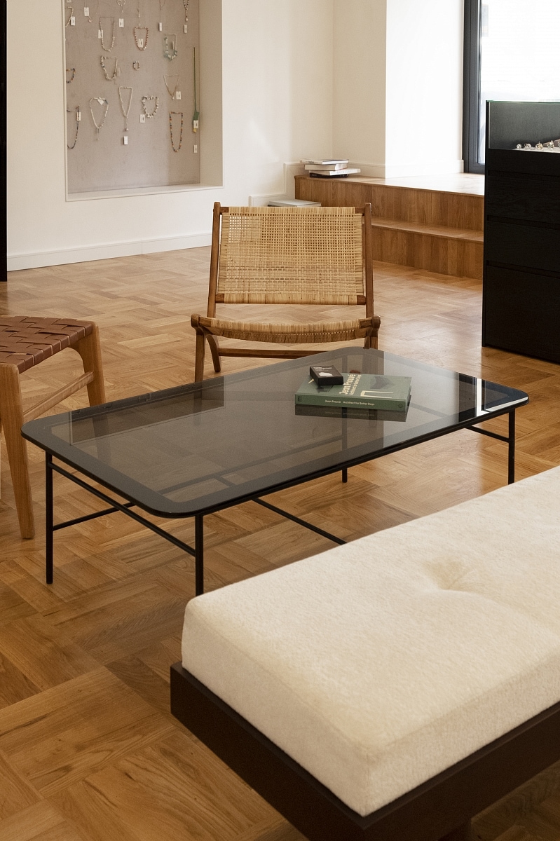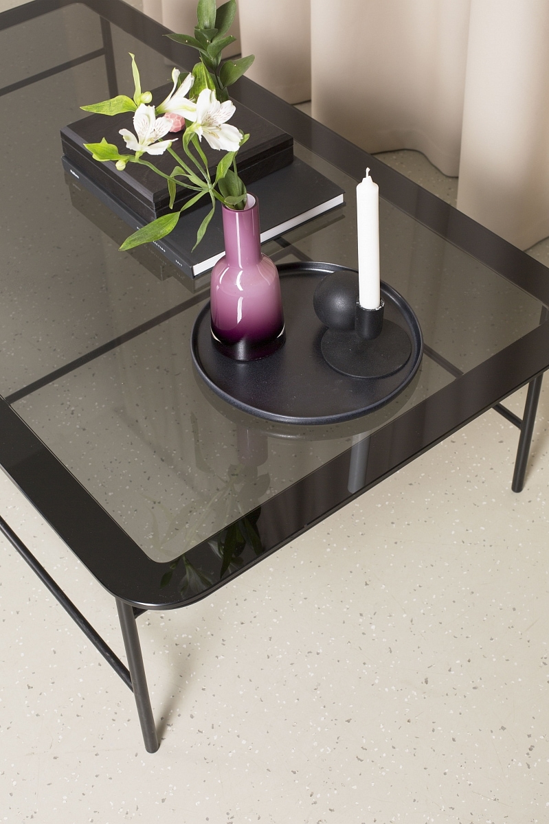 Каркас столика выполнен из стали, столешница может быть выполнена из триплекс стекла (дымчато-серого или сепийного цвета), мрамора или кварцевого камня.