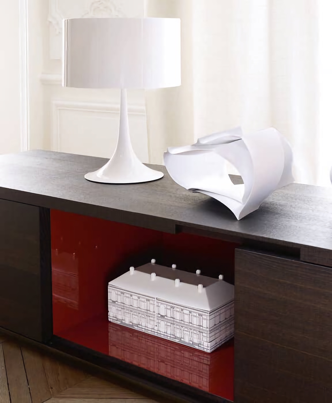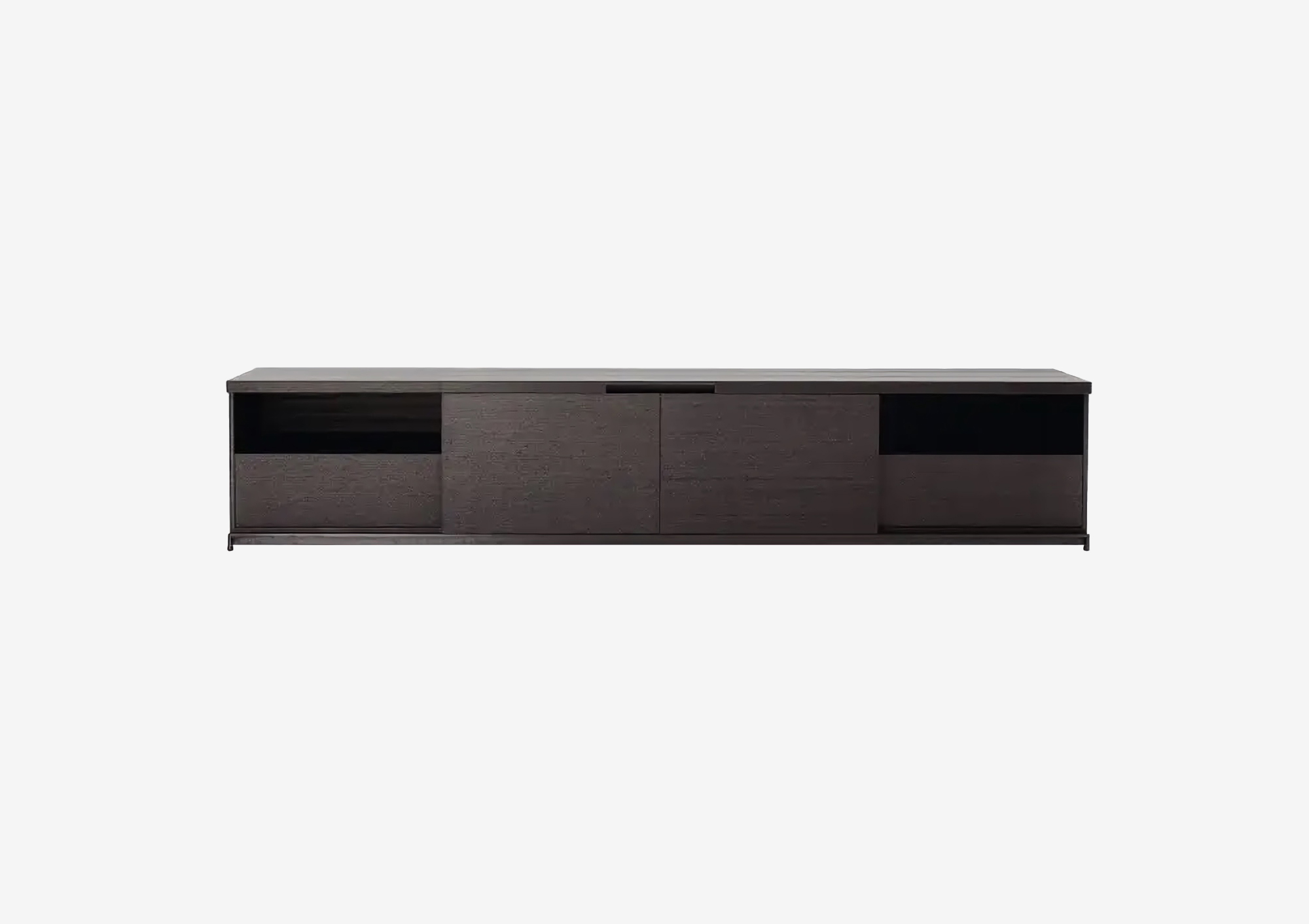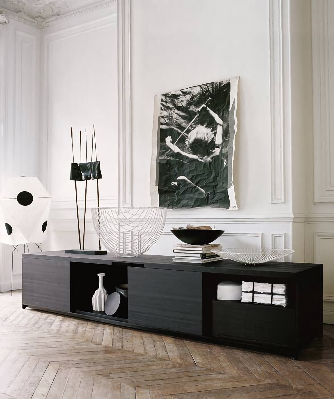 Тумба под ТВ Maxalto Mida создана в том же лаконичном, но изысканном стиле, что и одноимённый буфет. Модель оснащена просторными выдвижными ящиками и открытыми секциями для техники и посуды. Тумба Mida — это строгая геометрия, благородные материалы премиум-класса и продуманная эргономика.