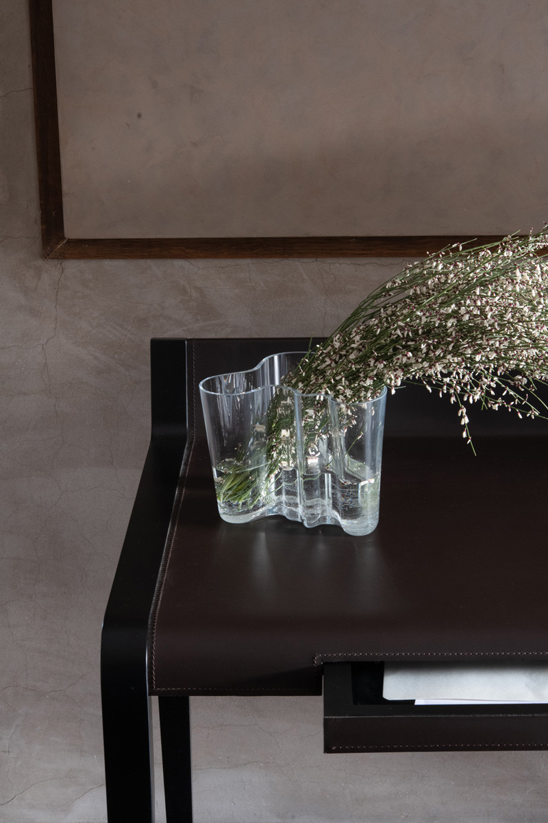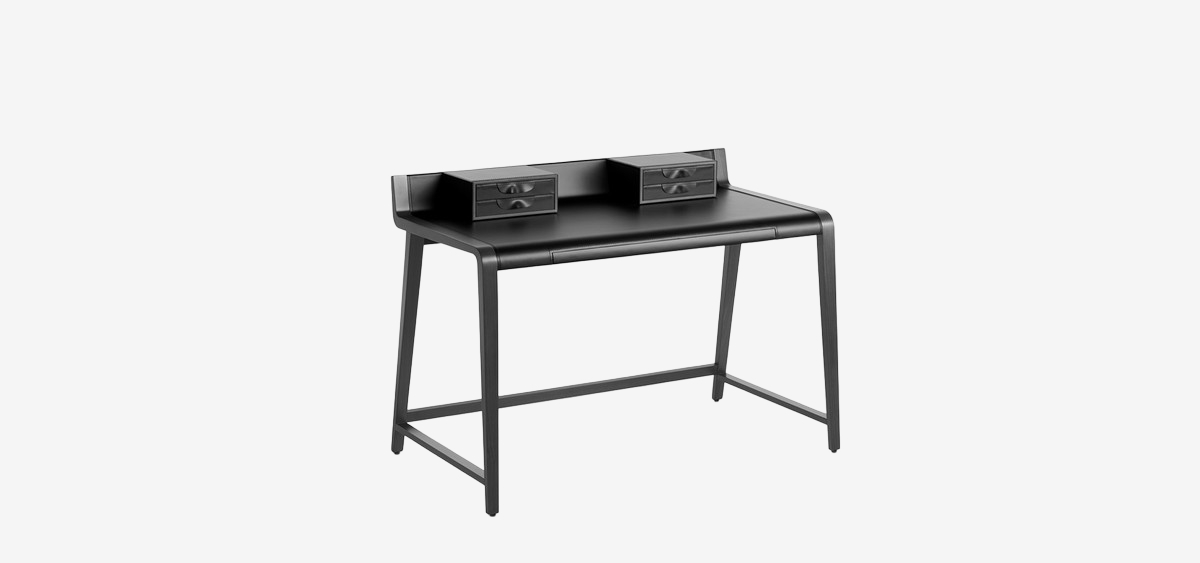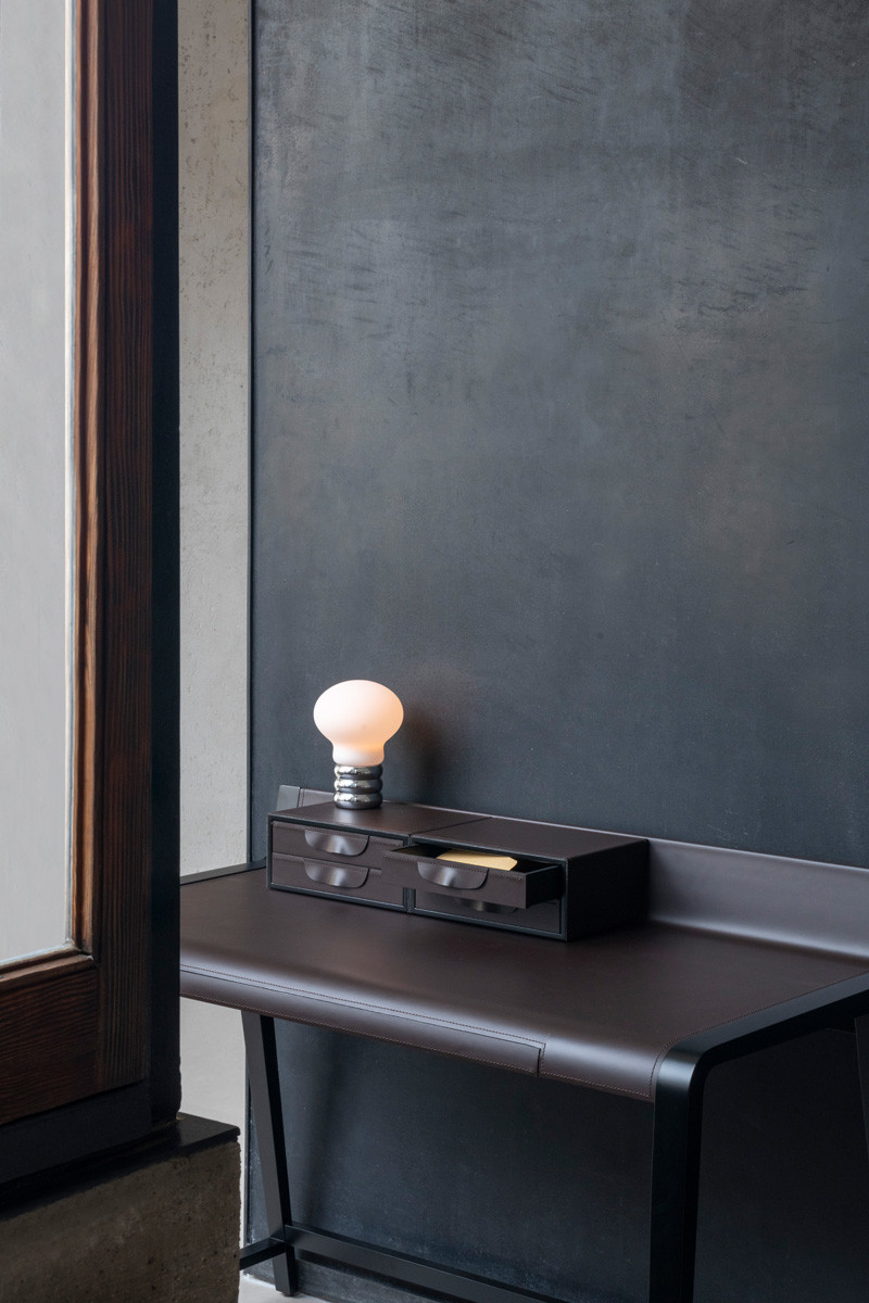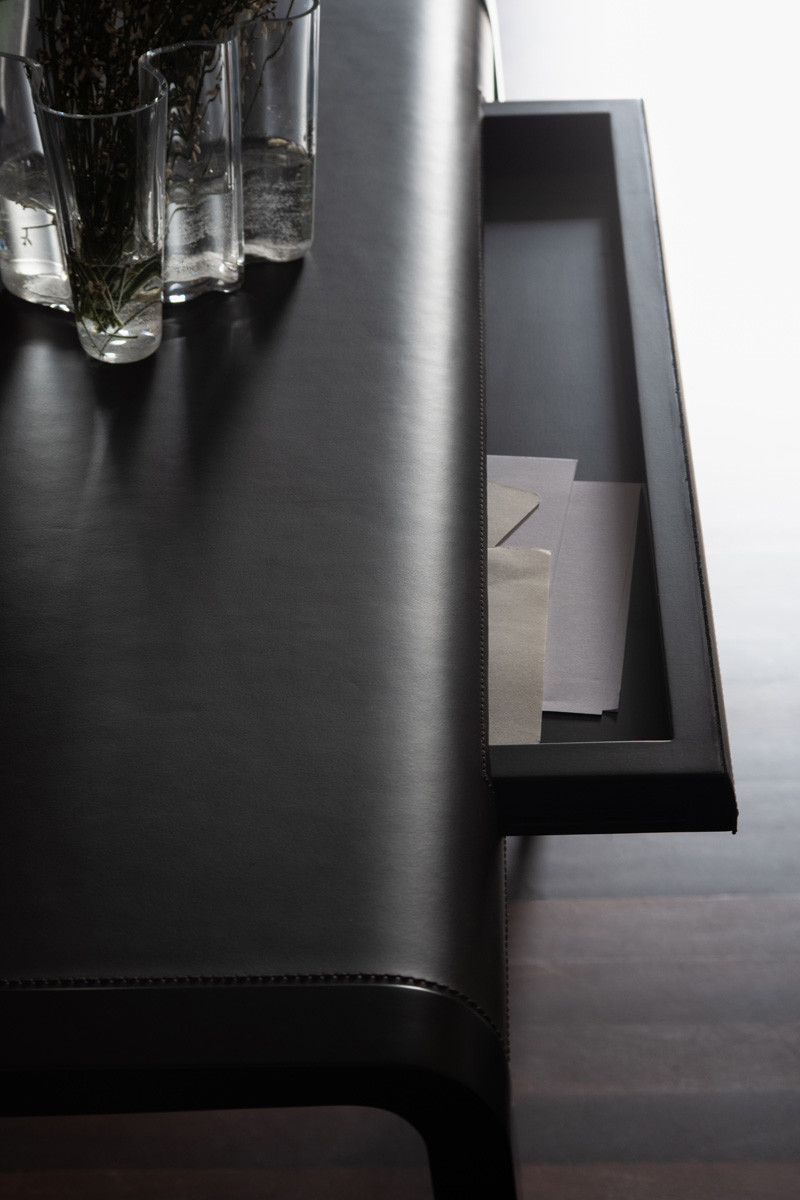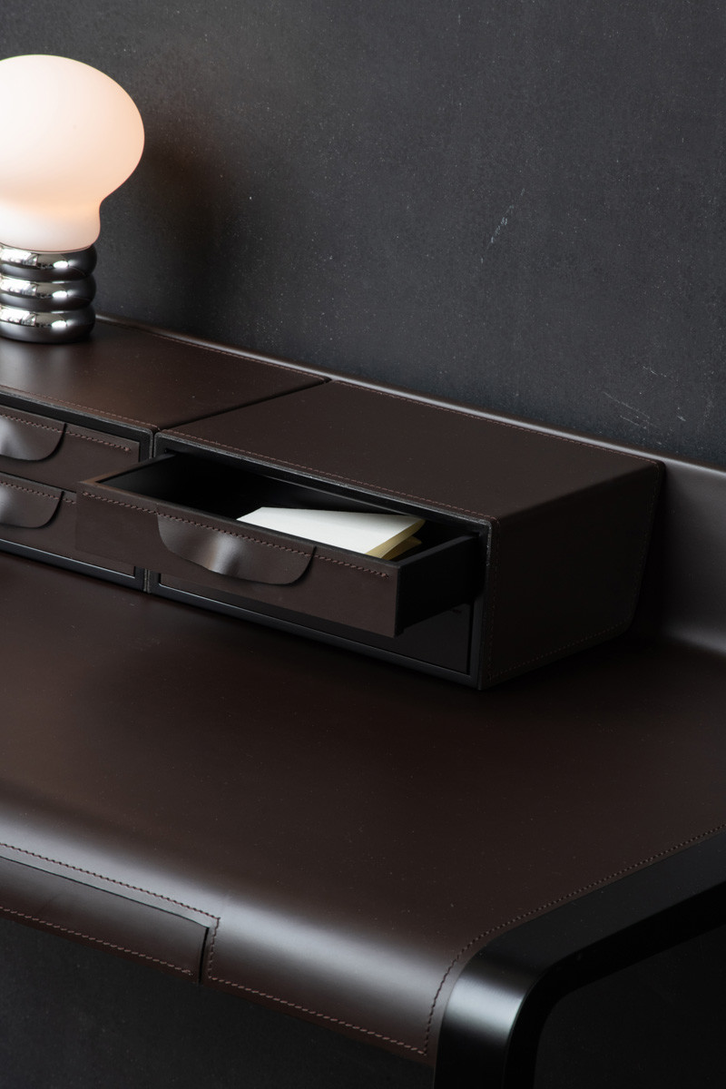 Письменный стол Potocco Linus от Stephan Veit — стол с кожаной столешницей и закругленным передним бортиком. В задней части столешницы встроены два небольших выдвижных органайзера. По переднему краю скрыт длинный выдвижной ящик. Основание образуют четыре плавно изогнутые ножки.