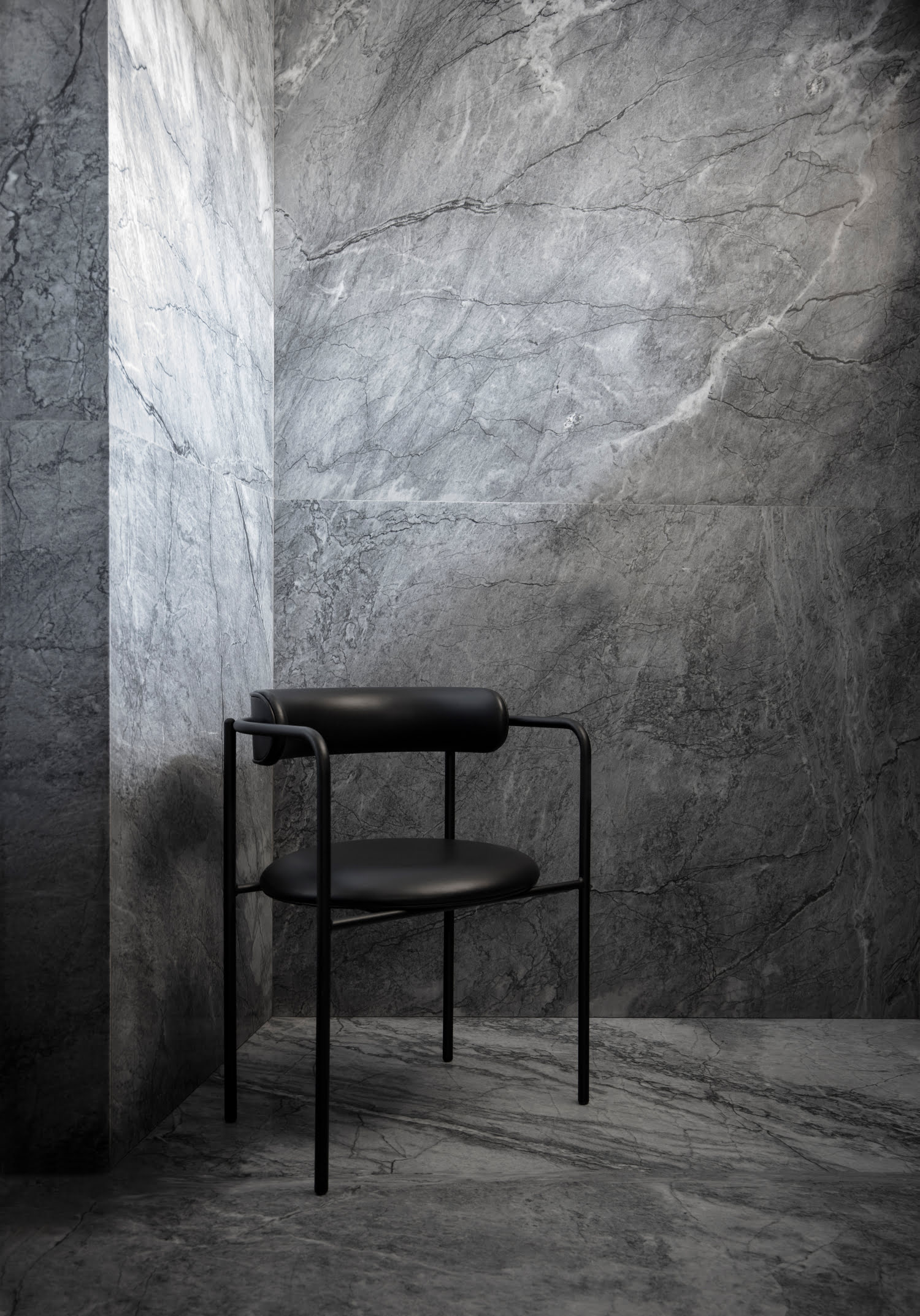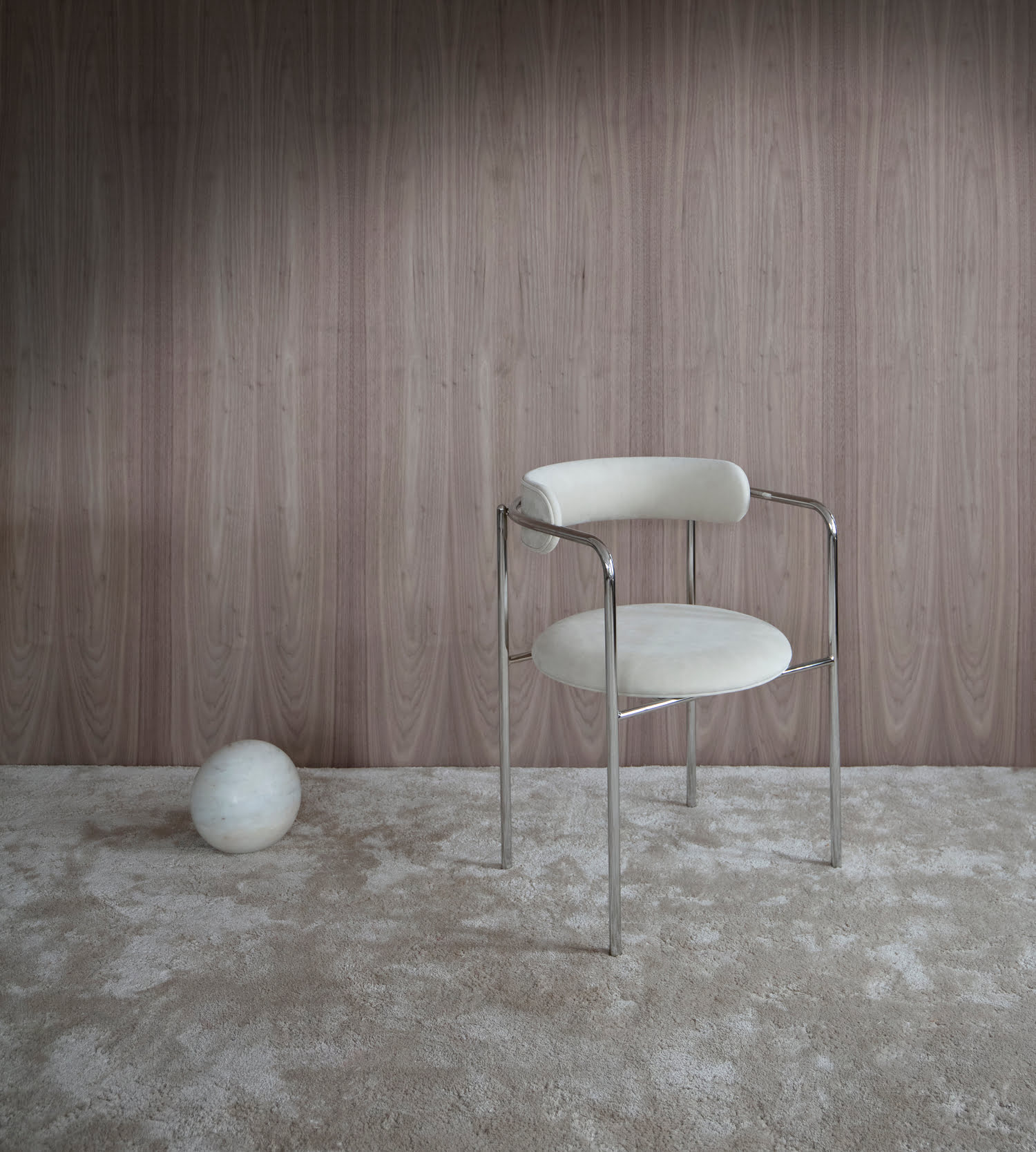 Сиденье и спинка стула FF Chair обиты саржей (53% вискоза, 37% шерсть, 8% лён, 2% акрил). В каталоге отделки можно выбрать другую ткань или кожу и их цвет. Стальной каркас чёрный с порошковым покрытием или хромированный.