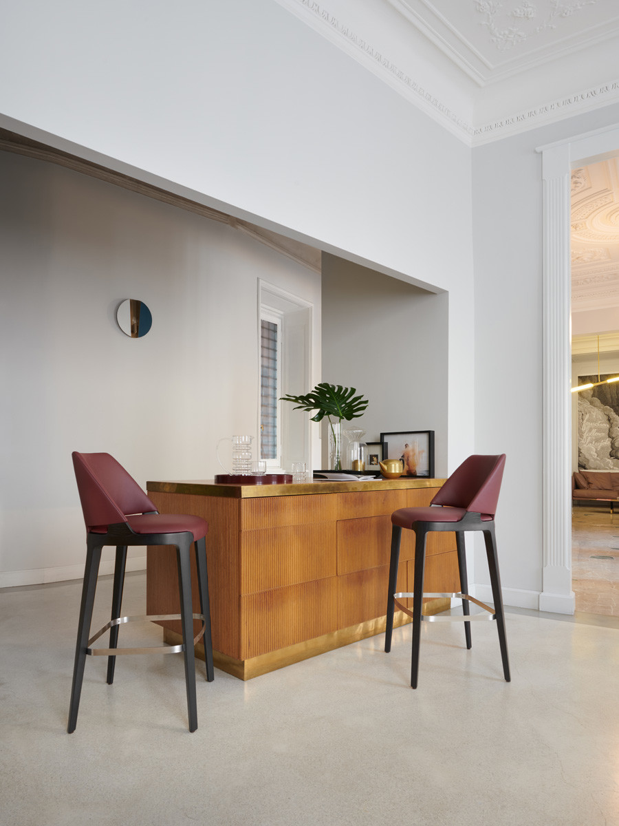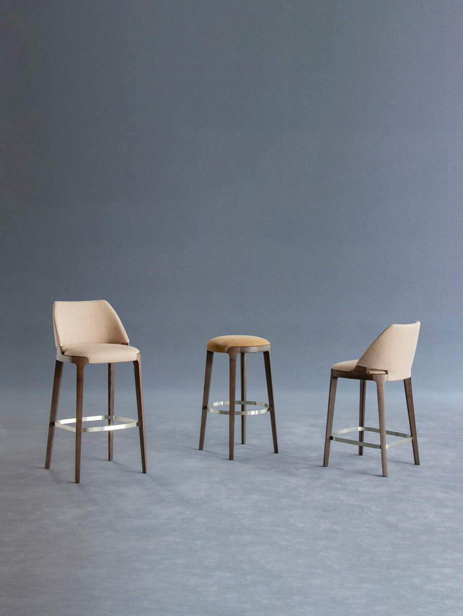 Каркас: массив ясеня или ореха Canaletto. Обивка: текстиль или кожа по карте отделок фабрики. Наполнитель: огнестойкий пенополиуретан. Подножка: сатинированная нержавеющая сталь (бронзированная латунь по запросу).