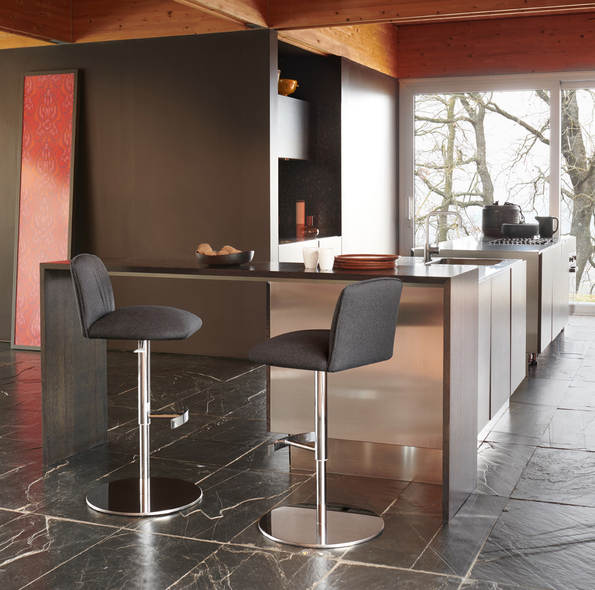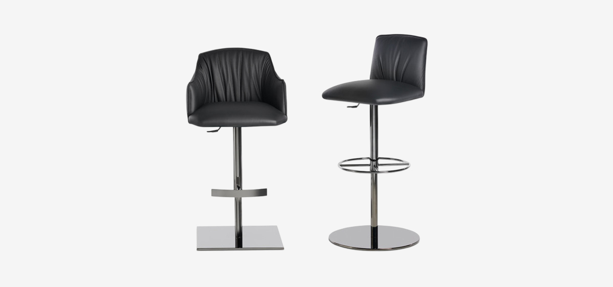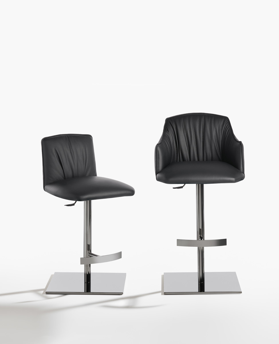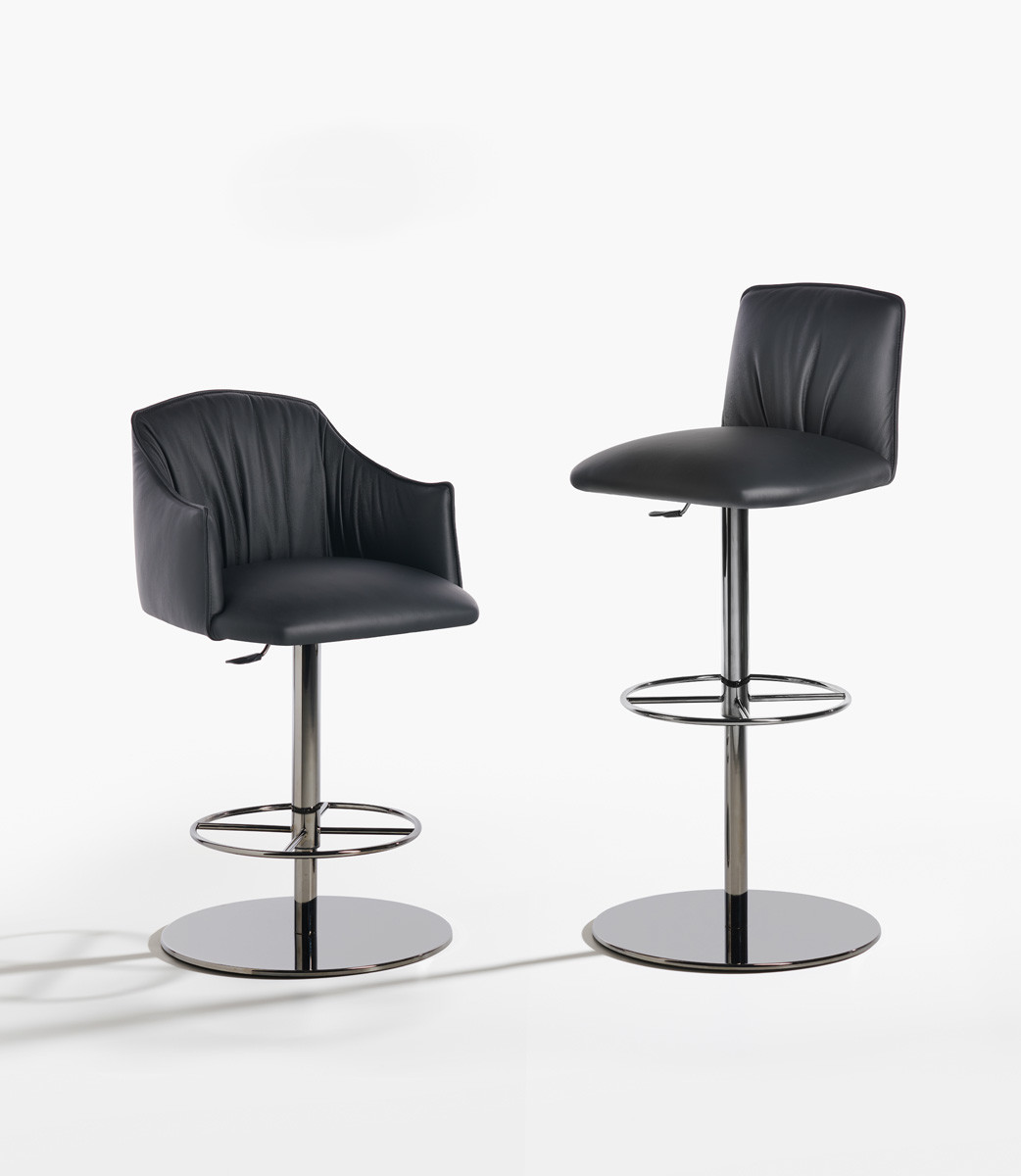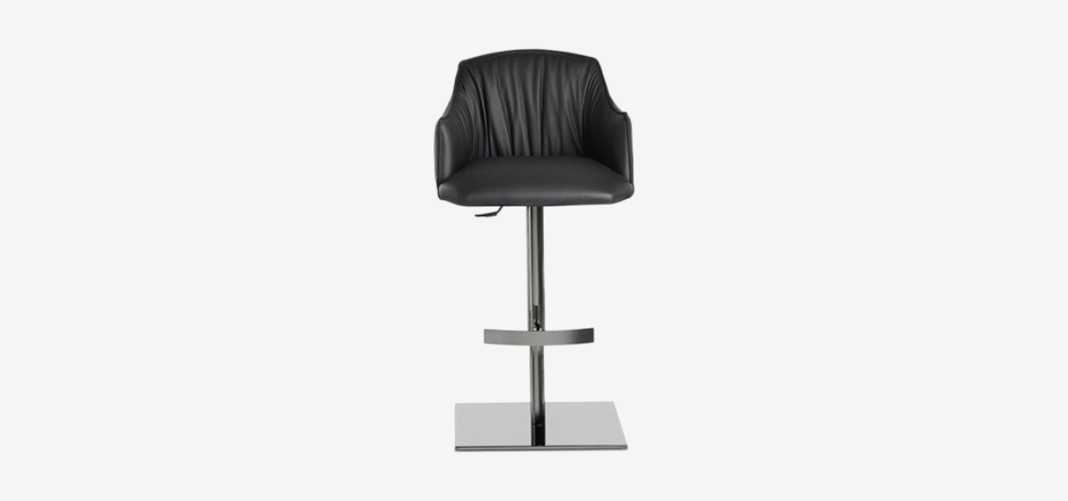 Барный стул Potocco Blossom от Bernhardt & Vella — модель с низкой обтекаемой спинкой. Спинка плавно переходит в подлокотники, образуя чашеобразную форму. Центральная металлическая опора с круглым основанием. Имеется кольцевидная подножка.
