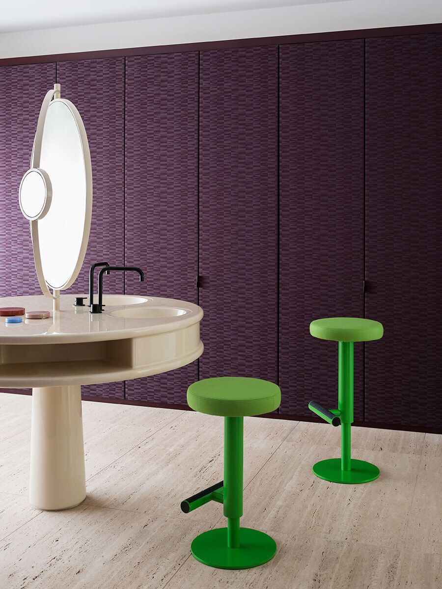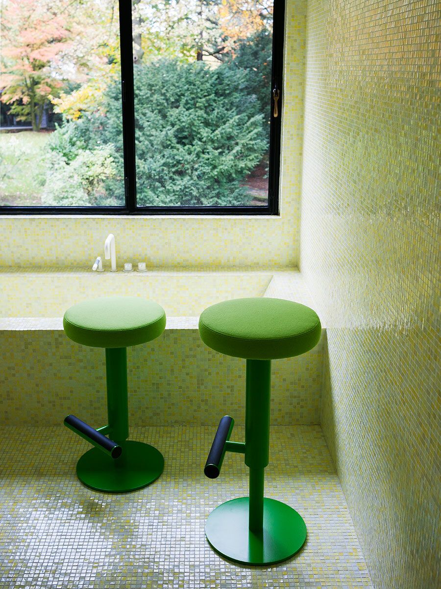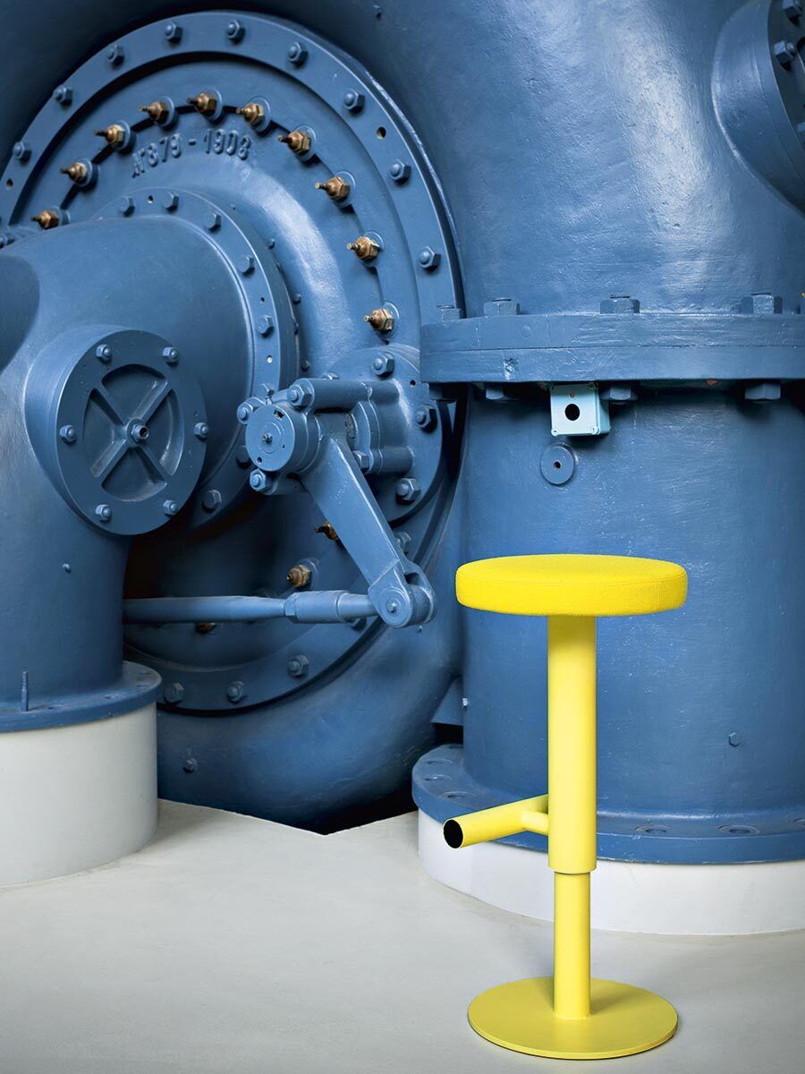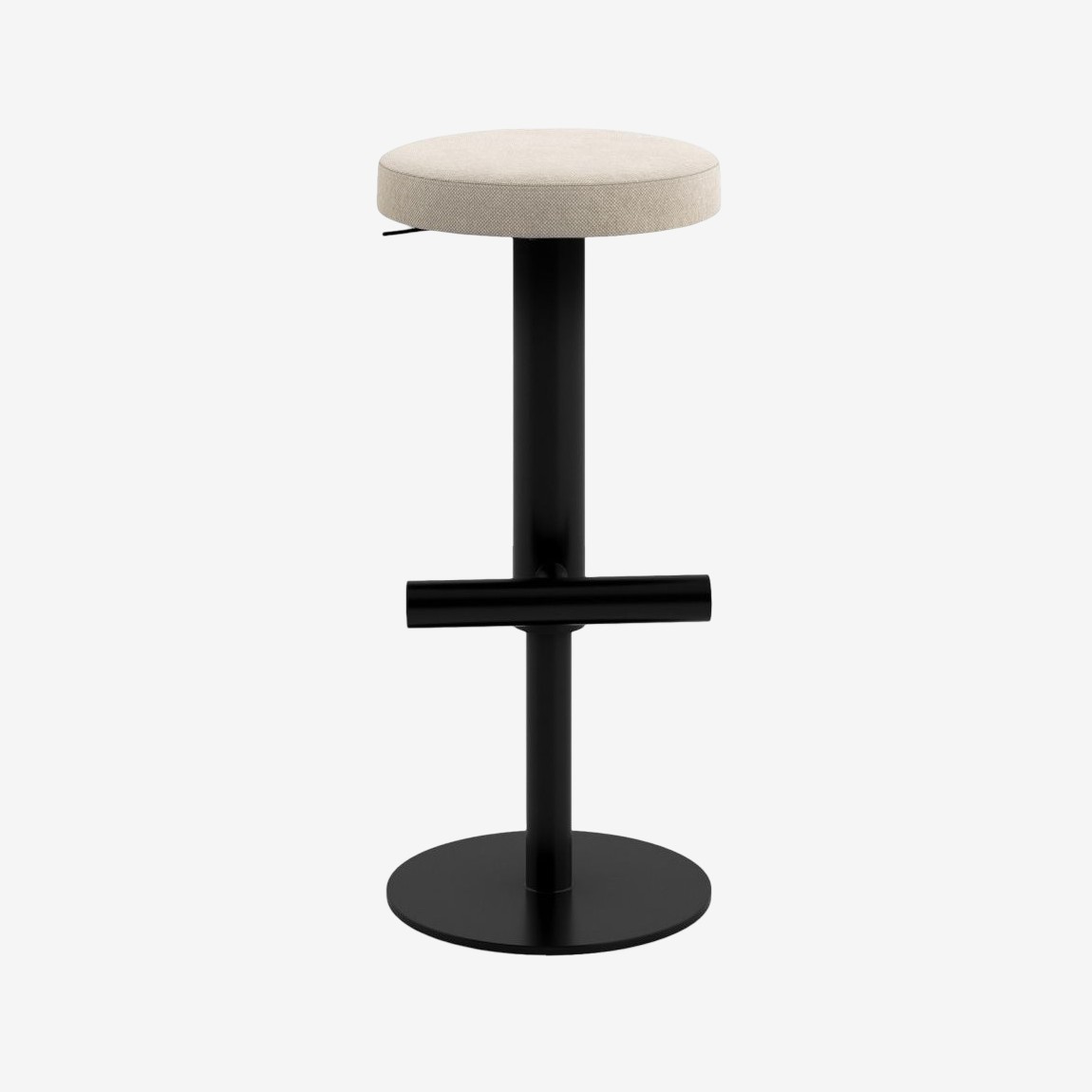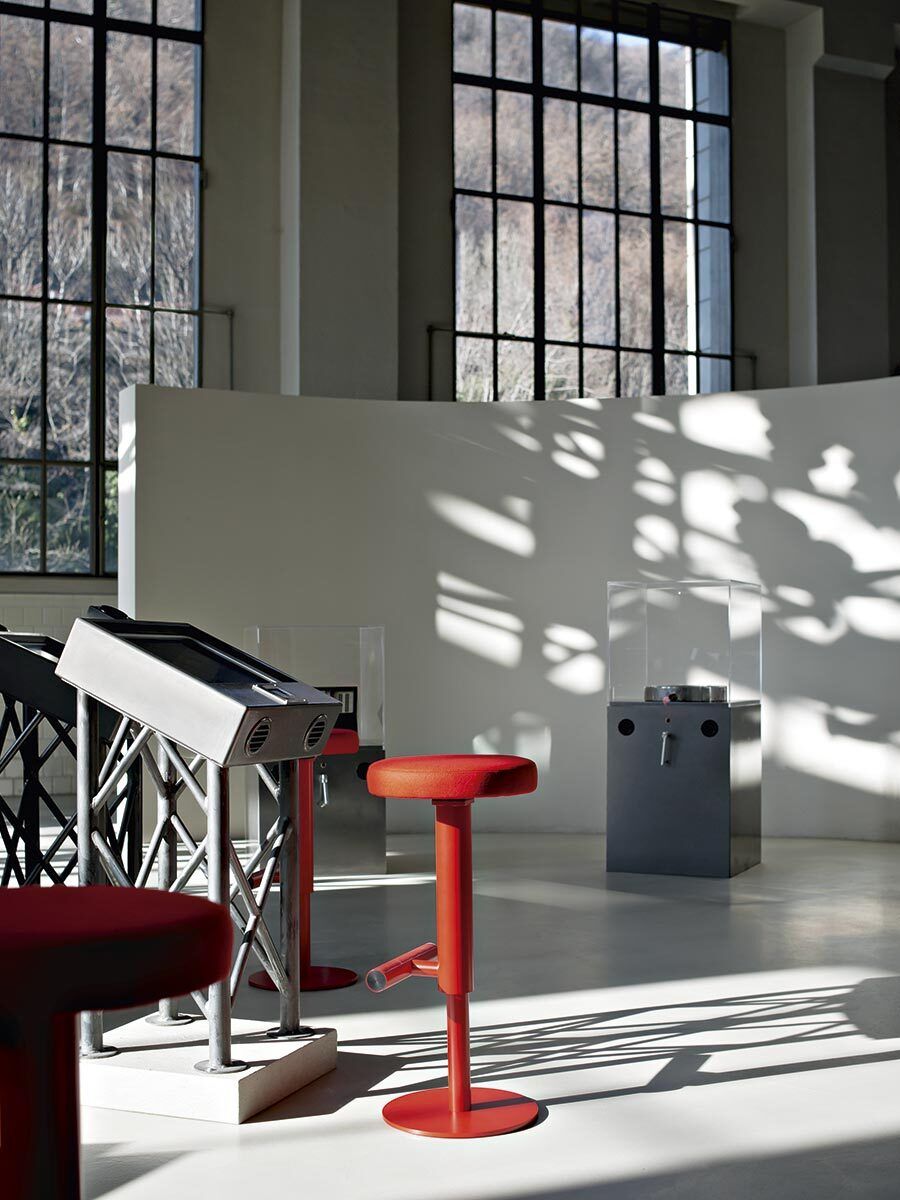 Полубарный стул Tacchini Fixie от PearsonLloyd — модель с круглым сиденьем и металлической стойкой. Край сиденья оформлен двойной строчкой. В нижней части стойки закреплена перекладина для ног. Широкое основание в виде диска придаёт устойчивость.