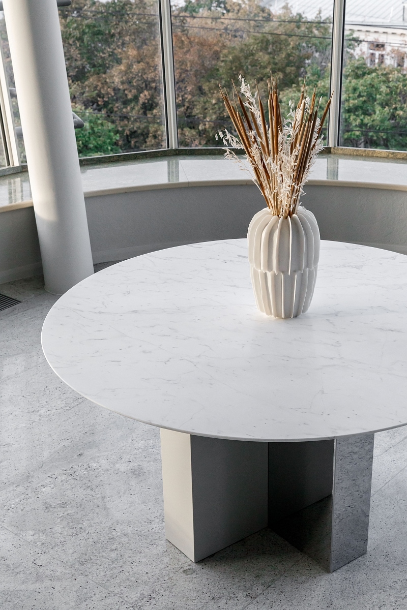 Столешница и 1 половина подстолья выполнены из МДФ или мрамора / кварцевого камня, 2 половина подстолья – из зеркальной нержавейки.