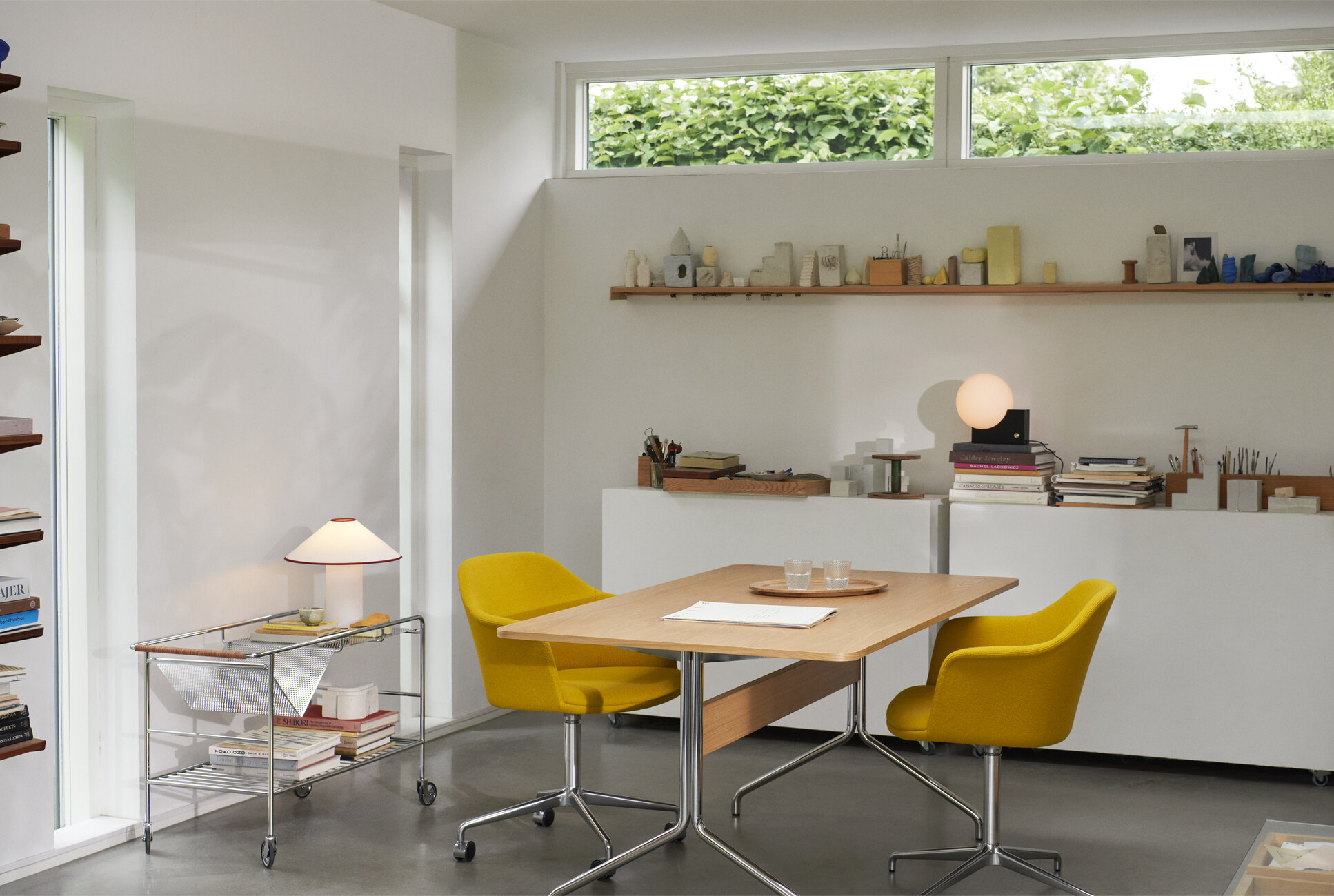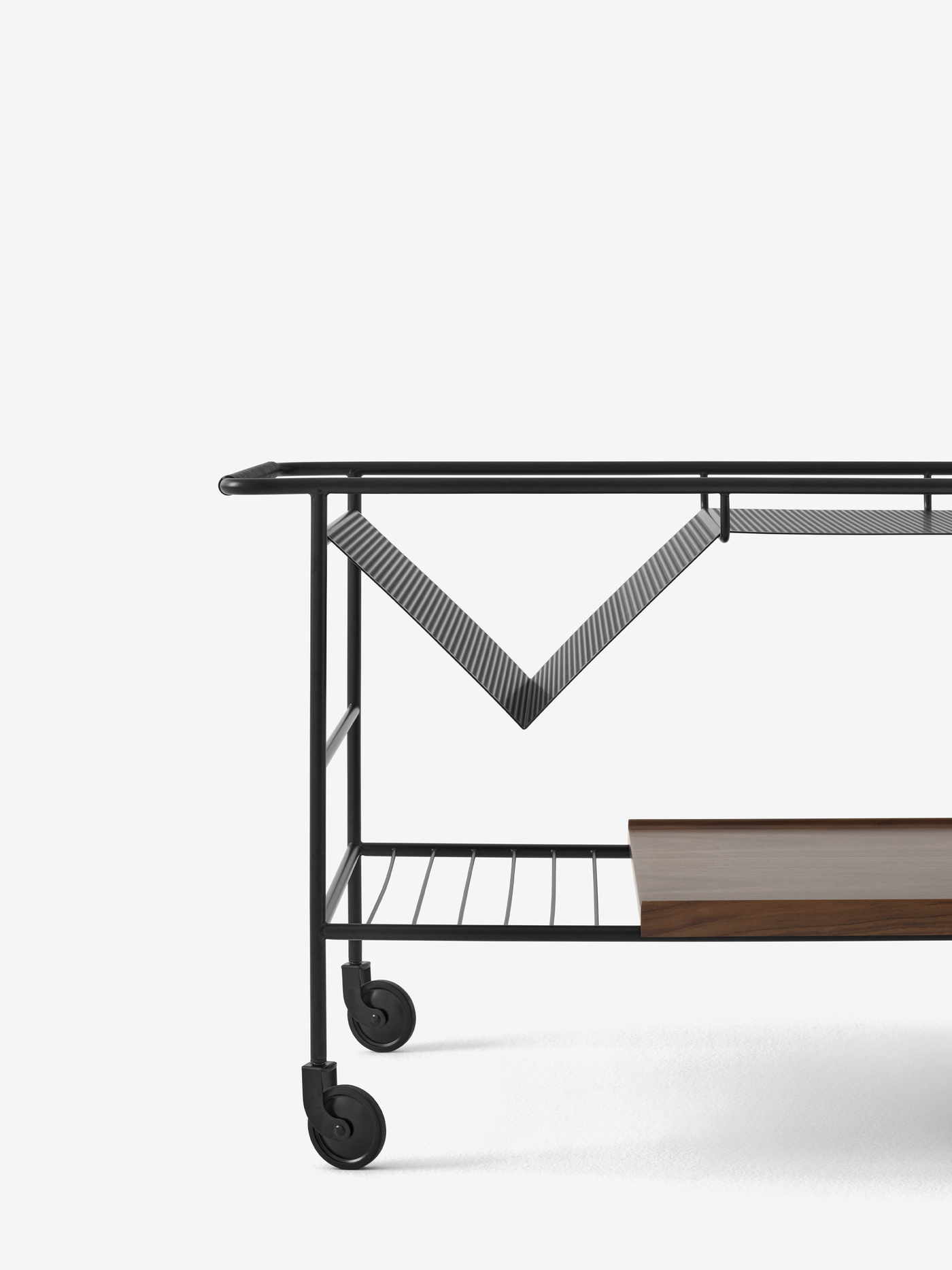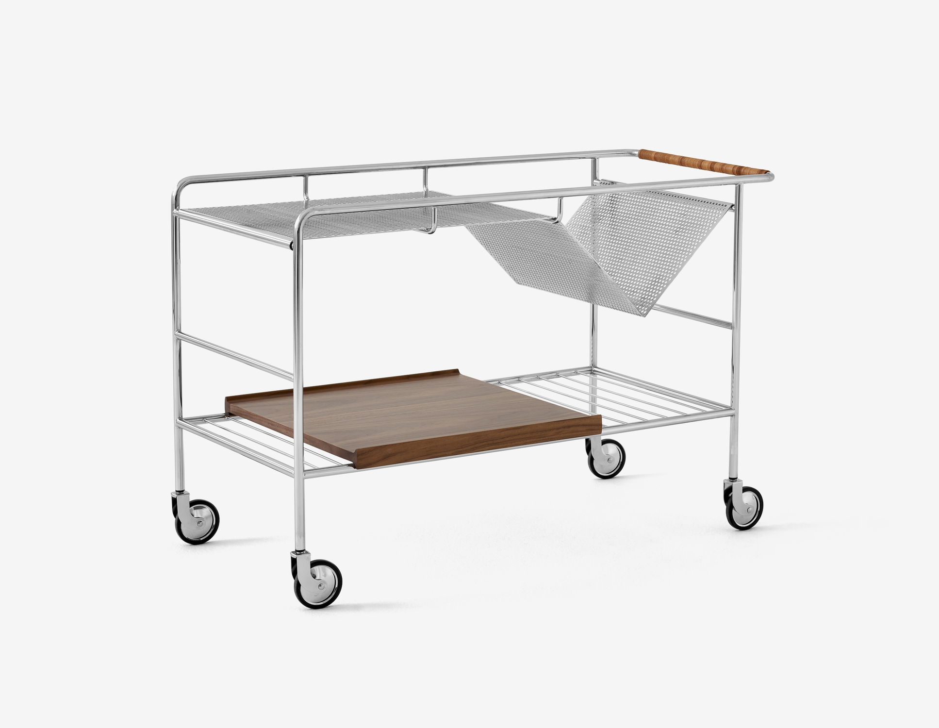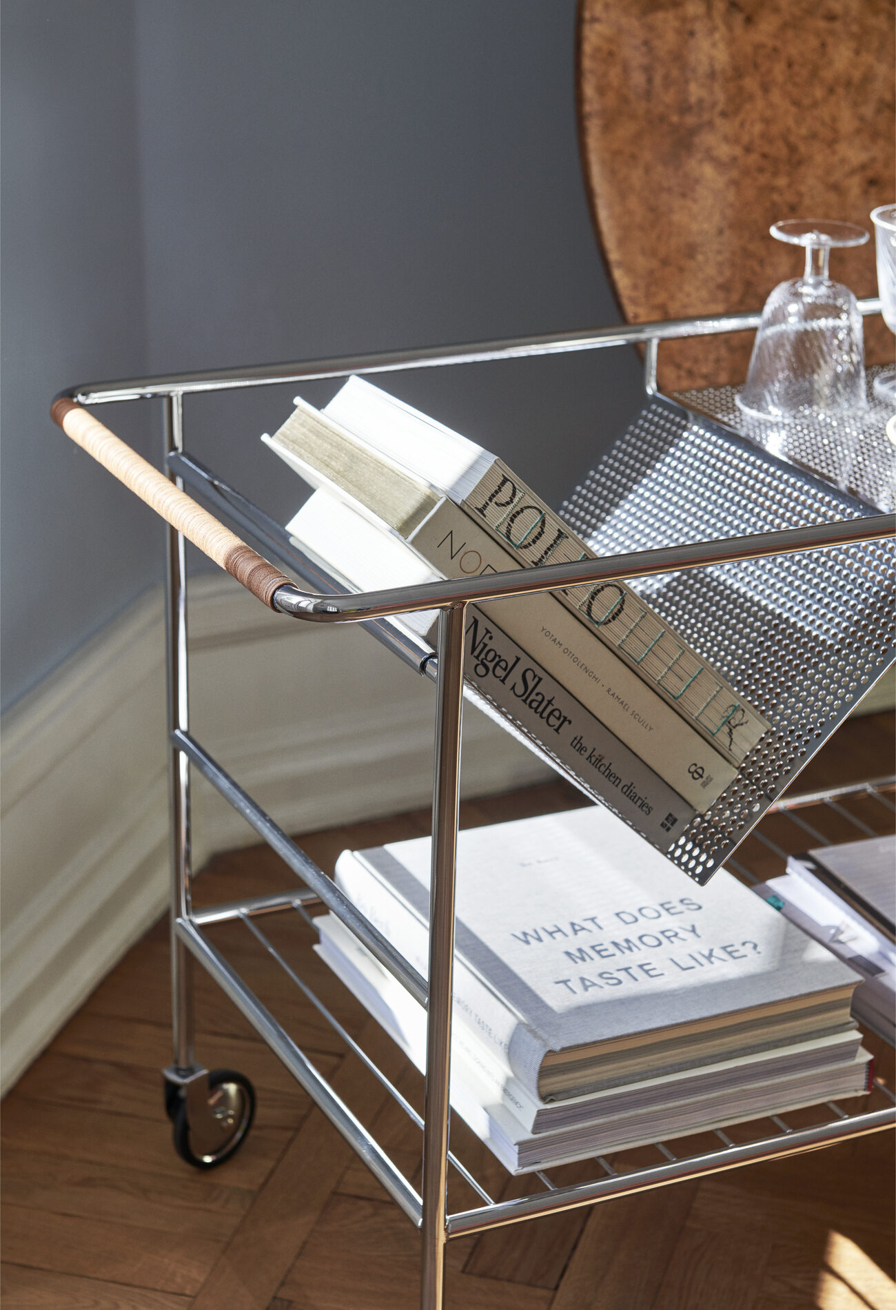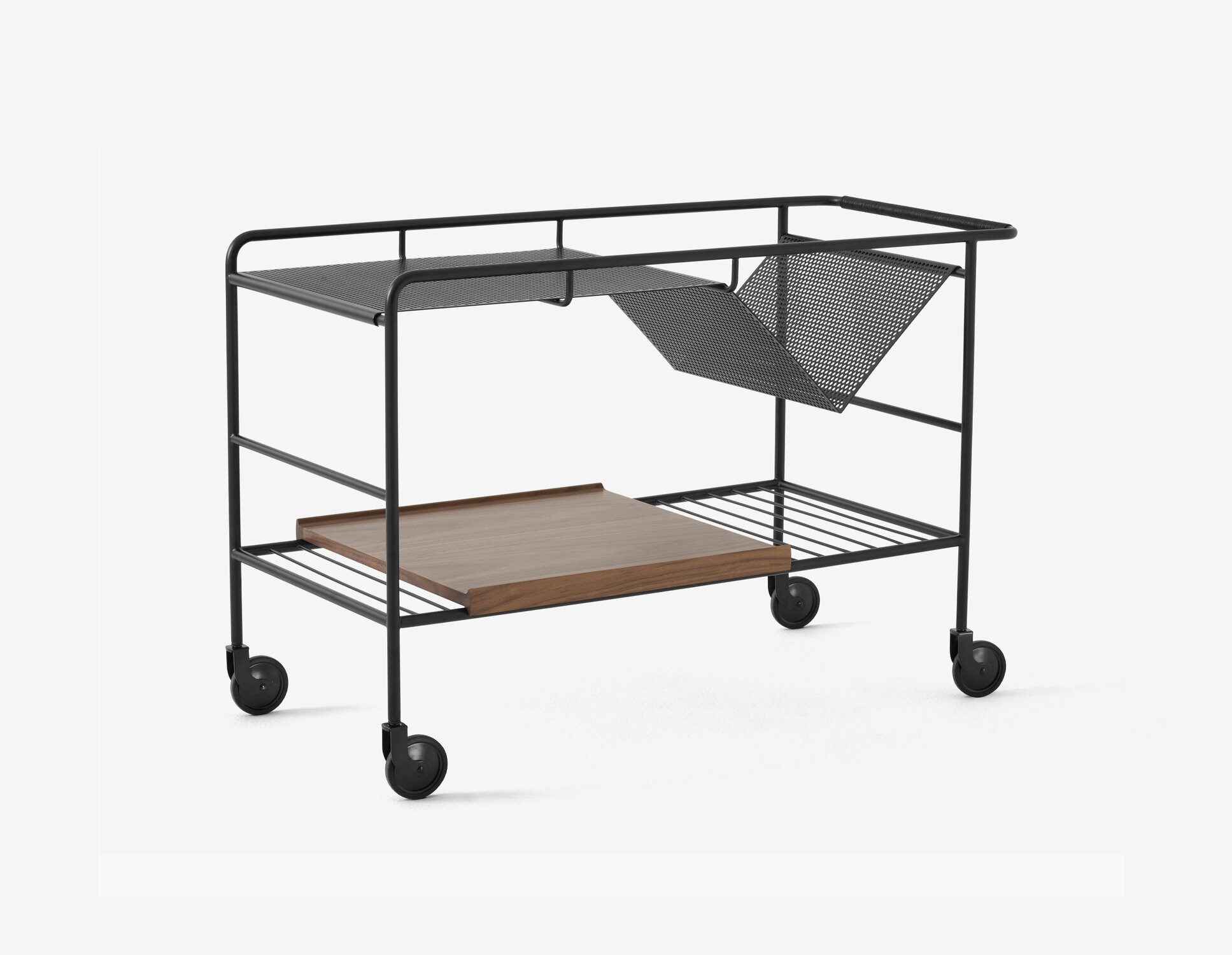 Задумавшись о «творческом хаосе», возникающем при работе из дома, дизайнеры студии Note Design Studio решили создать вместительный, но мобильный предмет мебели для хранения. Результатом их сотрудничества стала изящная металлическая тележка And Tradition Alima NDS1 с удобными колёсиками. Модель оборудована вместительным деревянным подносом и отсеком для книг из стали.