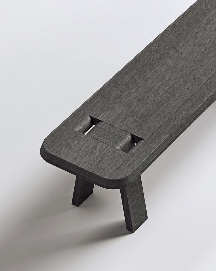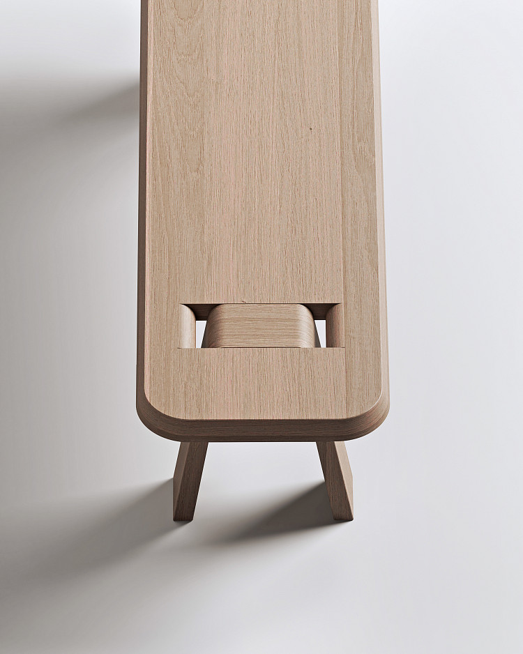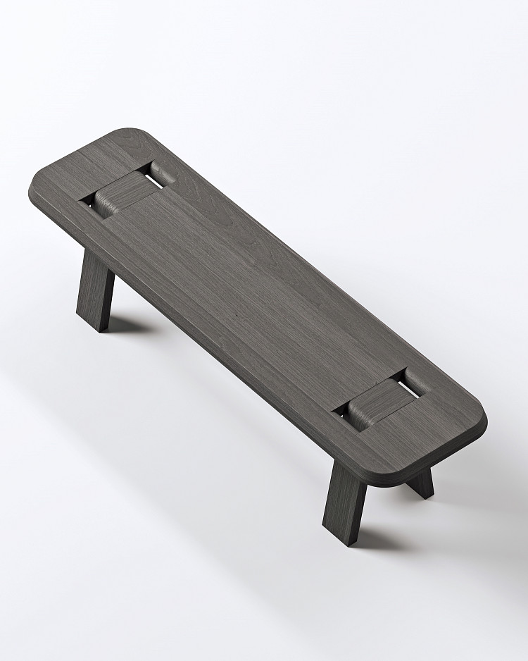 Банкетка Modénature Ammar Bench от Arseniy Karinskiy. Прямоугольное сиденье со скругленными углами покоится на четырех ножках. Ножки проходят через сквозные прорези в сиденье и слегка выступают над ним. Это соединение становится главным декоративным элементом. Конструкция собрана без металлического крепежа.