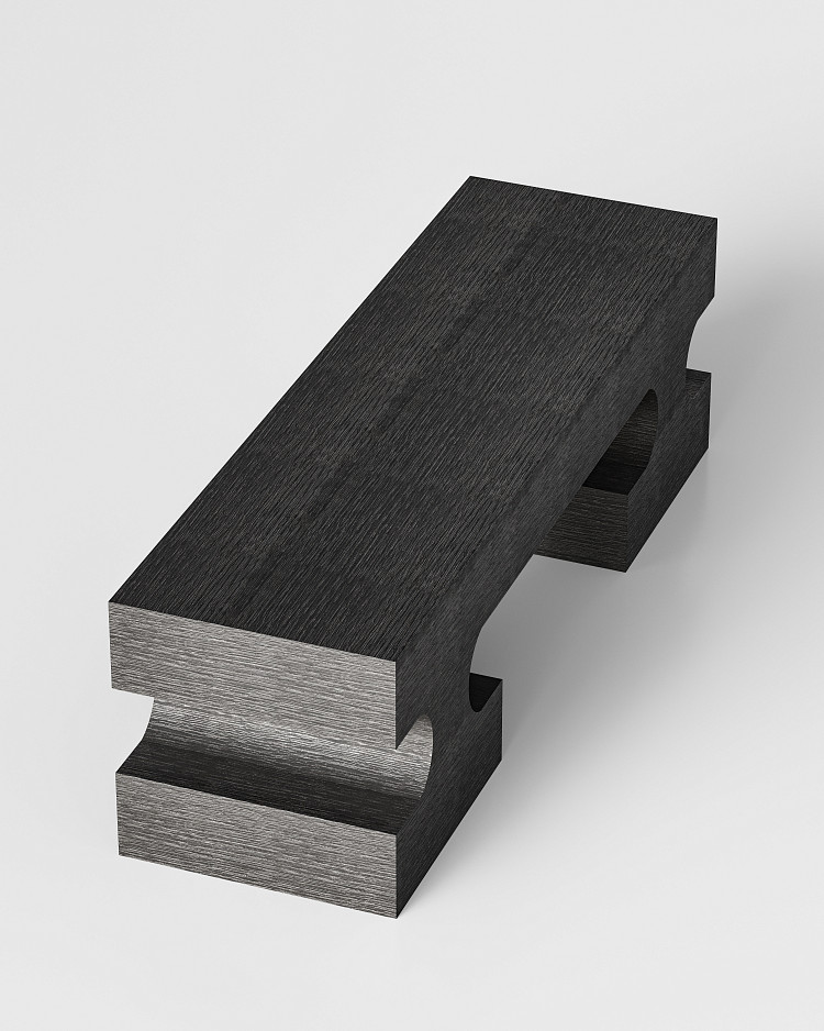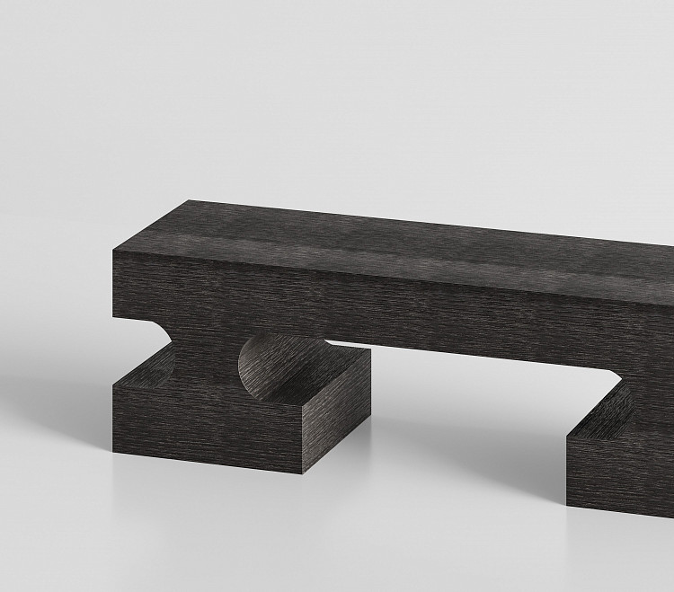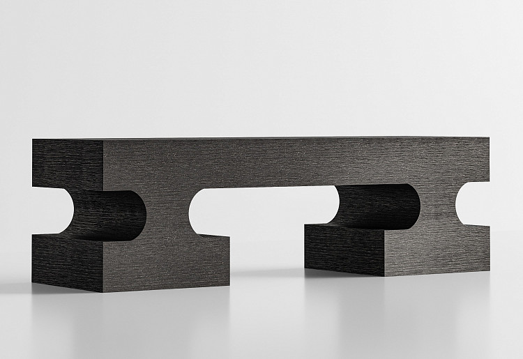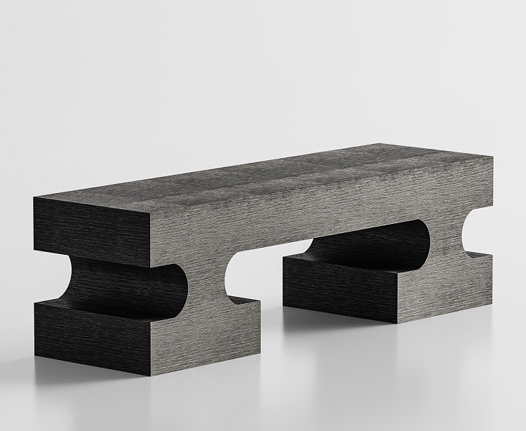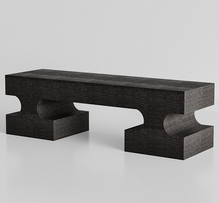 Скамья Modénature Nuage Bench от Jerome Botanic представляет собой монолитный объем из темного дерева. Две массивные боковые опоры имеют крупные полукруглые выемки, обращенные друг к другу. Верхняя часть образует сплошное сиденье без отделки или мягких элементов. Конструкция воспринимается как цельный скульптурный объект.