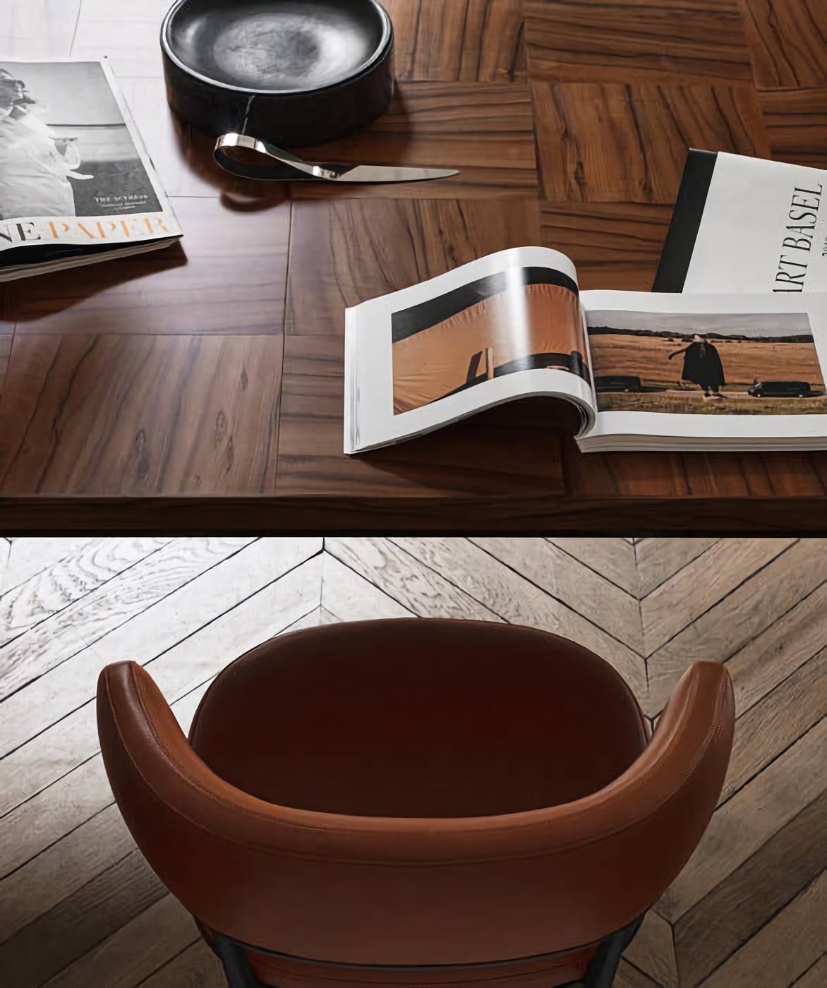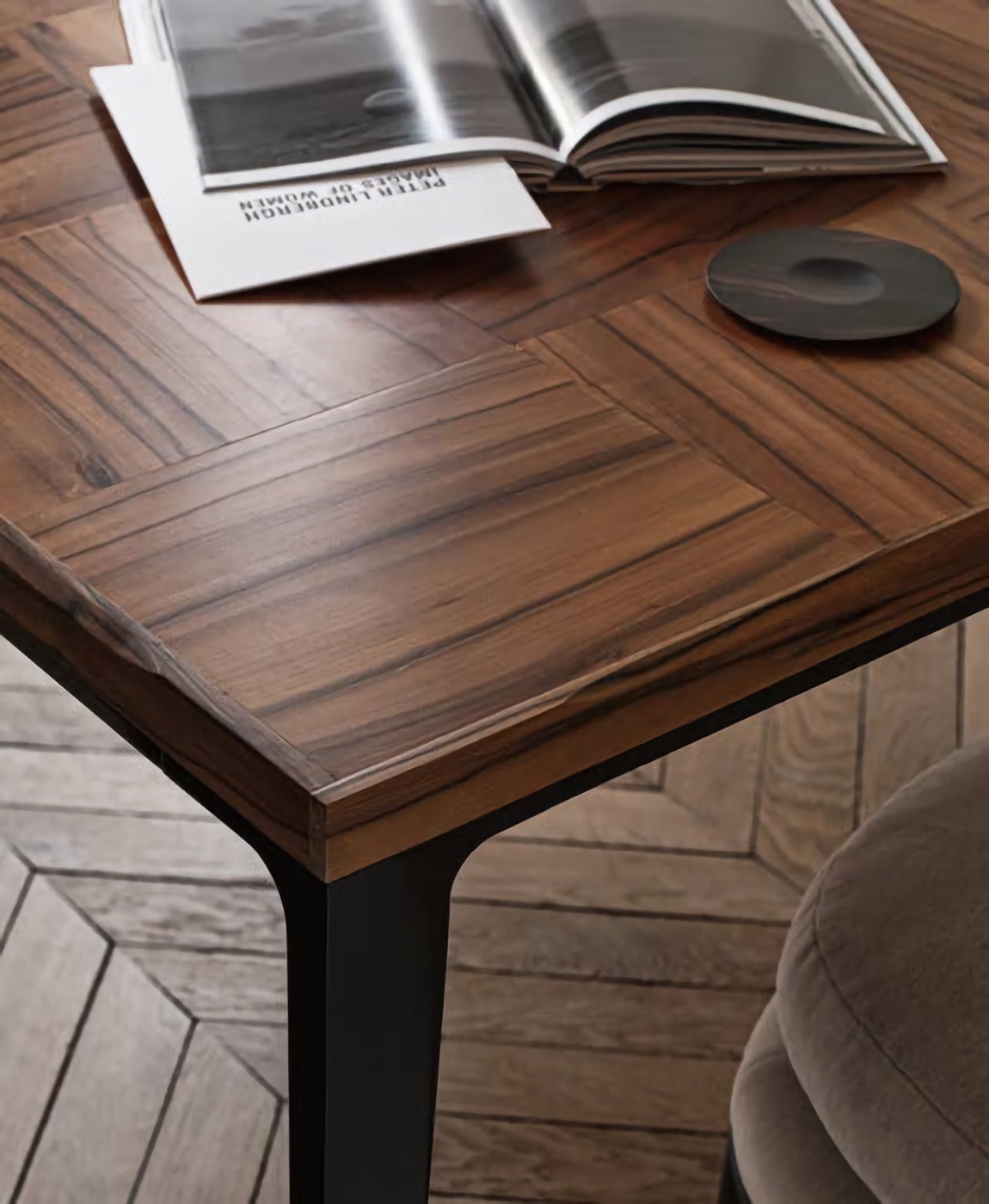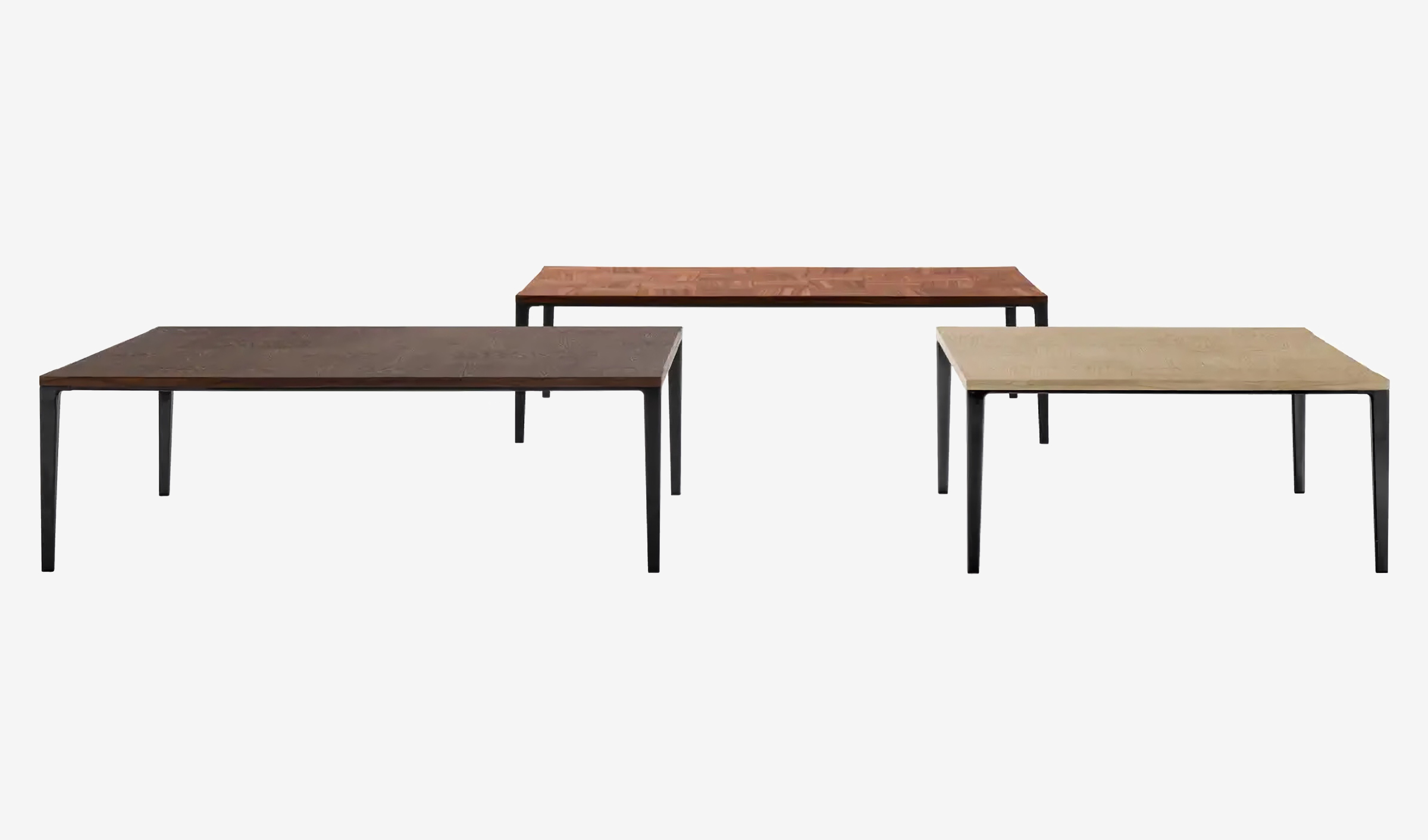 Обеденный стол Maxalto Alcor отличается строгой эстетикой и графичной формой. Столешница из ценных пород дерева состоит из квадратных плиток с расположенным в разных направлениях орнаментом. Каркас модели выполнен из долговечного алюминия в разных цветах.