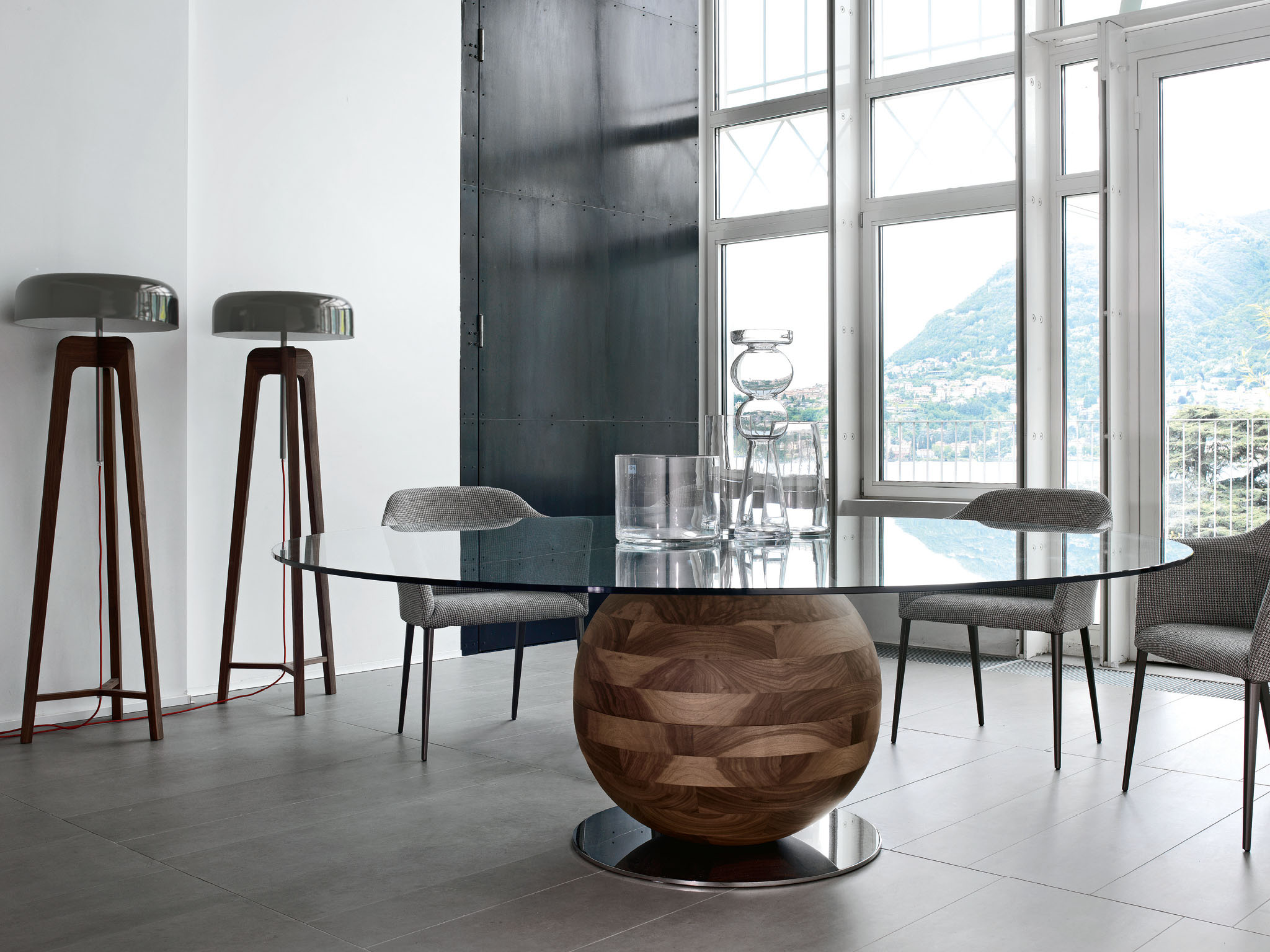 Обеденный стол Porada Gheo-K впечатляет своим массивным сферическим основанием, полностью выполненным из дерева. Хромированный металлический диск, на котором установлена ножка из массива ореха, служит отражателем, создавая необычную игру света и тени. Тонкая столешница контрастирует с внушительным основанием, уравновешивая дизайн стола.