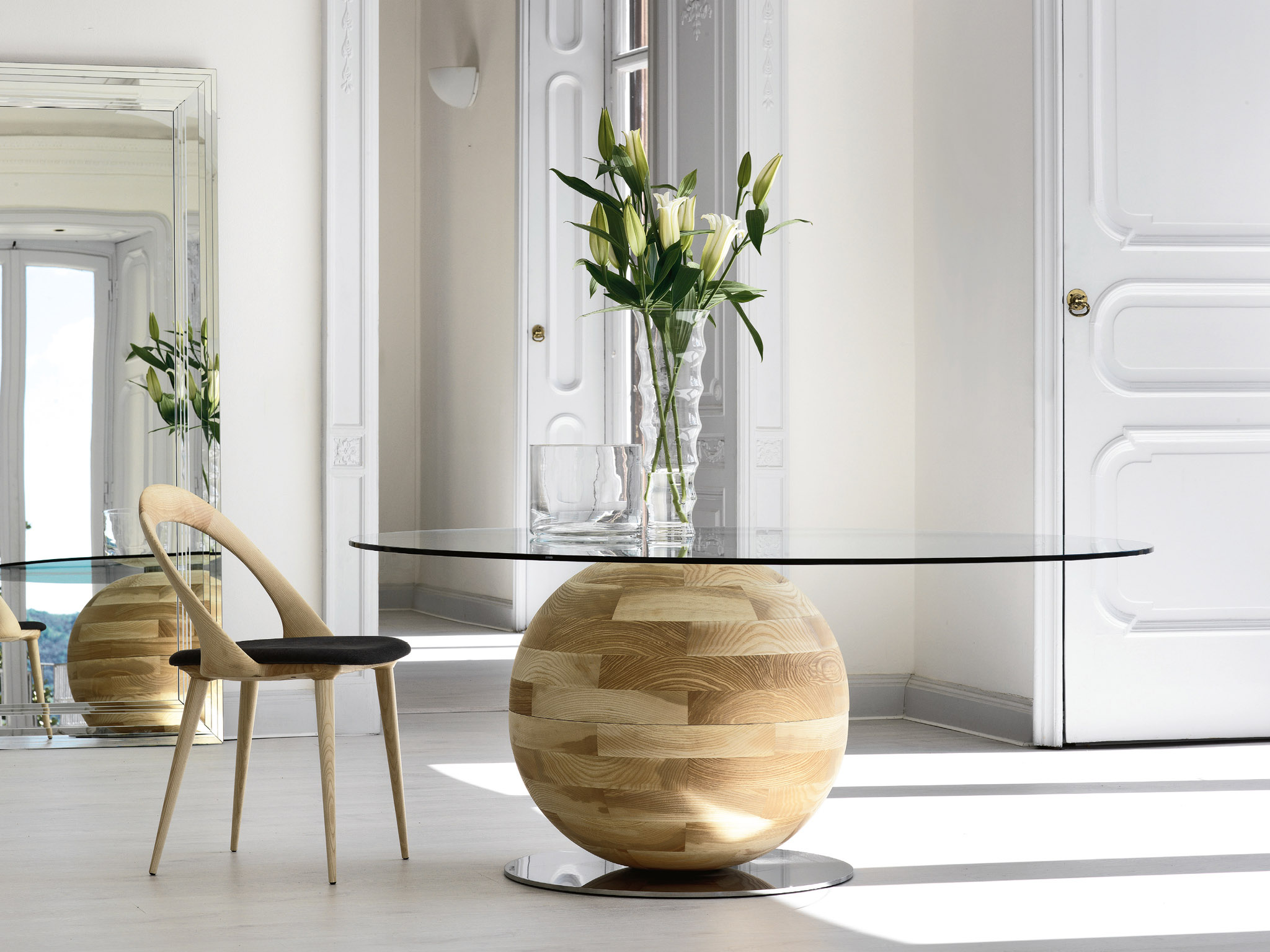 Обеденный стол Porada Gheo-Off станет акцентным предметом мебели благодаря своей монументальной круглой ножке. Тонкая, но прочная столешница может иметь как центральное, так и ассиметричное положение, создавая необычный визуальный эффект. Использование деталей из дерева различных тонов делает стол самобытным, ни на что не похожим предметом мебели.
