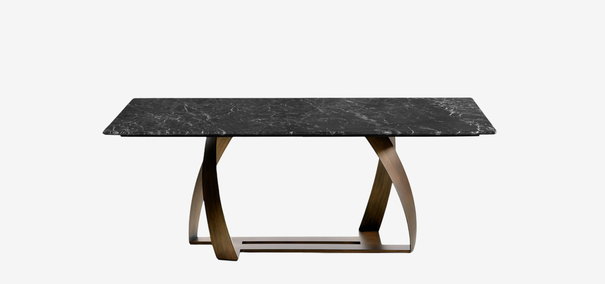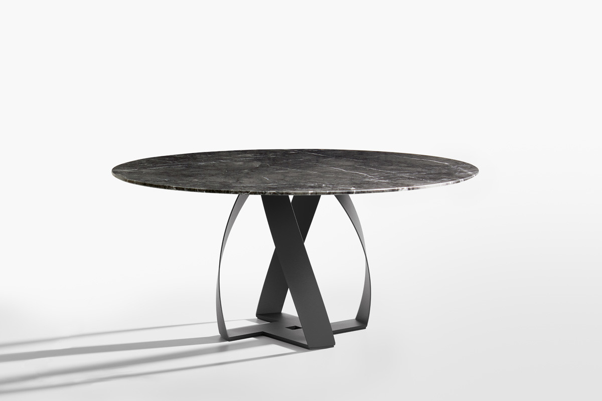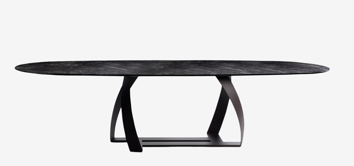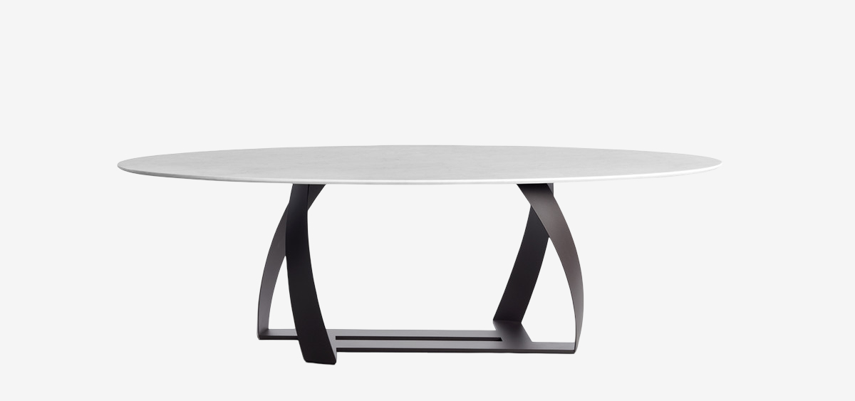 Обеденный стол Potocco Bon Bon от Alexander Lorenz — стол с выразительным основанием в виде пересекающихся металлических пластин. Конструкция напоминает скрещенные ленты или арки. Столешница доступна в круглой, овальной, эллиптической и прямоугольной версиях. Силуэт легкий и динамичный.