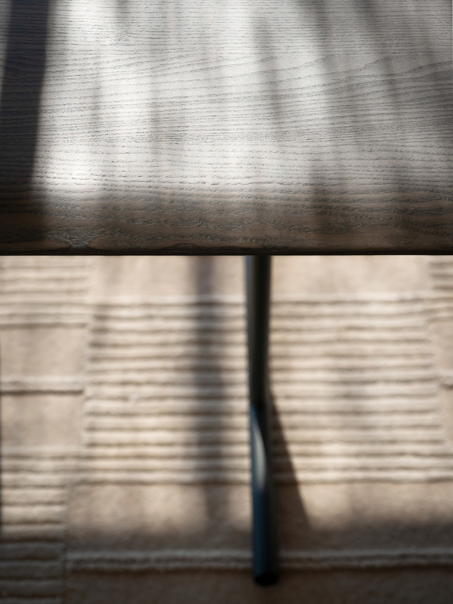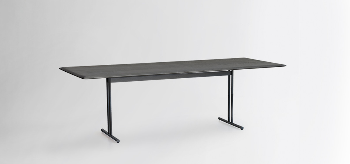 Обеденный стол Potocco Graphic от Victor Vasilev и Mario Ferrarini — модель с прямоугольной столешницей и парными металлическими опорами. Две вертикальные стойки соединены продольной планкой и Т-образными элементами внизу. Столешница имеет тонкий профиль со скругленными углами.