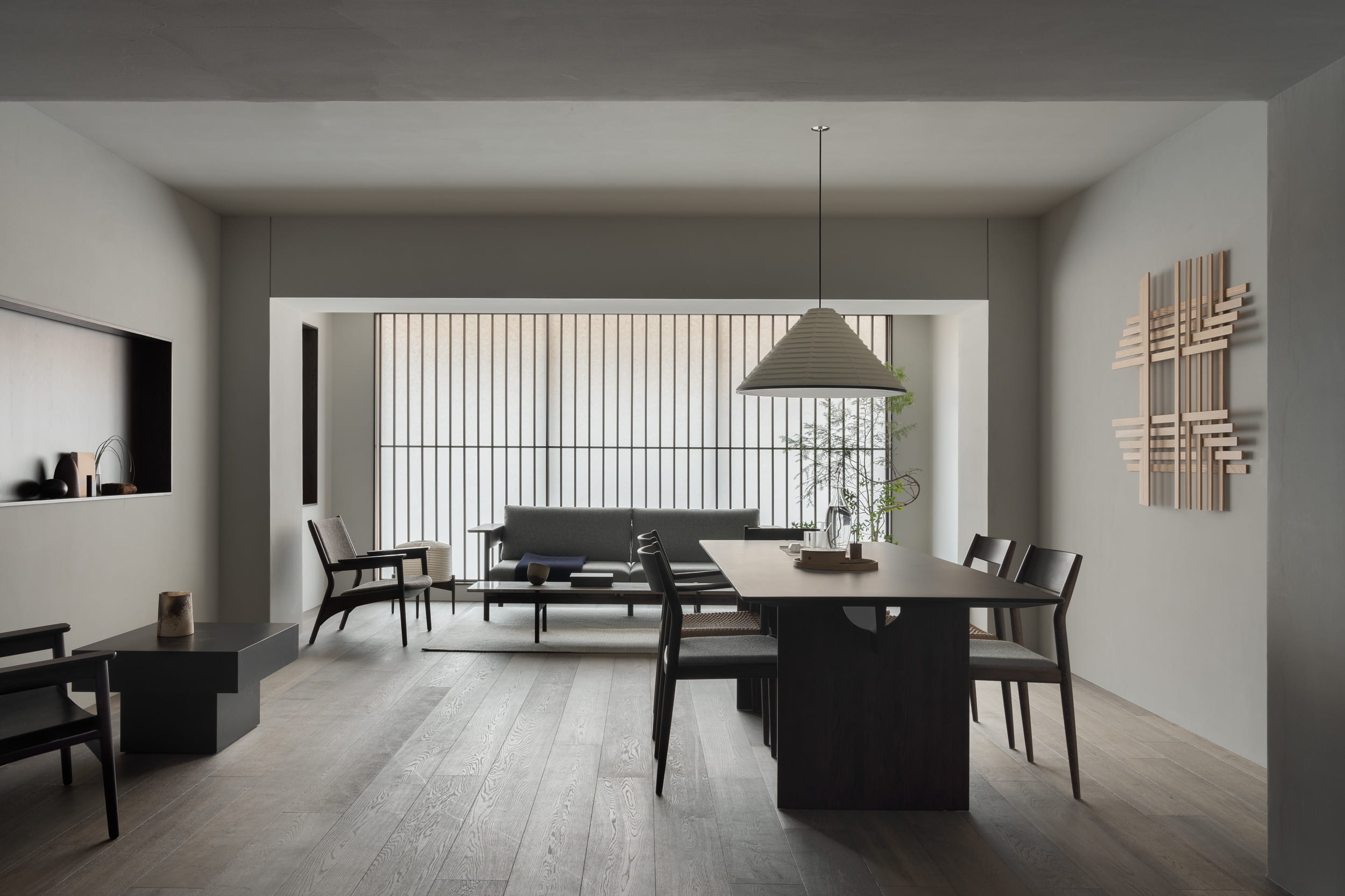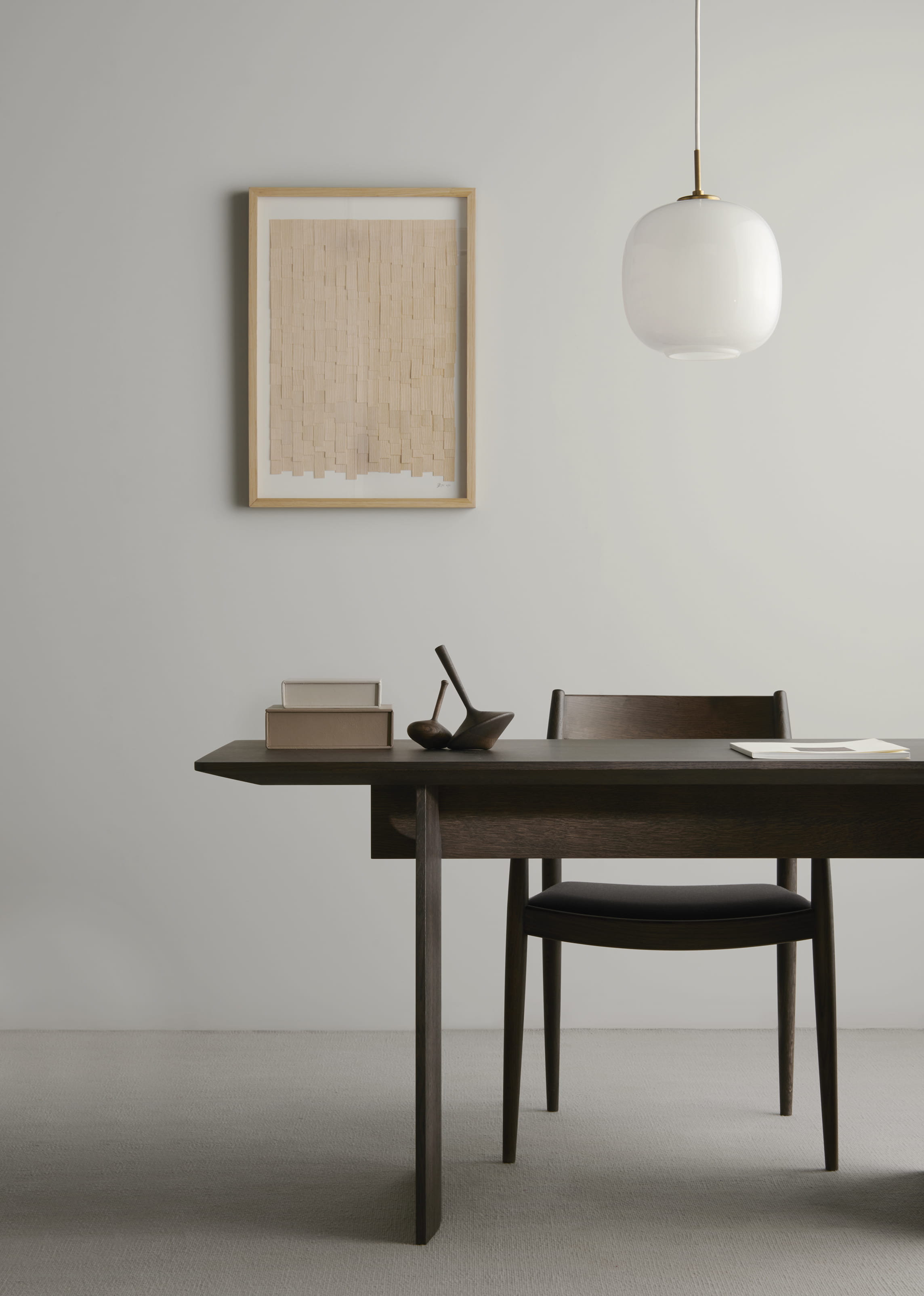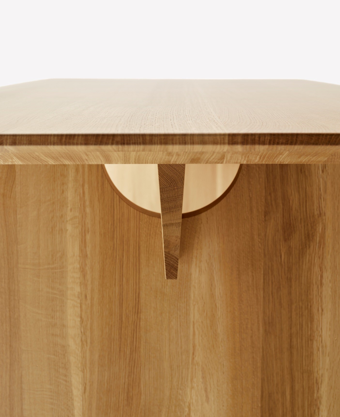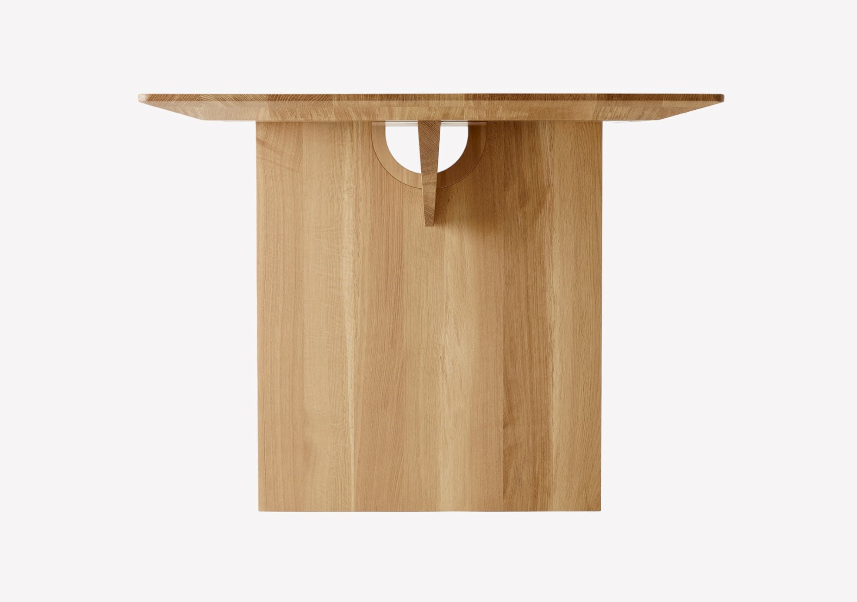 Обеденный стол Karimoku N–DT01 оживляет гармония контрастов: тяжёлая и прочная середина столешницы и ножек плавно перетекает в утончённые заострённые края, а сложная конструкция из дубового массива выглядит легко и уютно, пропуская лучи света сквозь отверстия в ножках.