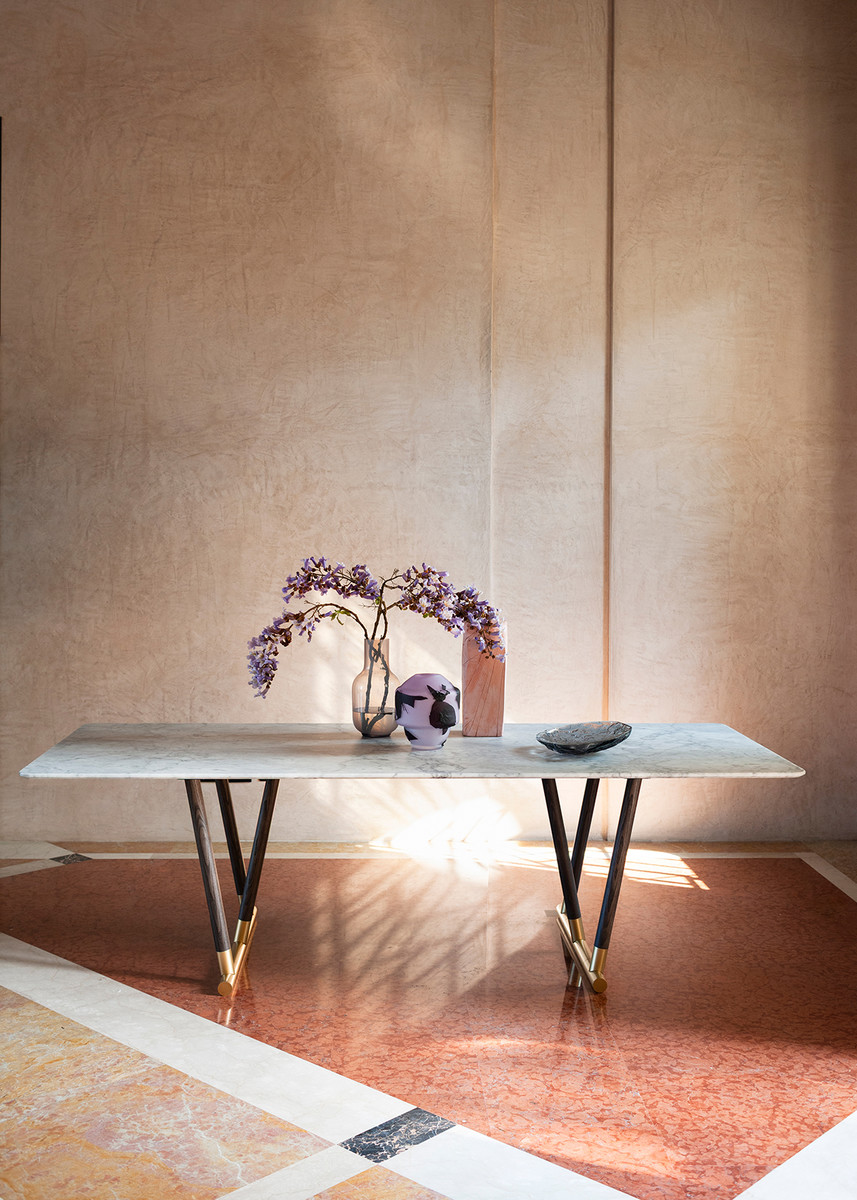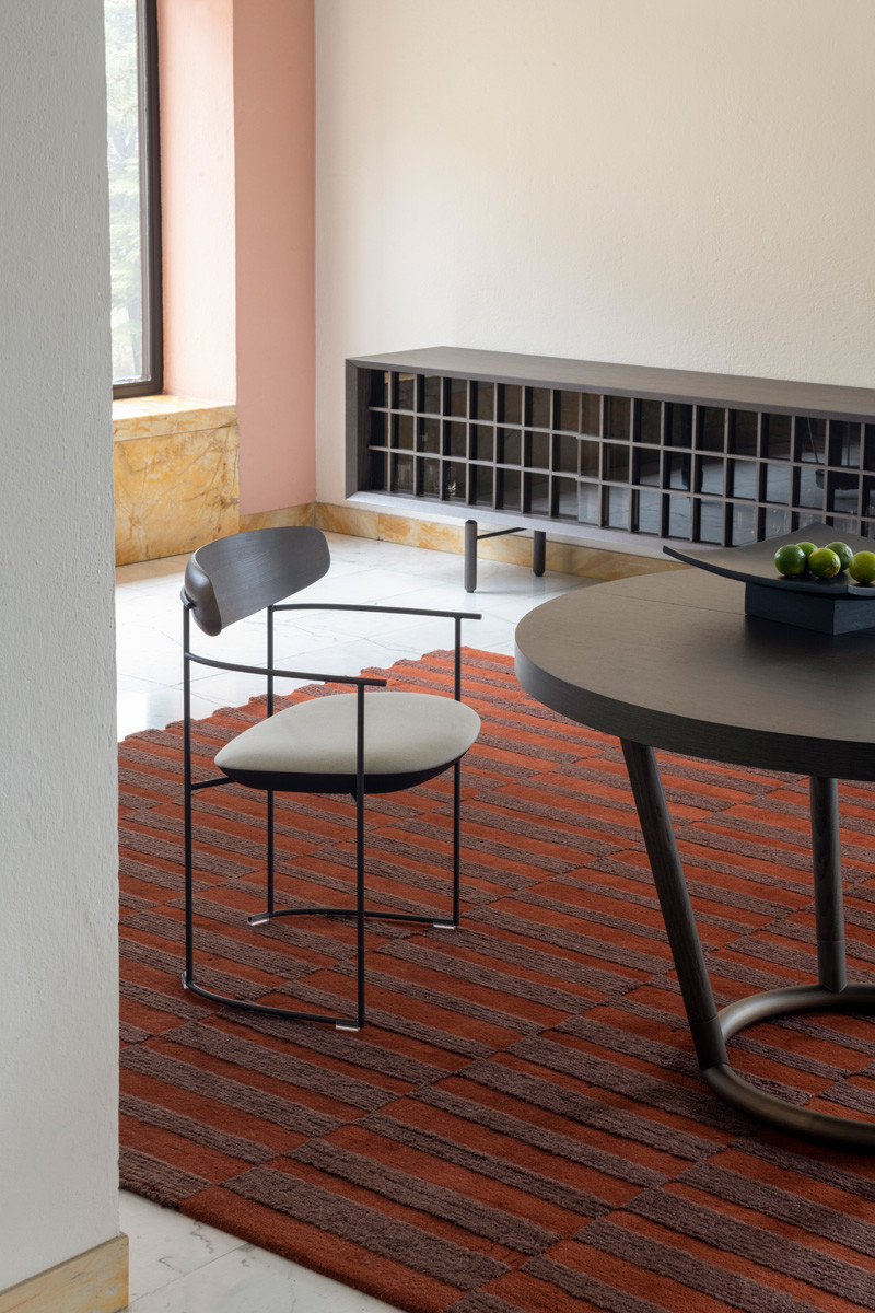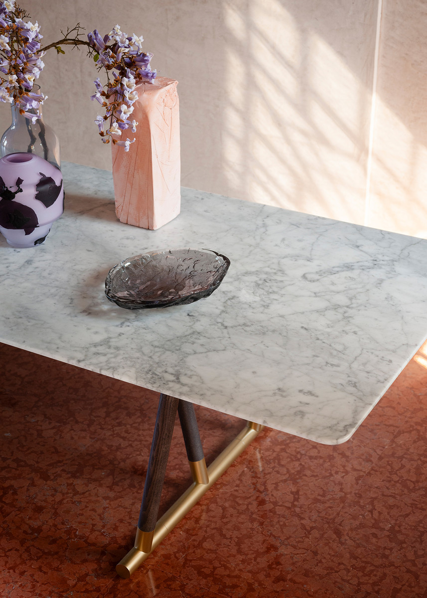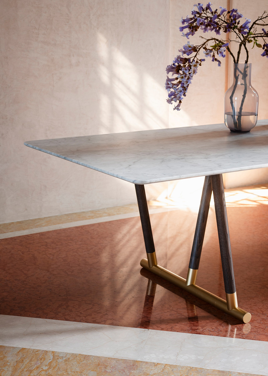 Стол Potocco Pipe от Mario Ferrarini — стол с выразительным силуэтом и металлическим акцентом. Ножки из ясеня плавно переходят в бронзовое кольцо в основании. Круглая раздвижная столешница состоит из двух симметричных частей.