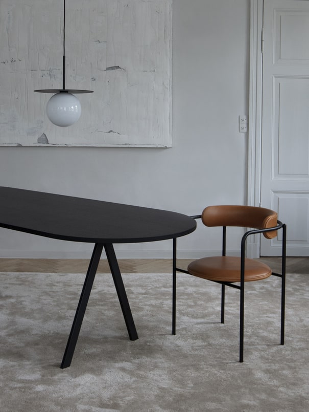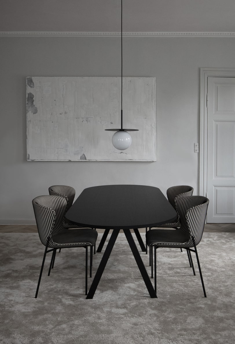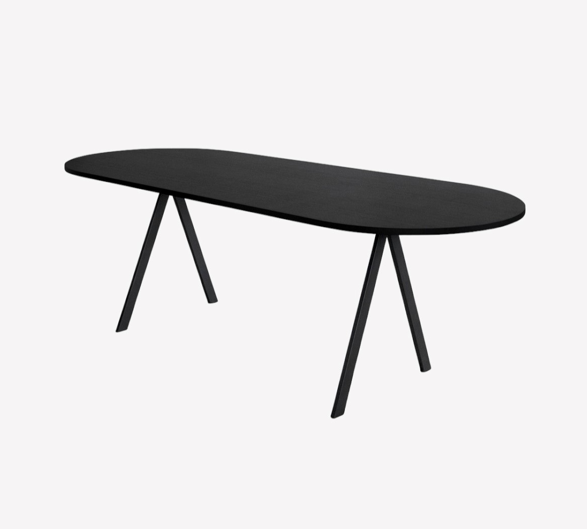 Столешница обеденного стола Saw Rounded выполнена из шпона ясеня с обработанной воском сатиновой отделкой без растворителей в оттенке Black. Каркас металлический с порошковым покрытием в оттенке Black.
