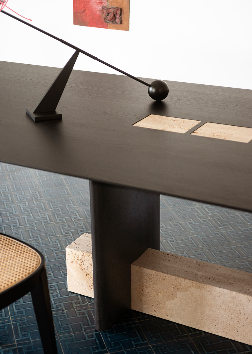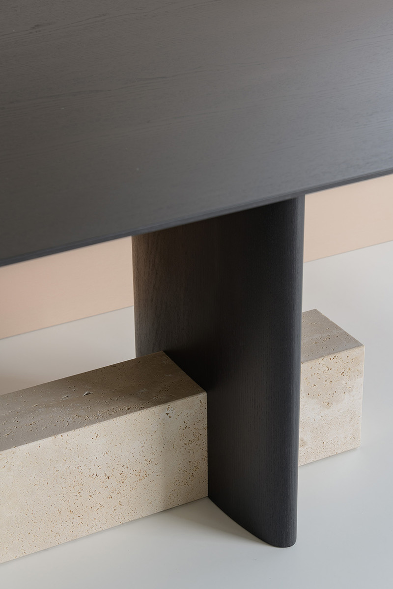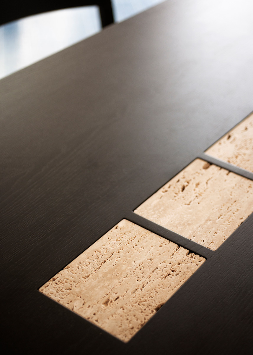 Обеденный стол Potocco Syn от Mario Ferrarini — модель с прямоугольной столешницей на скульптурном основании. Две деревянные колонны и каменный блок образуют опору. Столешница из мрамора с прожилками. Все углы плавно скруглены.