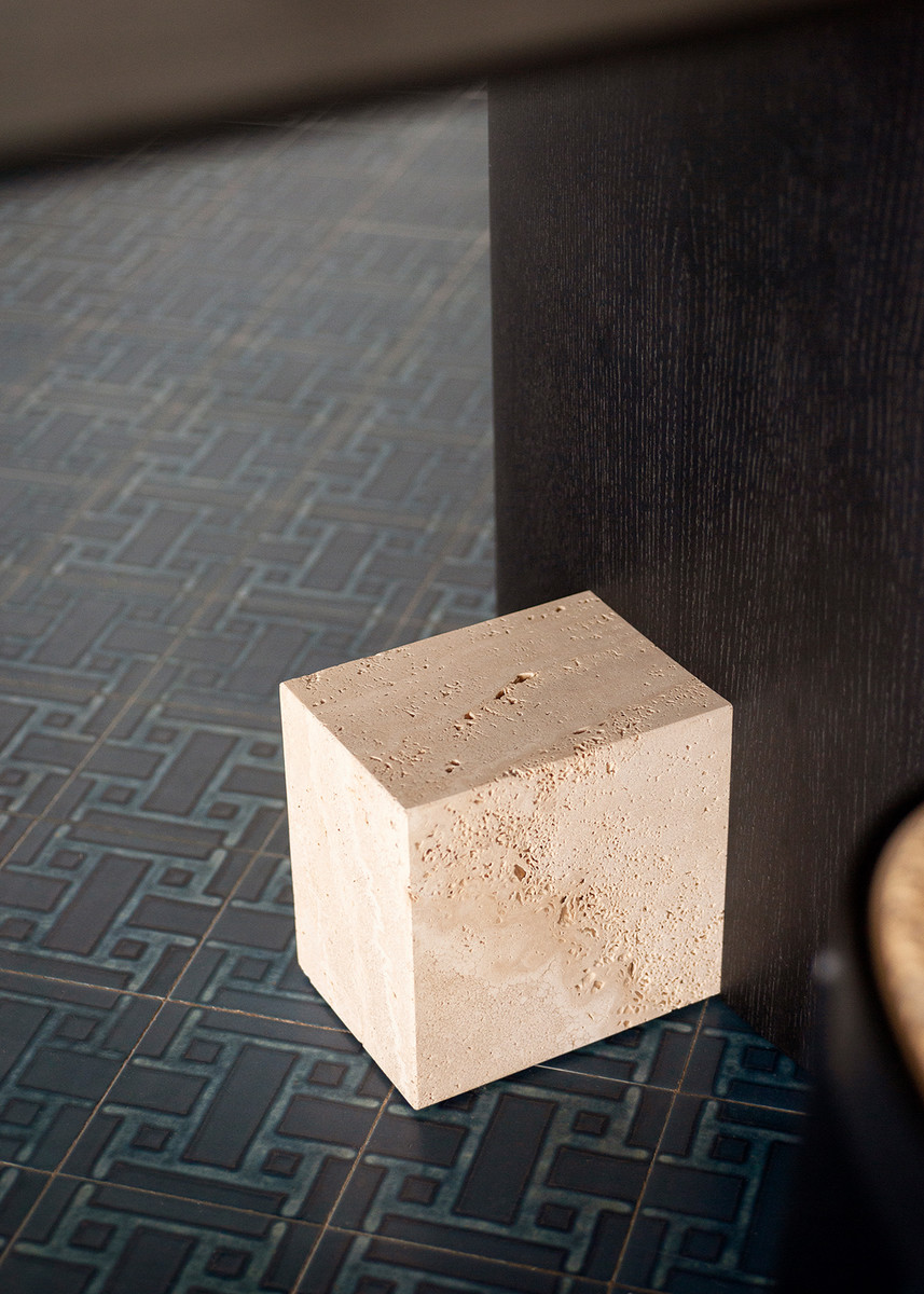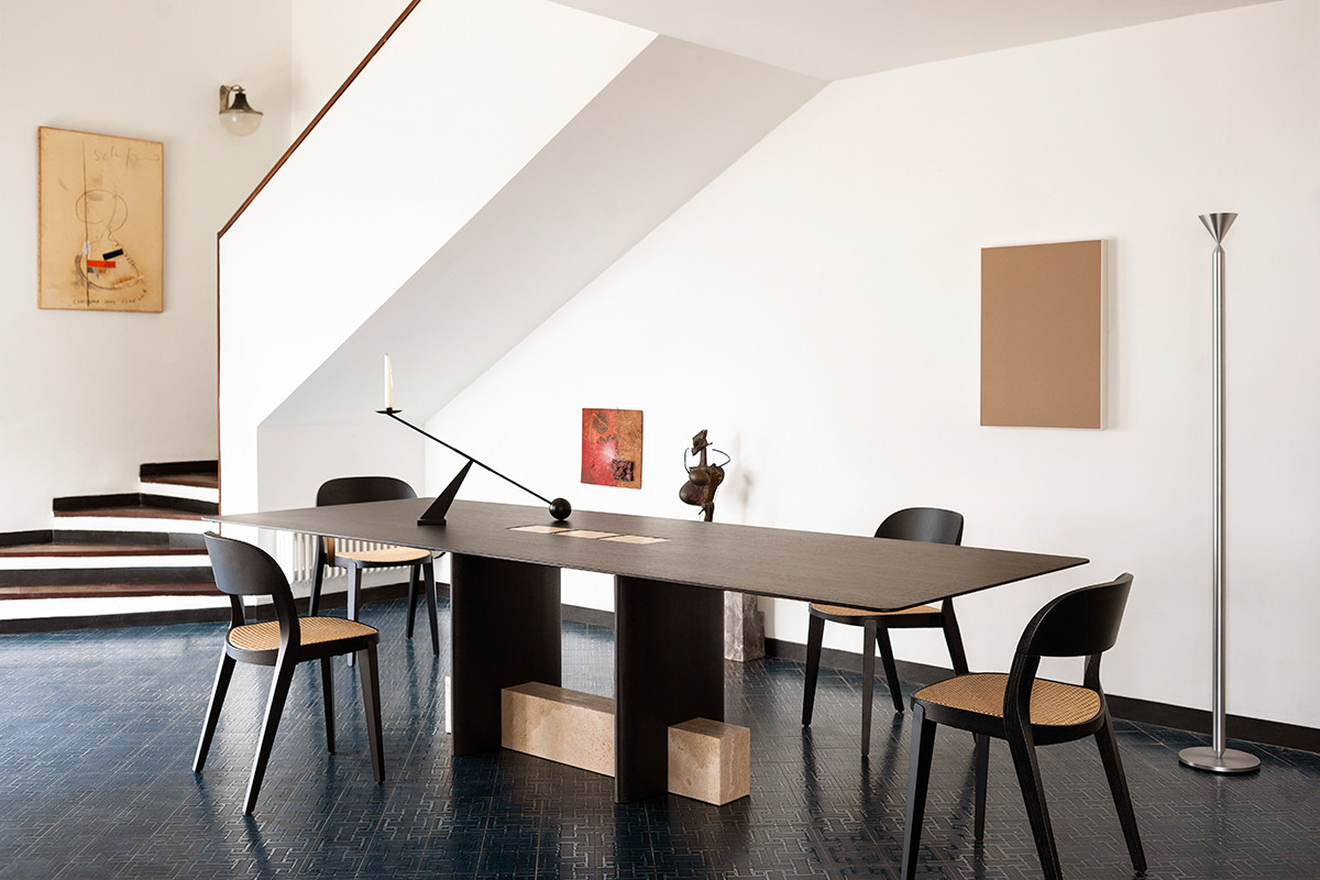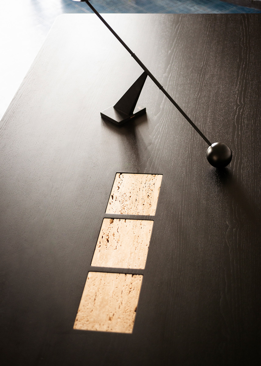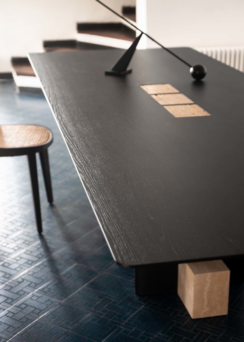 Обеденный стол Potocco Syn от Mario Ferrarini — модель с прямоугольной столешницей на скульптурном основании. Две деревянные колонны и каменный блок образуют опору. Столешница из мрамора с прожилками. Все углы плавно скруглены.