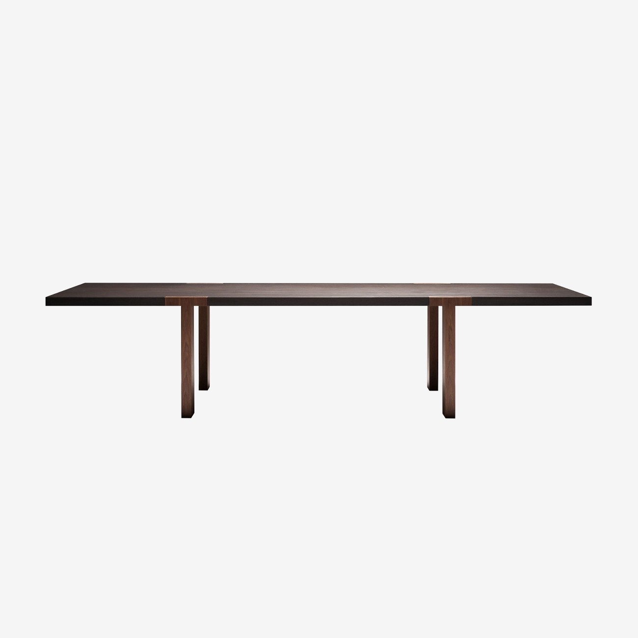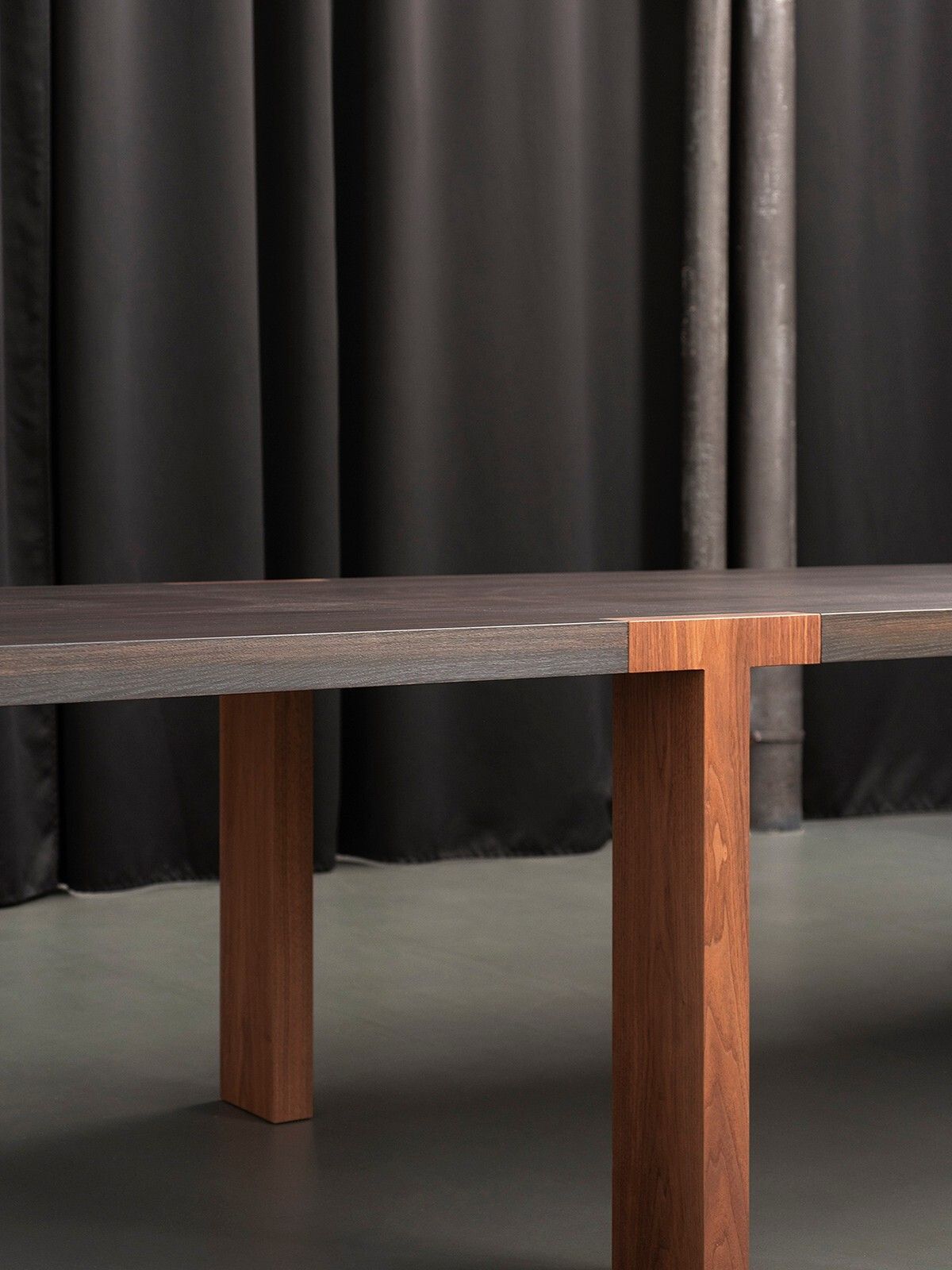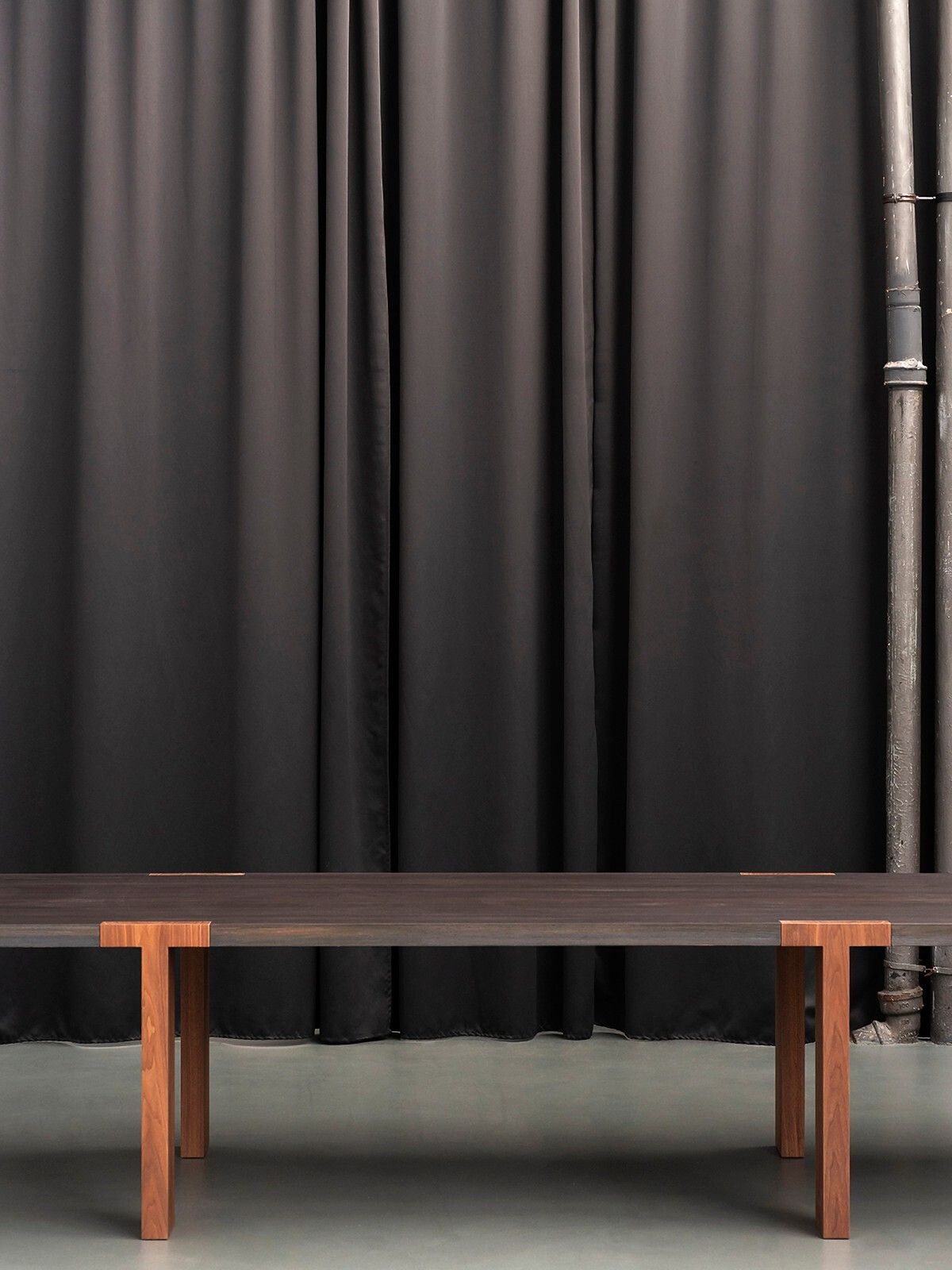Стол Tacchini T–Table от Tobia Scarpa — модель с удлинённой столешницей и угловыми ножками. Соединения элементов открытые, с видимыми креплениями. Края столешницы выступают за границы основания. Простота форм и акцент на конструктивных элементах.