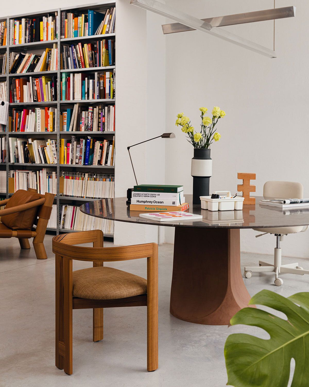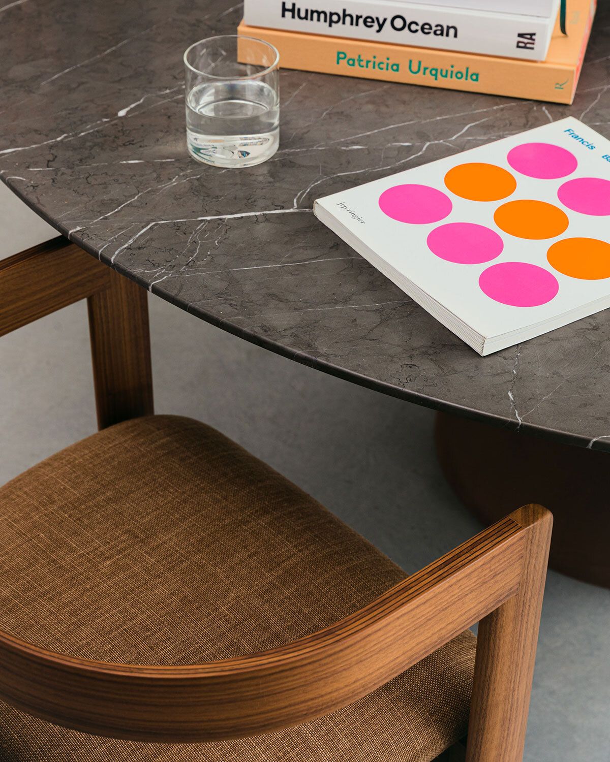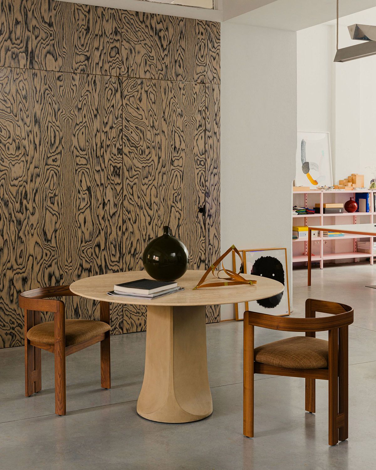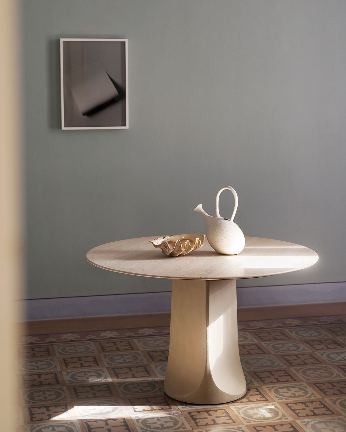 Стол Tacchini Togrul от Gordon Guillaumier — круглая столешница с ровными краями на массивном основании. Ножка расширяется внизу, образуя плавный переход. Основание имеет форму чаши с мягкими изгибами.