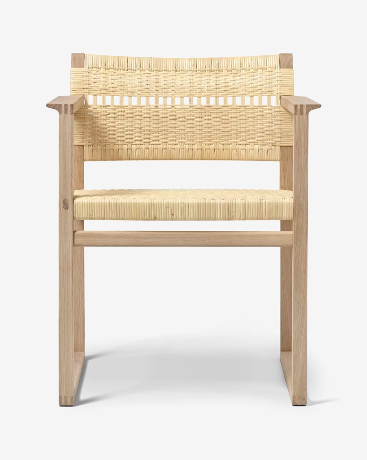 Кресло Fredericia BM62 Amrchair Cane Wicker отличается структурной конструкцией и детальностью исполнения. Сиденье и спинка, выполненные из тростникового плетения придают ему особенную мягкость и обеспечивают непосредственный комфорт посадки. Фигурные подлокотники вместе с объединенными в сплошной элемент ножками придают стулу особенную изящность.