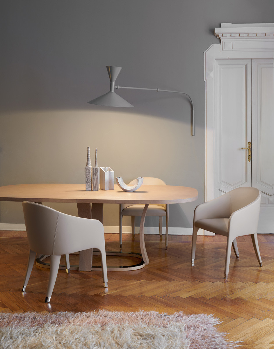 Обеденное кресло Potocco Miura от Enrico Franzolini e Cristian Malisan — полностью обитый вариант с обтекаемым силуэтом. Спинка овальной формы плавно соединяется с подлокотниками. Сиденье прямоугольное с мягким наполнителем. Ножки из бука с металлическими накладками.