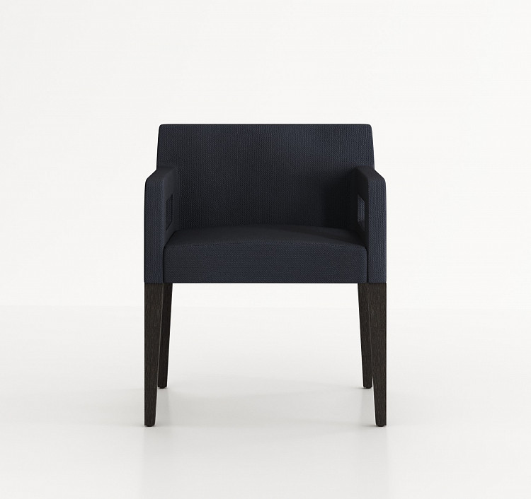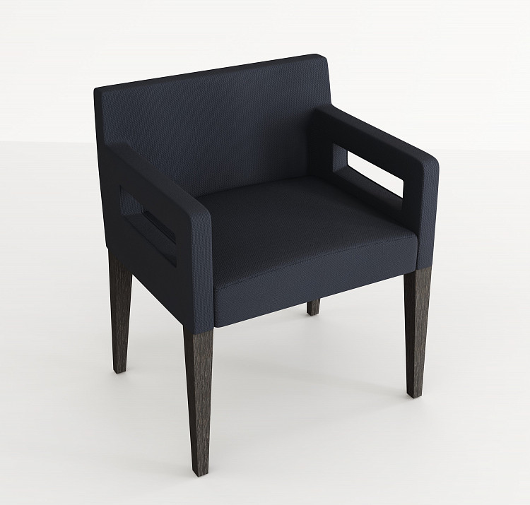 Кресло Modénature Pierre Chair напоминает архитектурный чертеж. Его подлокотники прорезаны крупными прямоугольными окнами, что облегчает массивную конструкцию. Этот прием добавляет воздушности строгой форме из тонких ножек и прямых линий. Сиденье, плотно вписанное в раму, завершает образ собранного и статусного предмета.