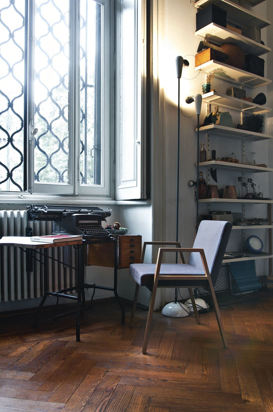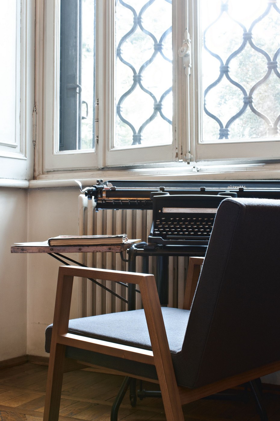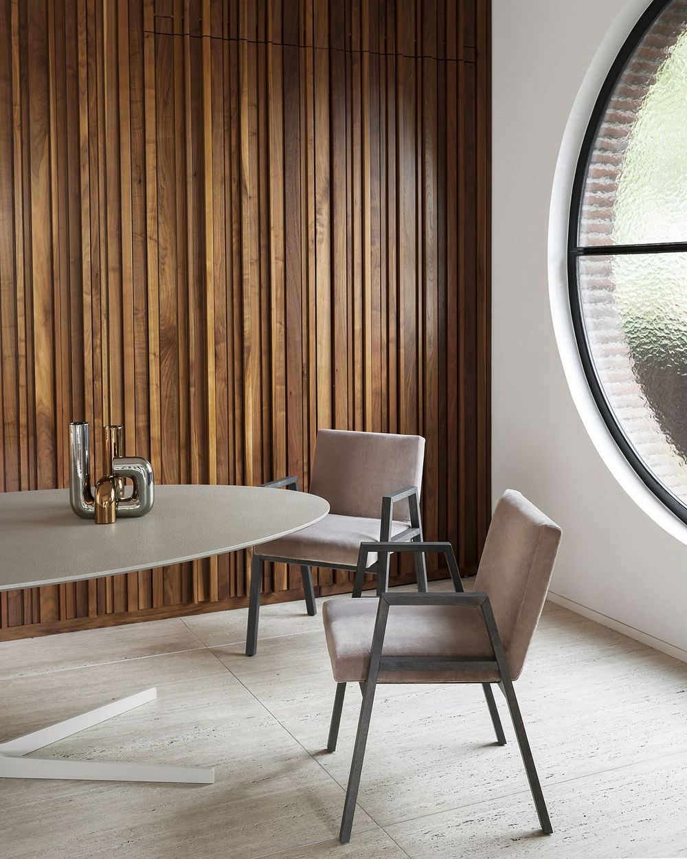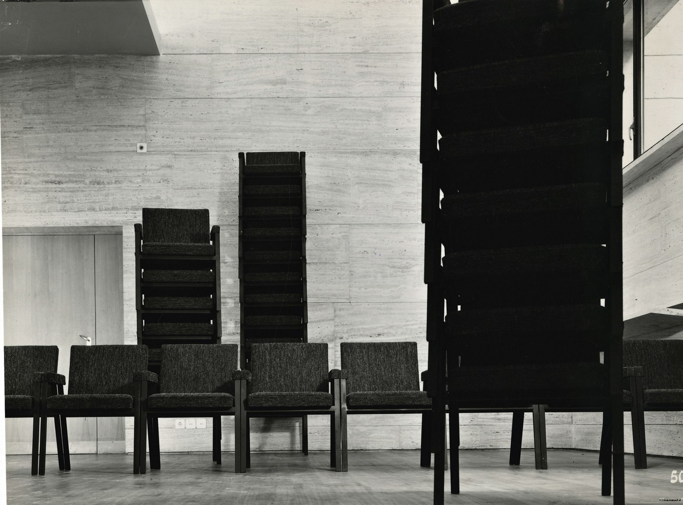 Стул Tacchini Babela от Achille & Pier Giacomo Castiglioni с монолитной структурой: ножки и подлокотники представляют единый элемент. Спинка повторяет прямоугольные очертания сиденья, выступающего за границы рамы.