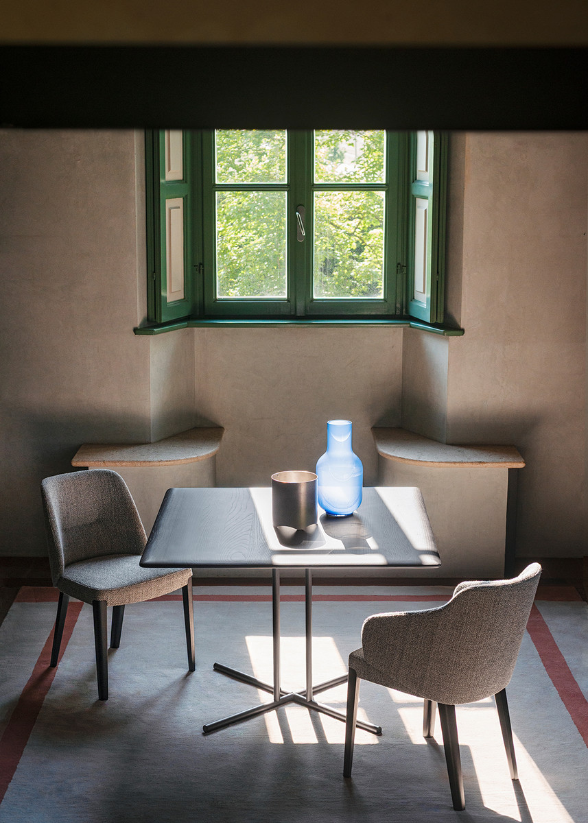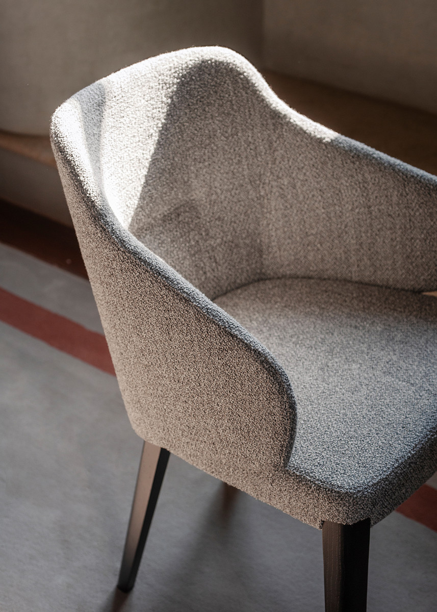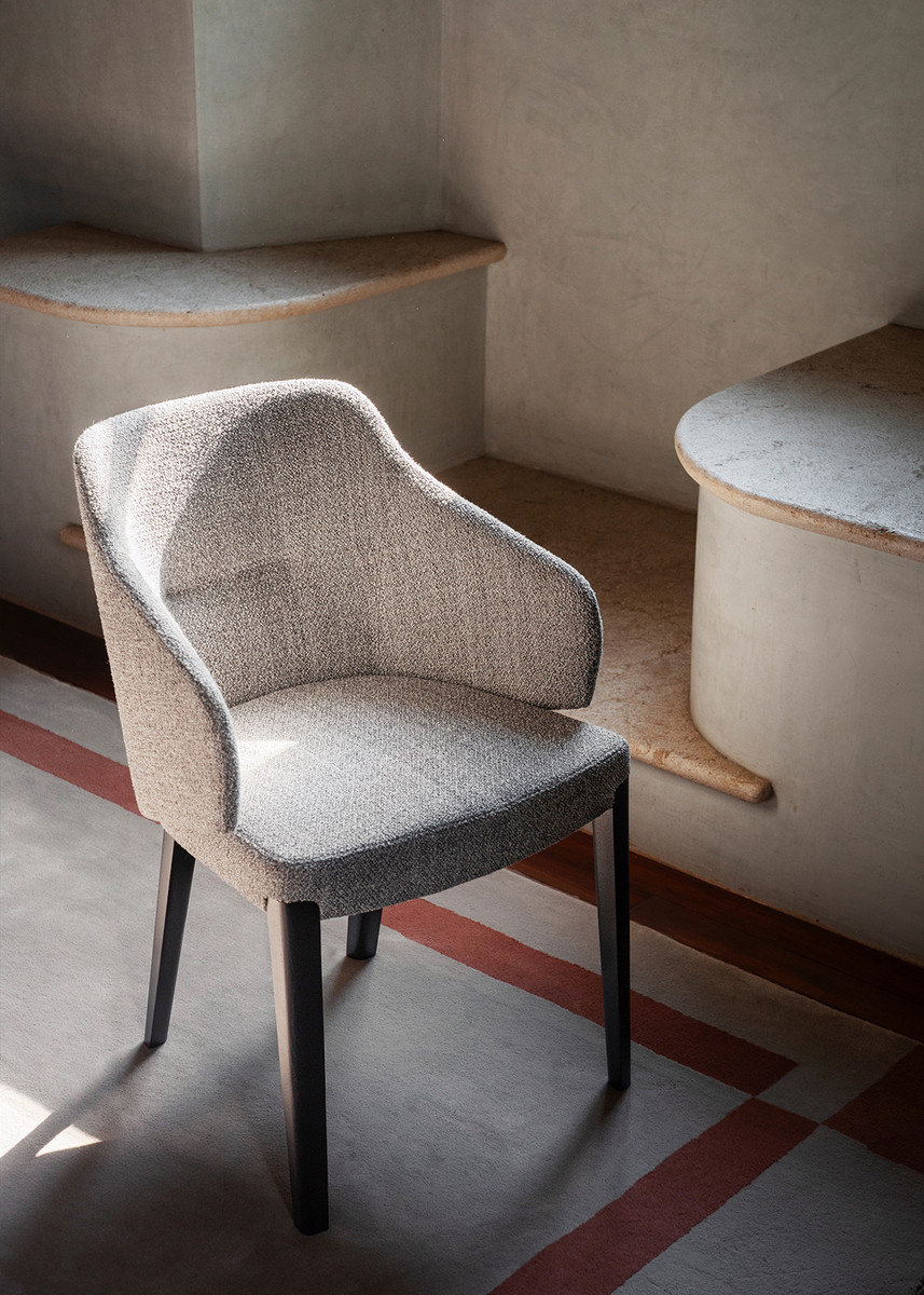 Стул Potocco Concha от Stephan Veit — модель с эргономичной спинкой, повторяющей изгиб тела. Горизонтальное углубление в центре спинки. Деревянные ножки создают контраст с обивкой. Модель отличается максимальной универсальностью, доступны версии с подлокотниками и без.