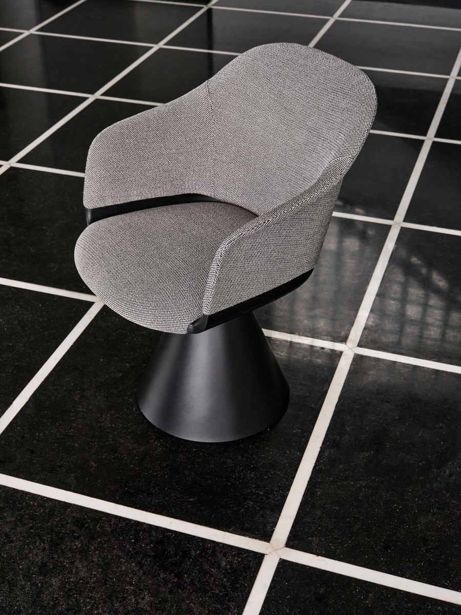 Обивка: текстиль или кожа по карте отделок фабрики. Наполнитель: огнестойкий пенополиуретан. Каркас: массив ясеня. Варианты ножек: металлические (конические, поворотные) или деревянные четырехножевые.