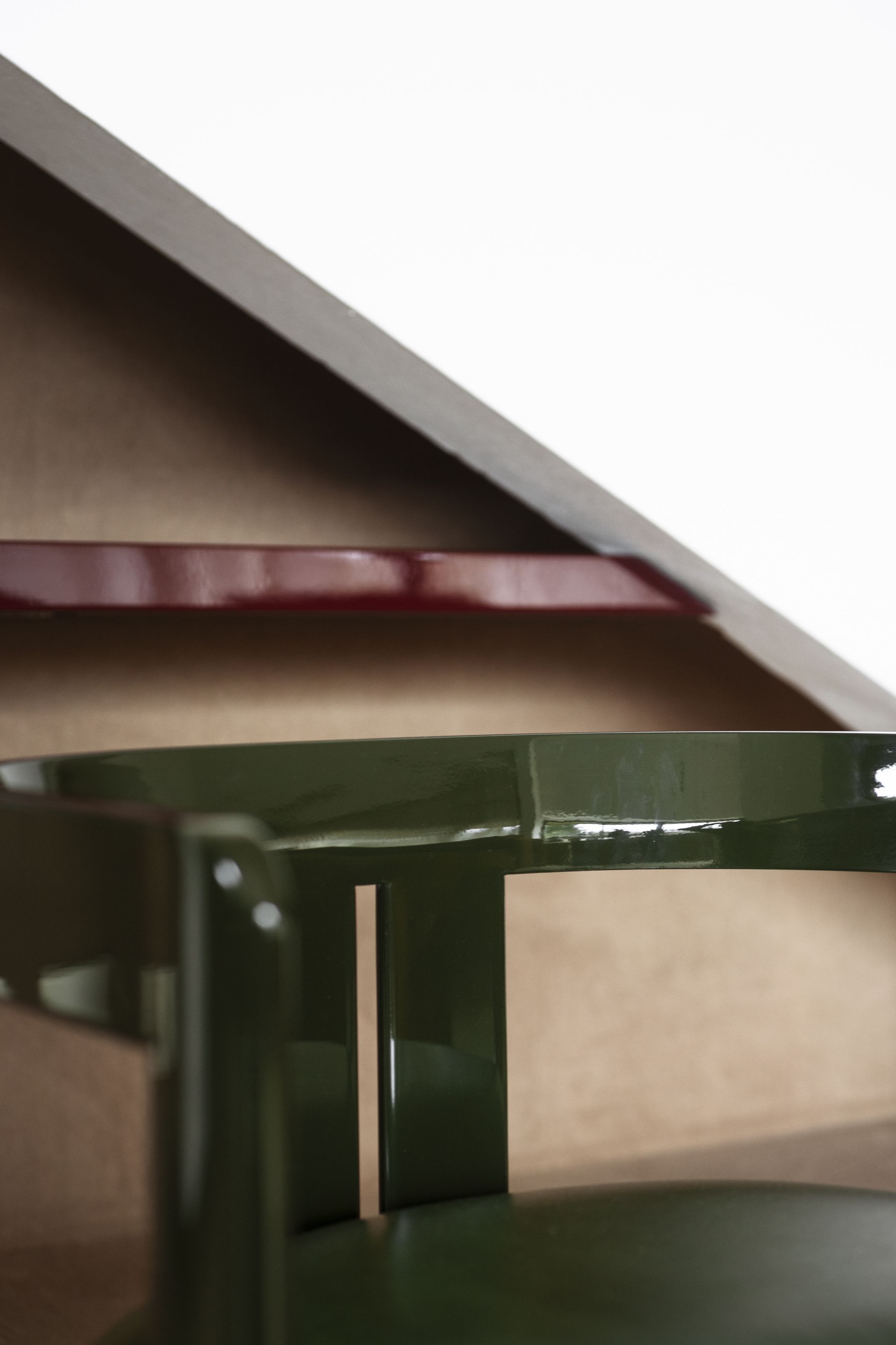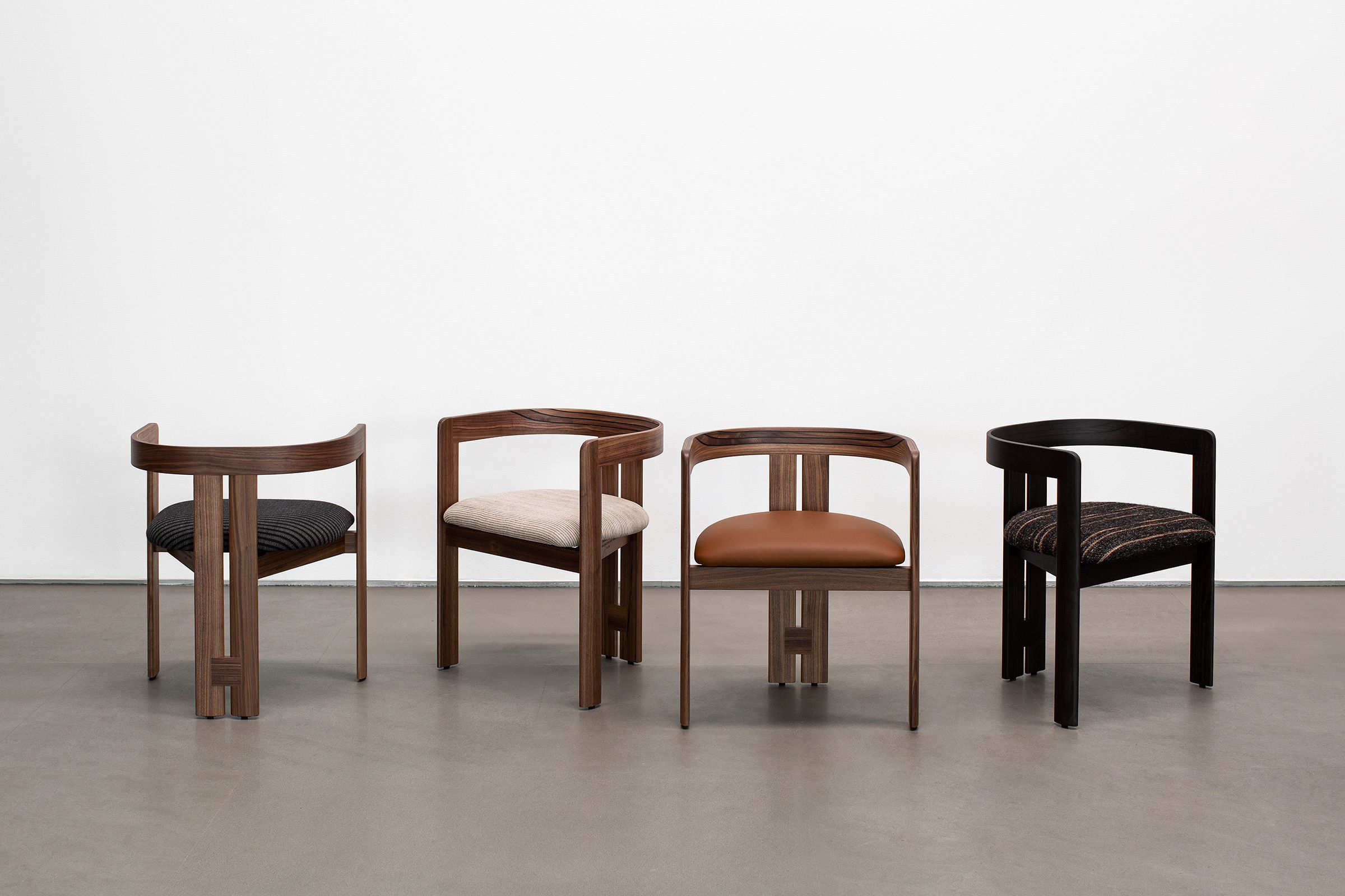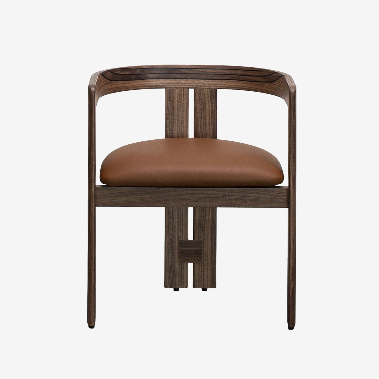 Стул Tacchini Pigreco от Tobia Scarpa с каркасом из изогнутых деревянных деталей. Полукруглая спинка плавно переходит в боковые части. Прямоугольное сиденье встроено в раму. Прямые ножки с перемычками на уровне сиденья.
