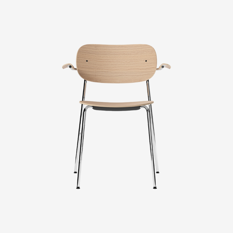 Стул с подлокотником без обивки Menu Co Dining Chair, with armrest, Chrome подходит к широкому спектру стилей интерьера и потребностей. Универсальность дизайна является результатом продуманной конструкции. Стулья штабелируемые (их можно складывать в стопки для удобного хранения). Предмет интерьера имеет основание из хромированной стали с изогнутым сиденьем, а также спинку и подлокотники из шпона натурального дуба.