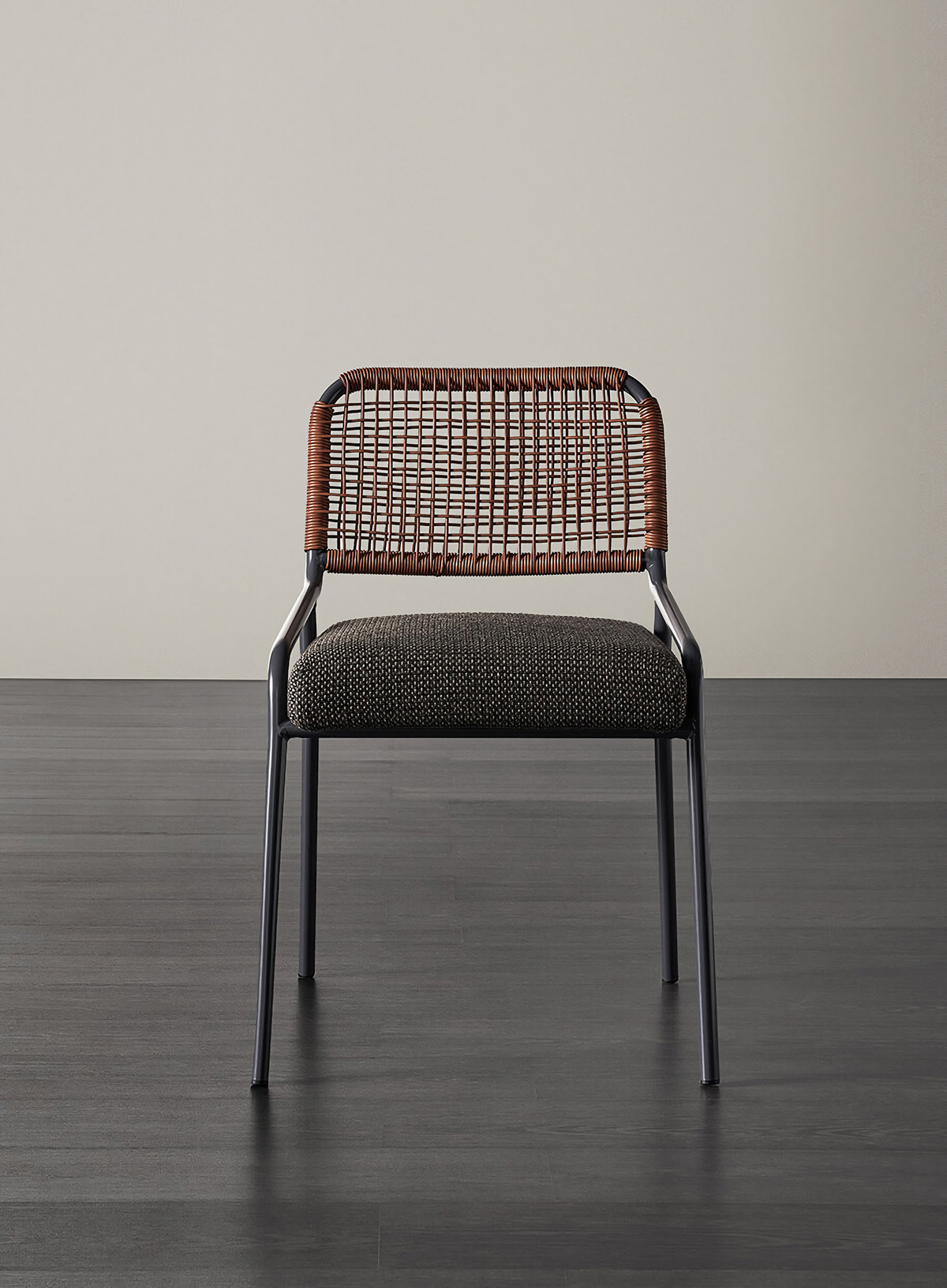Стул Meridiani Tai — это результат сочетания совершенно разных по фактуре материалов. Строгий металлический каркас уравновешивается мягким сиденьем. Спинка из плетёного каната не только обеспечивает удобство, но и делает стул броской деталью интерьера.