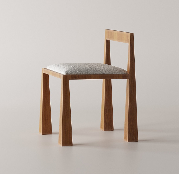 Стул Modénature Taki Chair от Olga Silanteva. Образ навеян традиционной крестьянской мебелью и работами русского архитектора Ивана Фомина. Широкие трапециевидные ножки формируют устойчивое основание. Тонкое сиденье утоплено в массивный каркас. Низкая спинка-планка соединяет задние стойки. Все линии прямые, углы четкие.