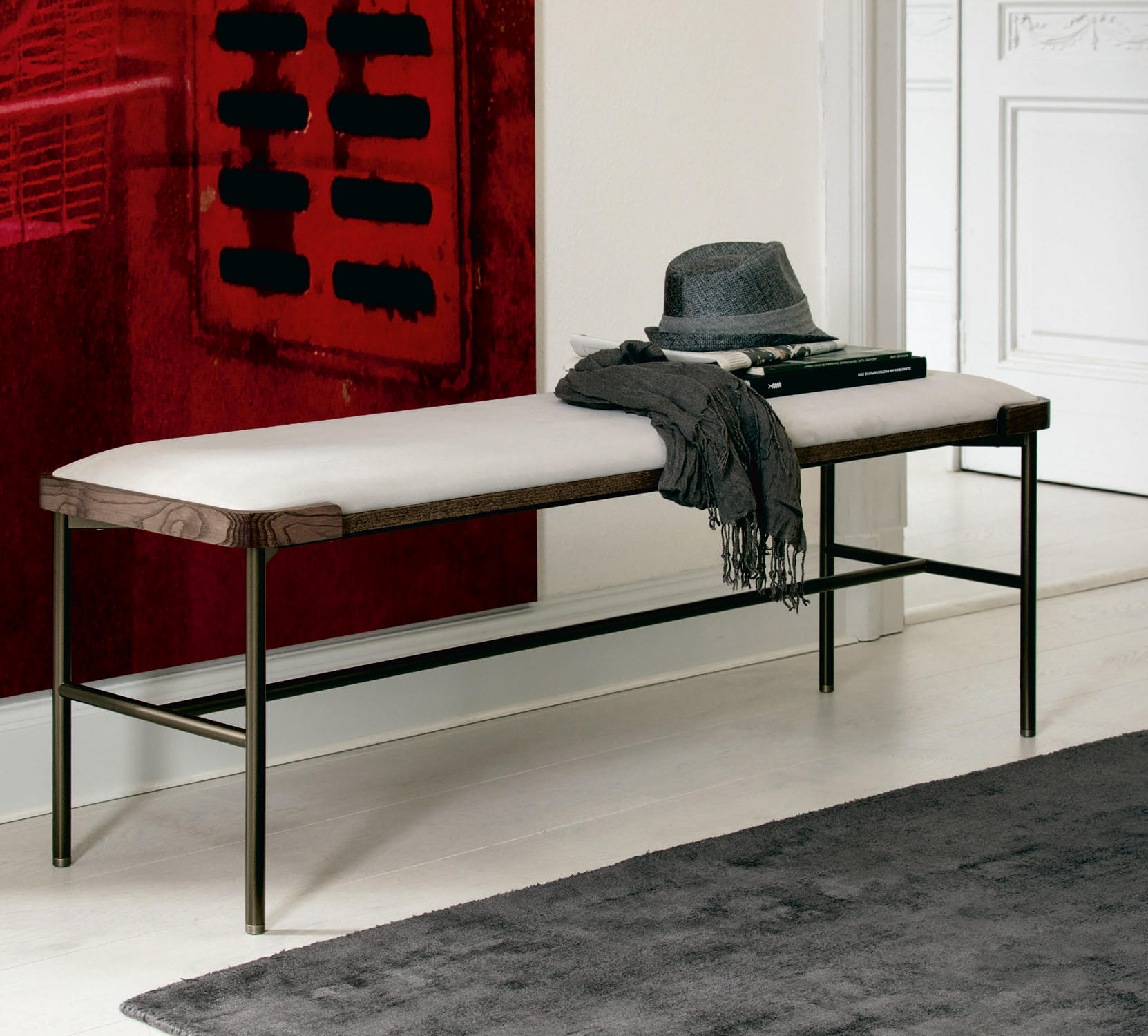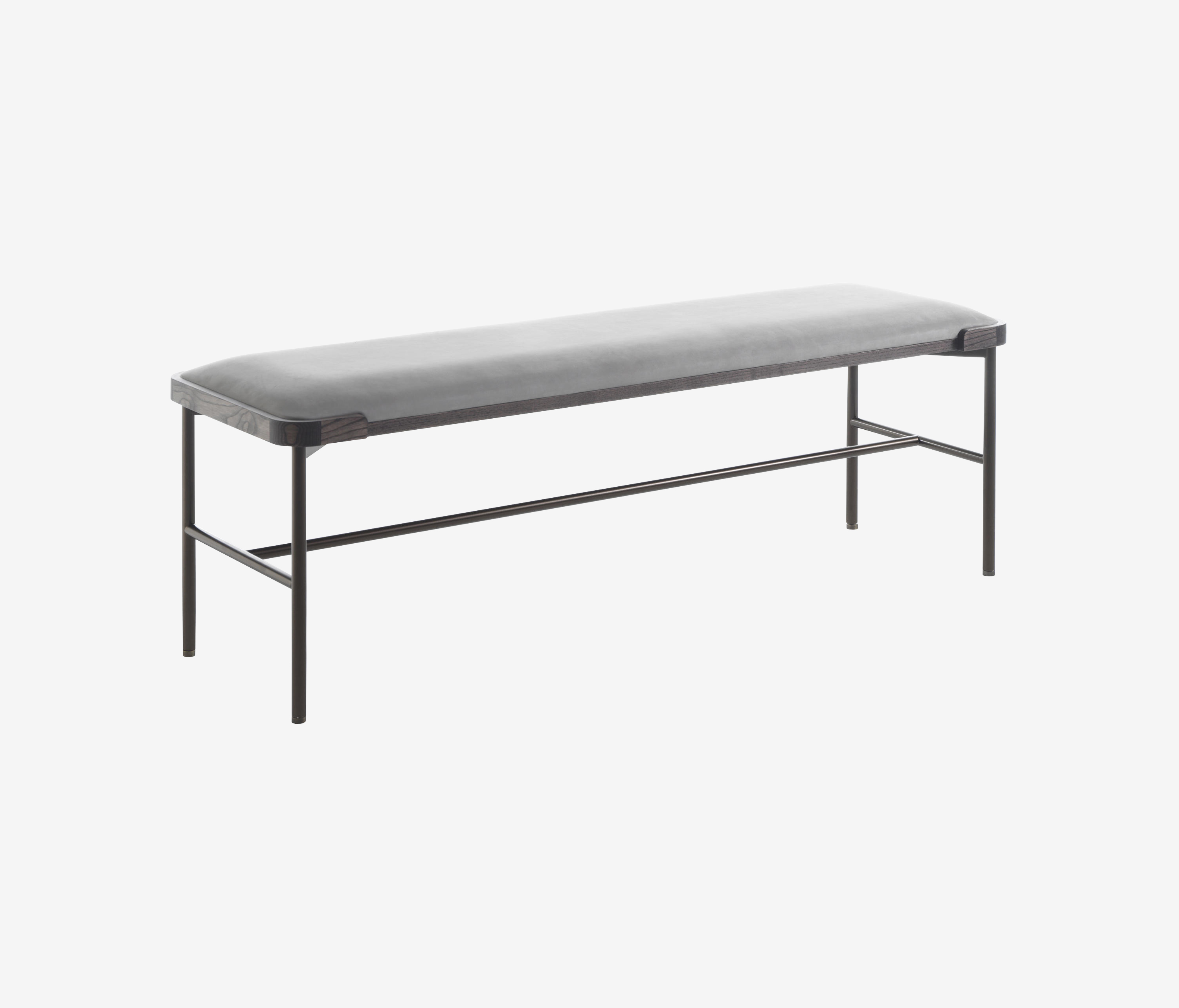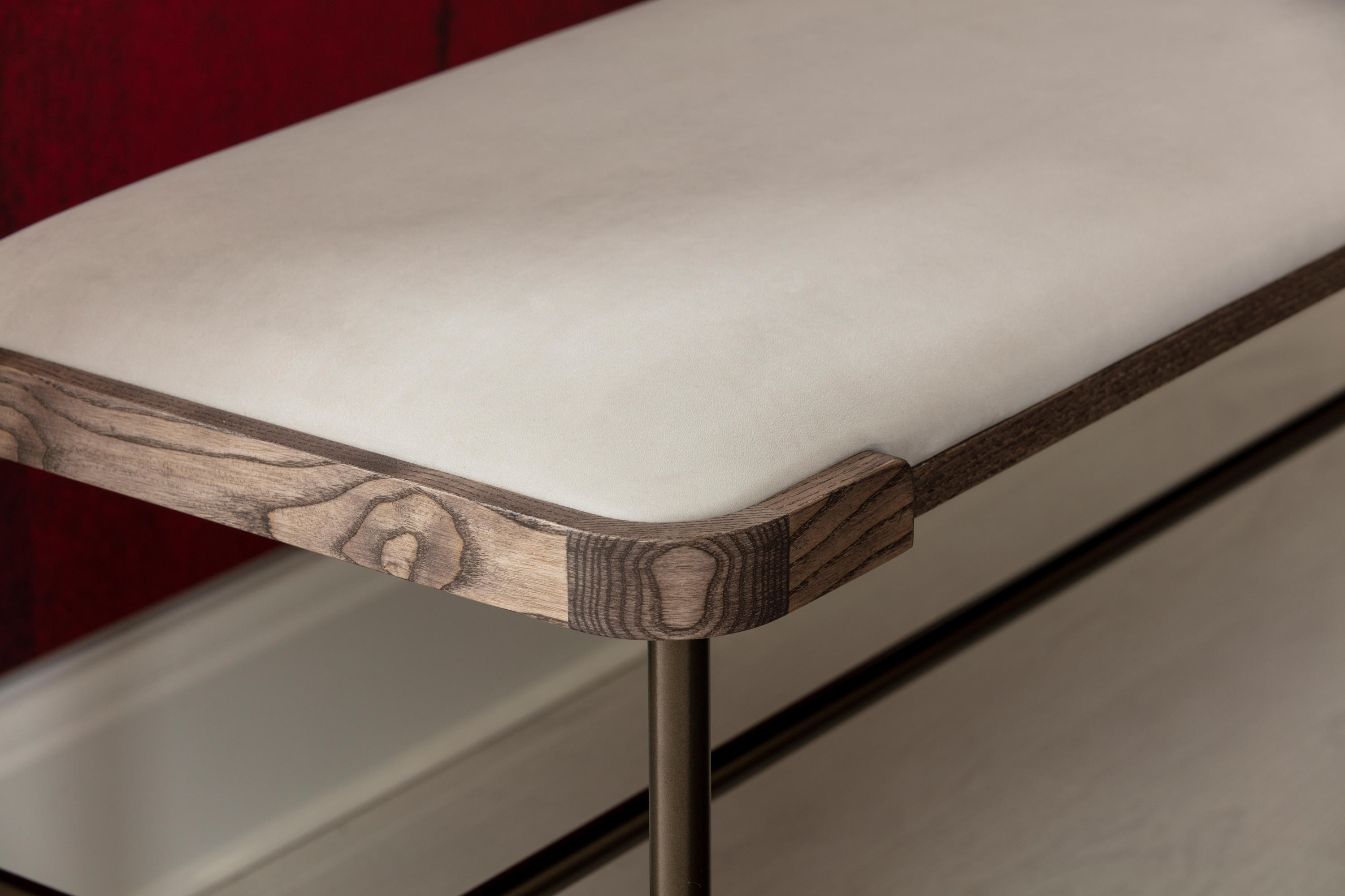 Ножки банкетки Porada Astol изготовлены из металла, каркас выполнен из дерева (возможно дополнительное покрытие матовым лаком). Обивка сиденья — кожа и текстиль.