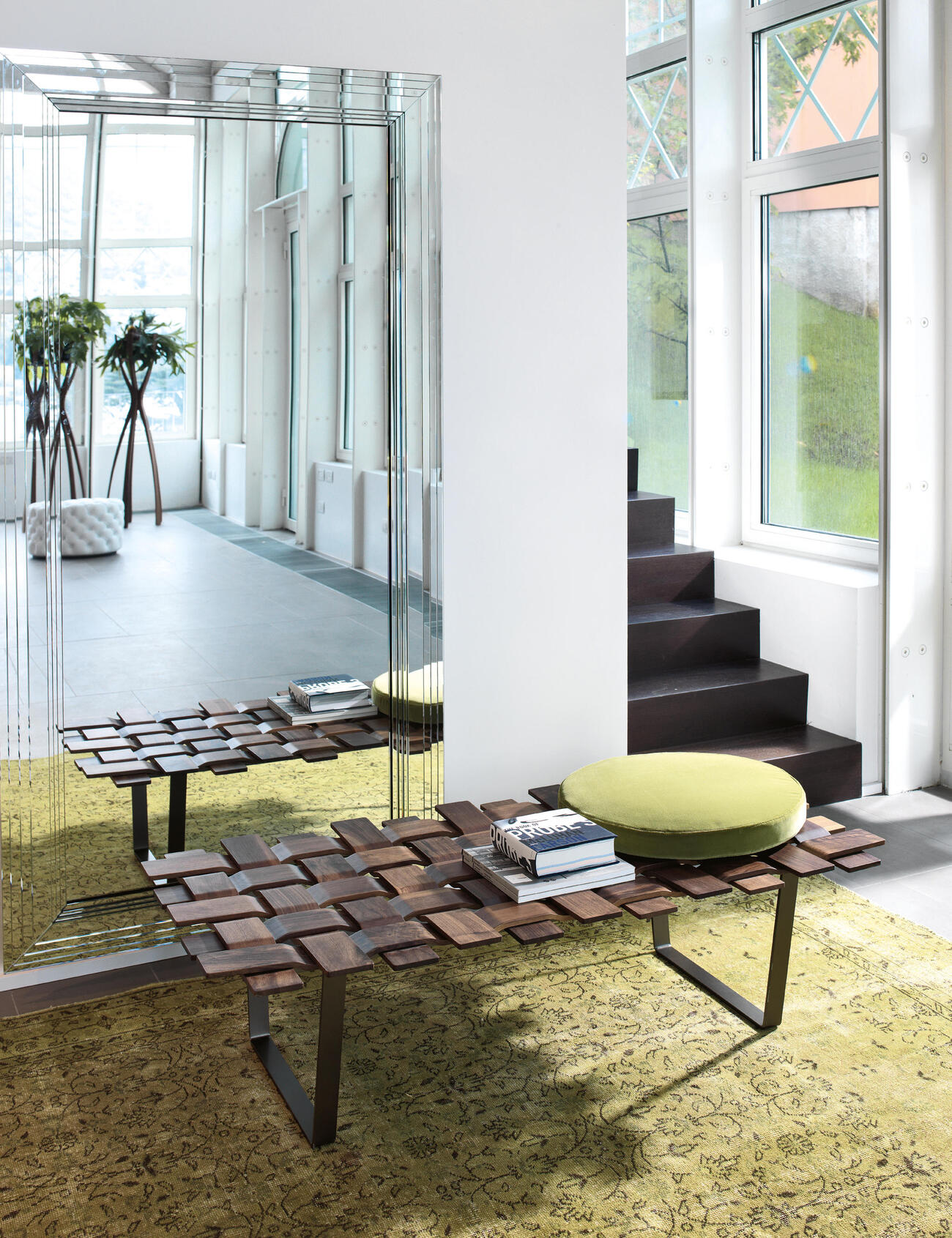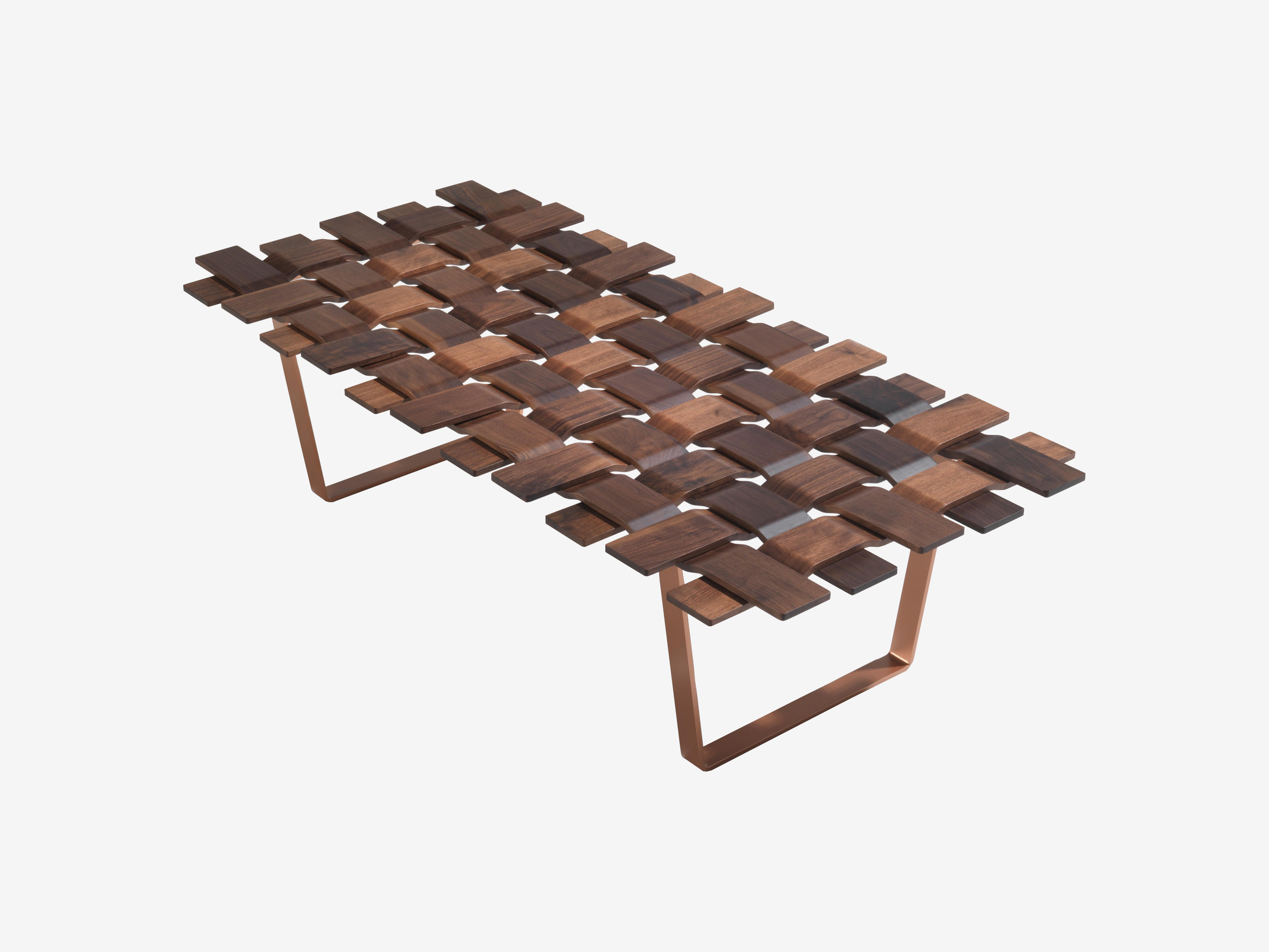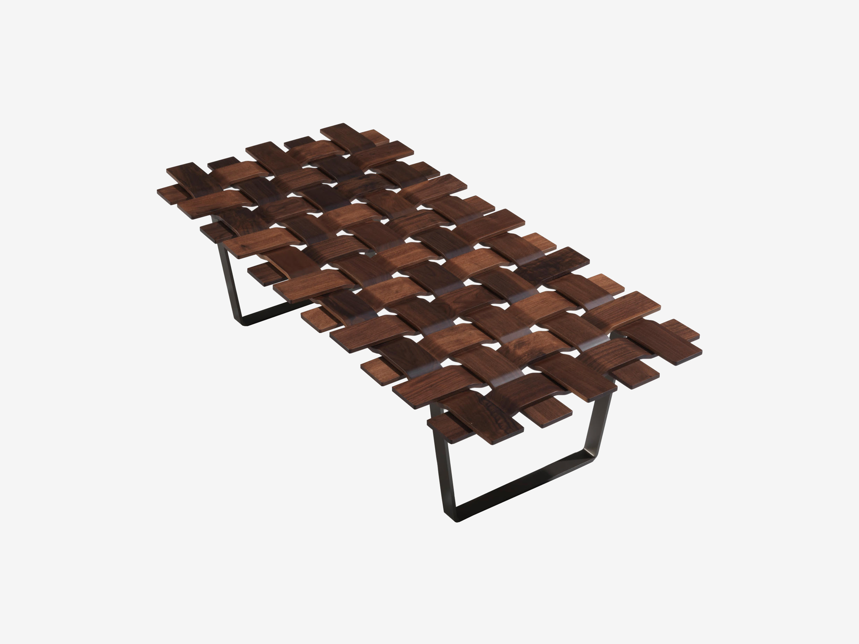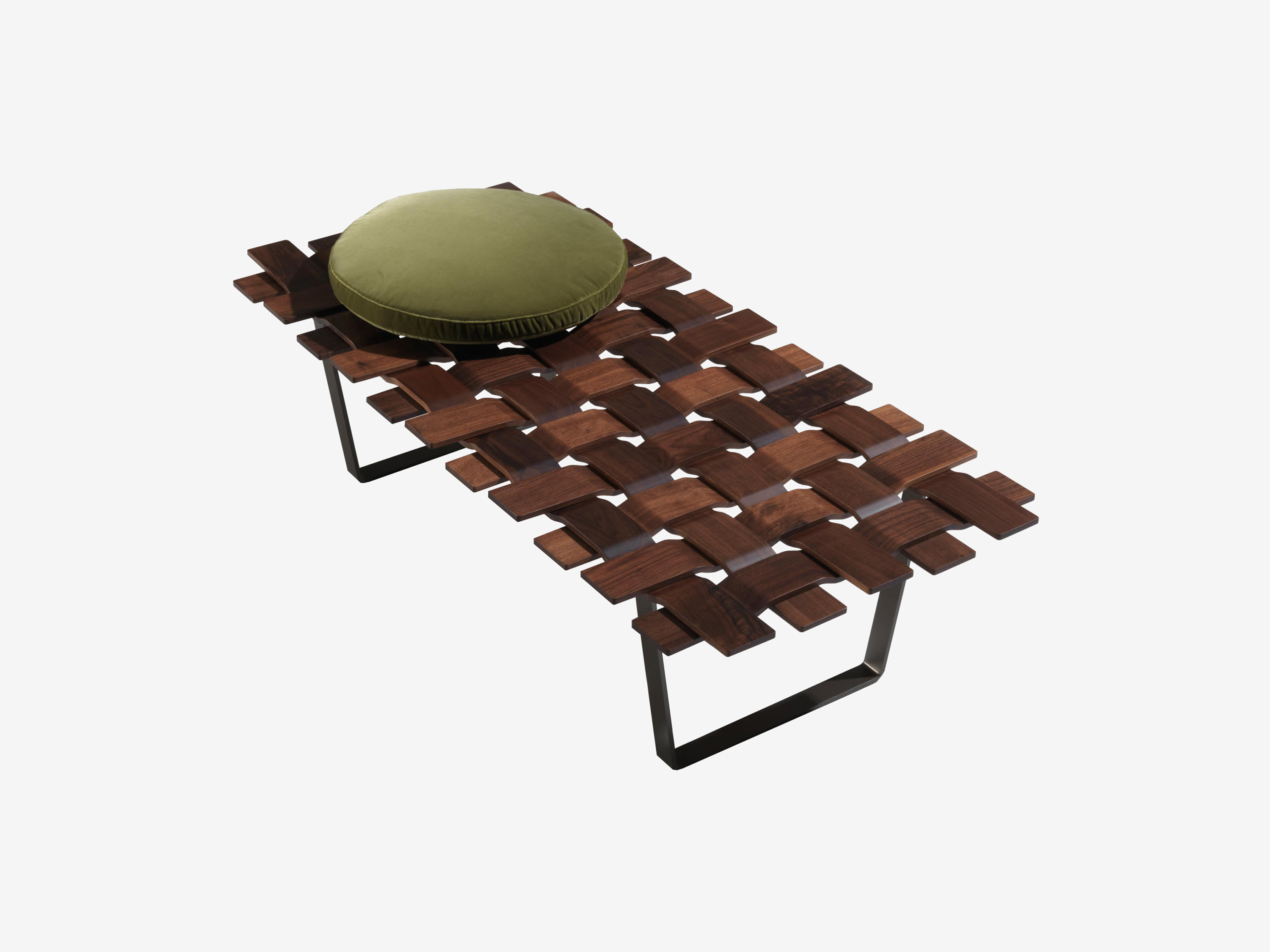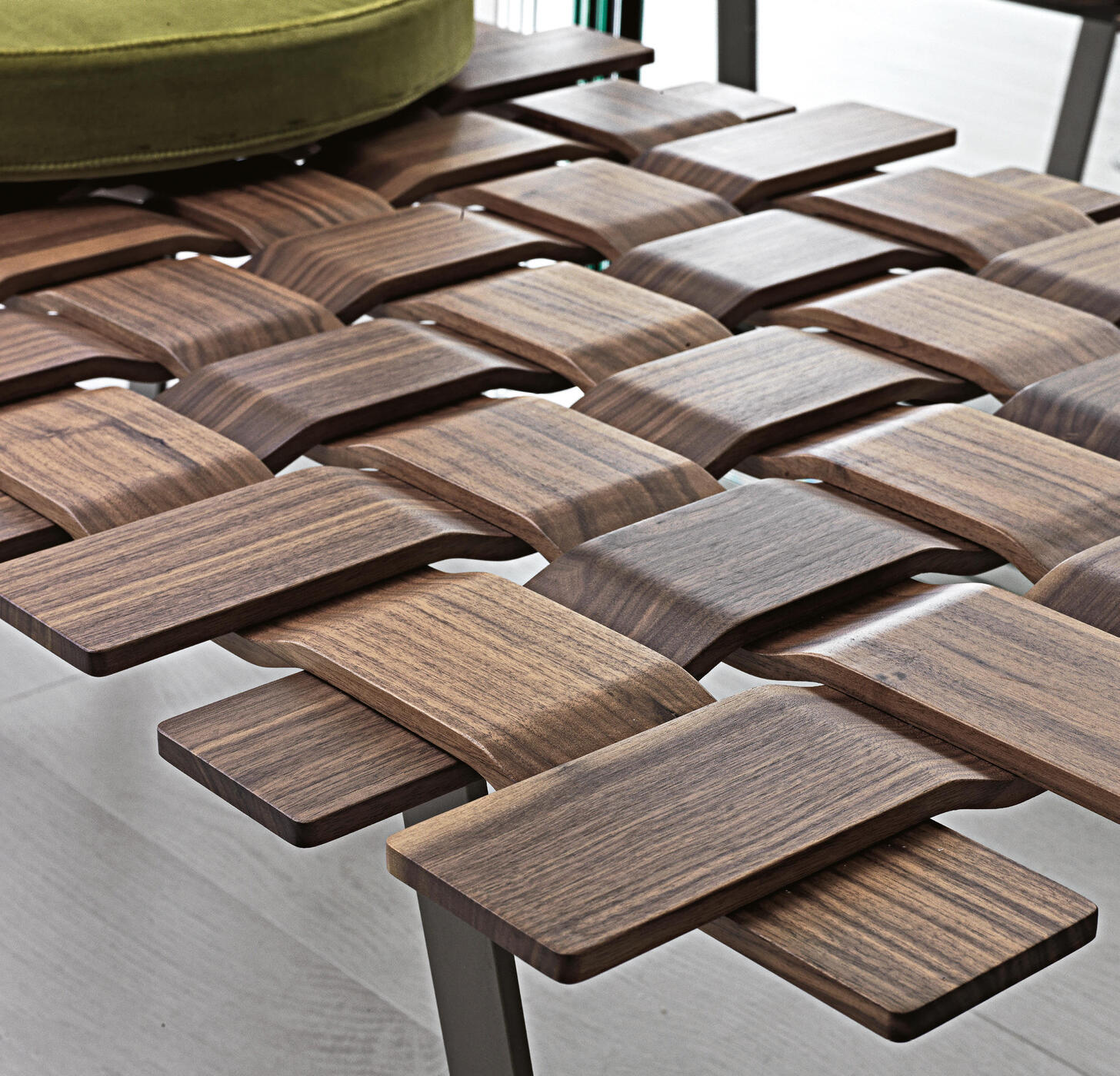 Дизайн банкетки Porada Belt — образец высокого мастерства фабрики. Поверхность предмета, имитирующая сложное плетение, выполнена из массива ореха с использованием современных процессов производства. Прочное металлическое основание надёжно удерживает банкетку и добавляет ей элегантности.