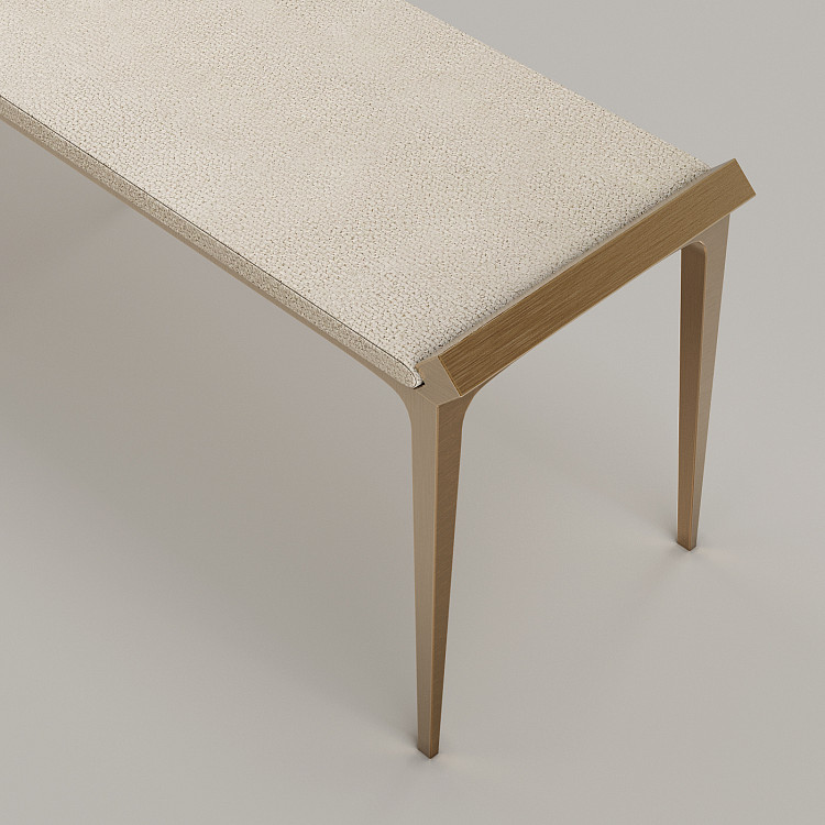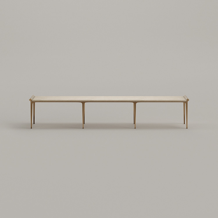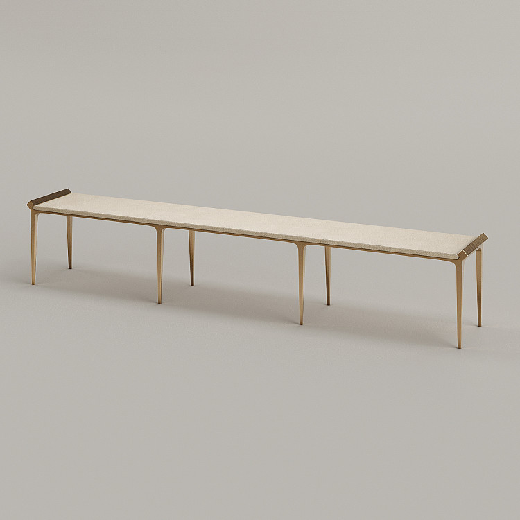Банкетка Modénature Diamant Grand Bench от Ivan Basov является самой крупной в коллекции Diamant. Ее длина составляет 2 метра 54 сантиметра, а нестандартную высоту модели обеспечивают восемь длинных ножек очень тонкого сечения. Они поддерживают раму, края которой выделены невысокими бортиками. Внутри образованного ею прямоугольника расположено длинное строгое сиденье.